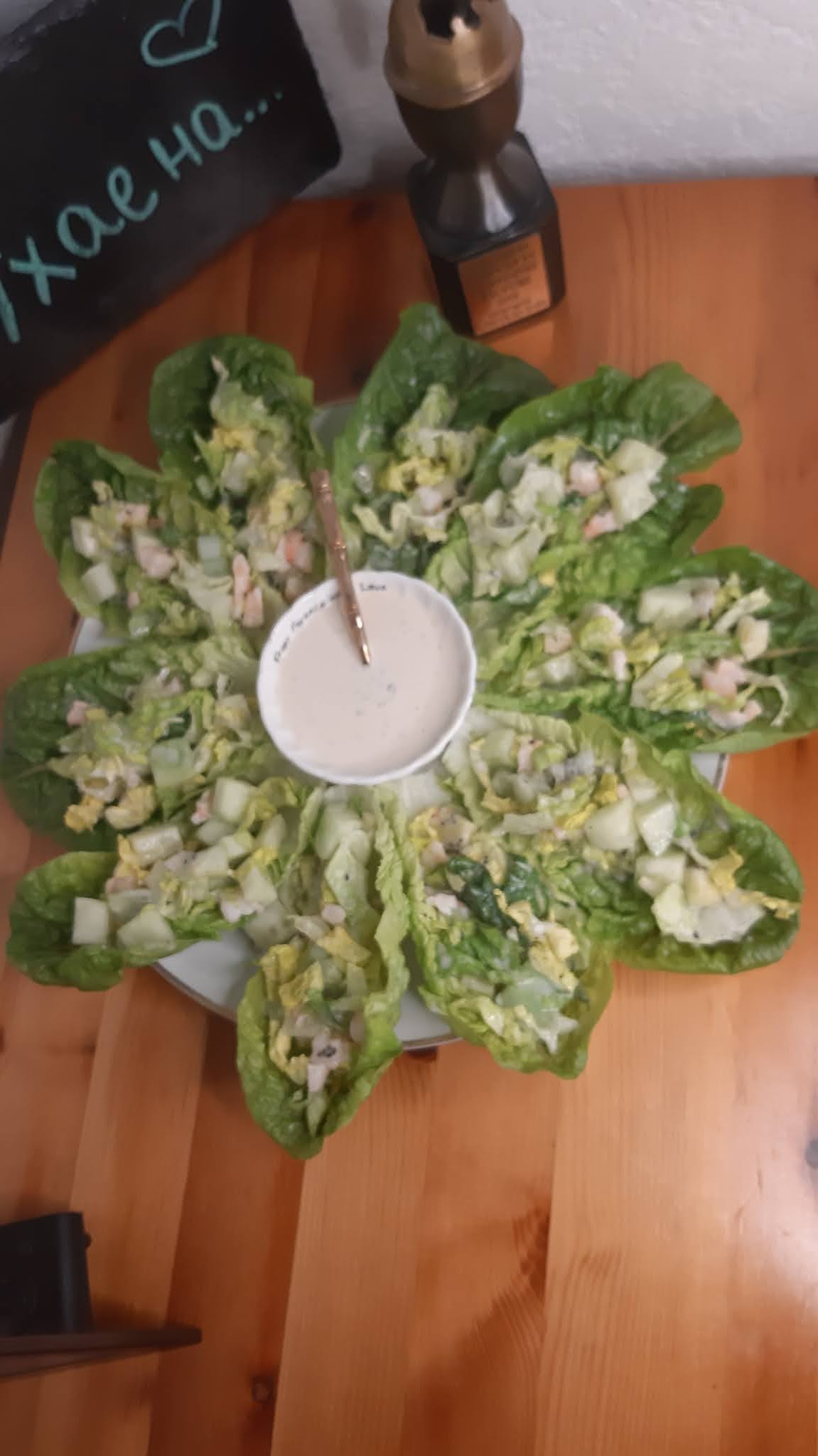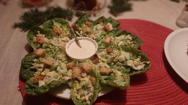 - От салатките отделям 10 листа и ги подреждам в чинията за сервиране.