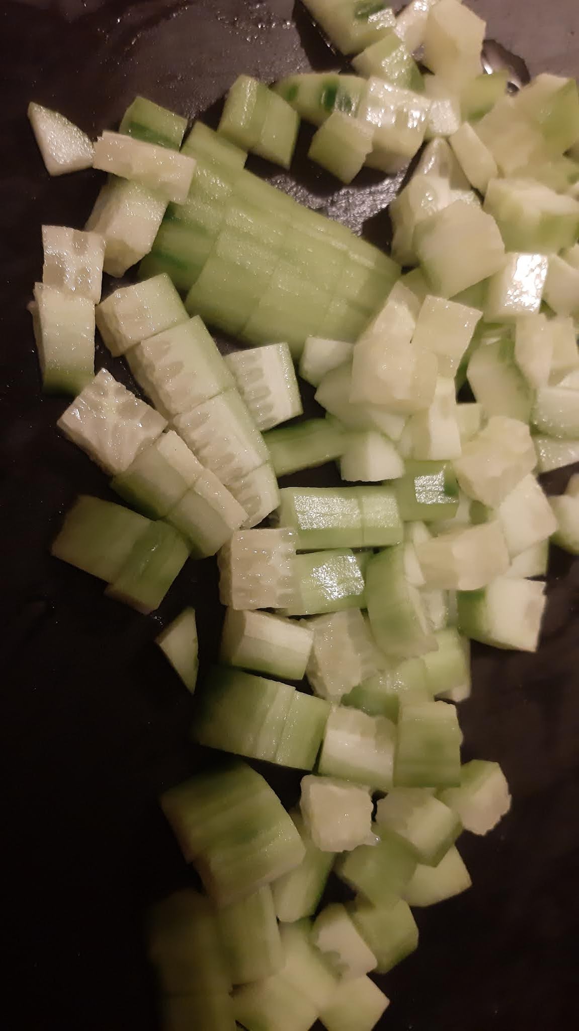 - Краставицата обелвам и нарязвам на кубчета с размер 1 см.