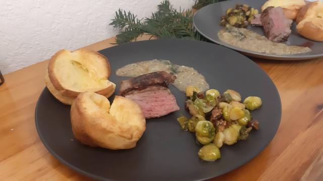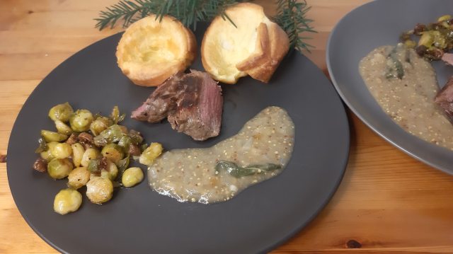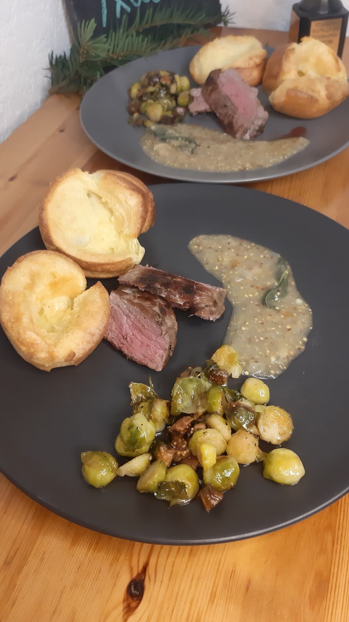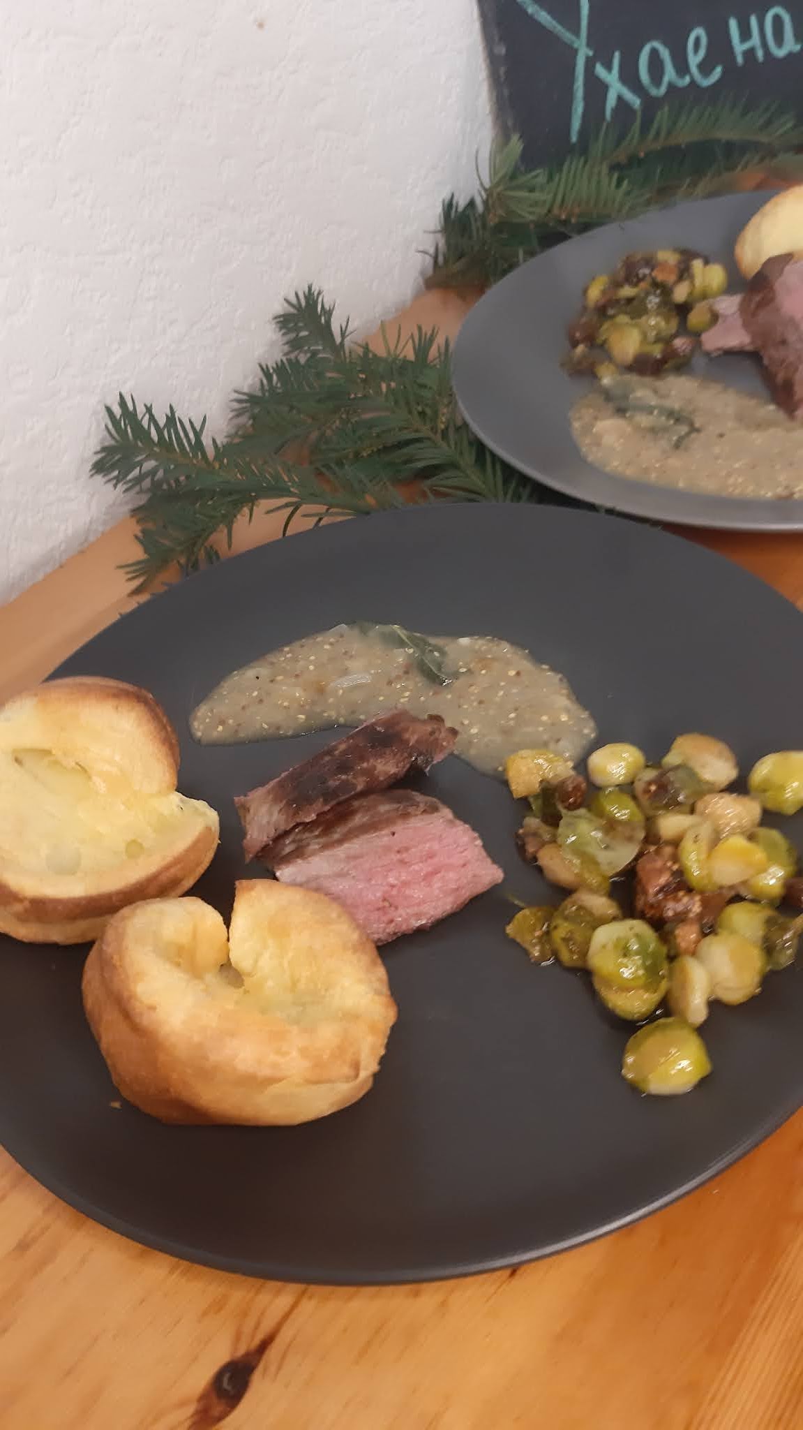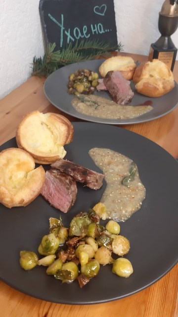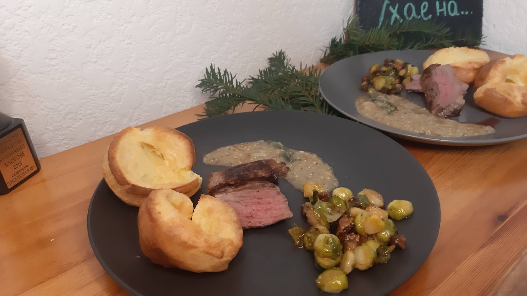 Невероятната хармония от сочен Entrecôte (говеждо месо от междуребрието, известно и като Rib-Eye Steak), йоркширски пудинг, ароматно брюкселско зеле със сушени смокини и един кремообразен сос от зърнеста горчица и листа от салвия.