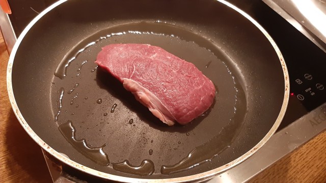• После сложих стека и пържих на силен котлон по 3 минути от всяка страна, като след обръщането на стека посолявах и овкусявах с черен пипер.