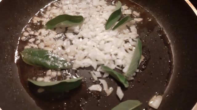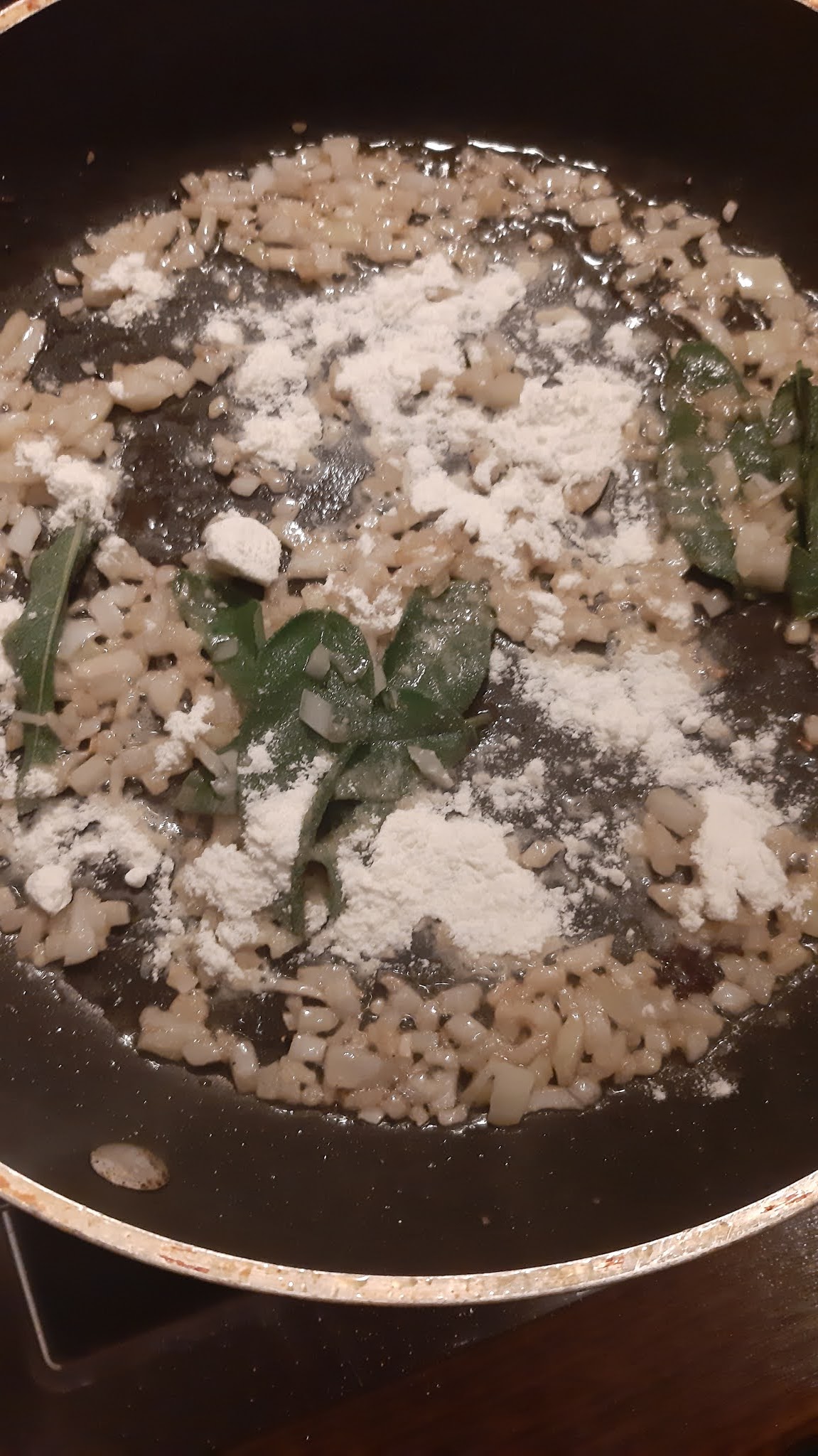 • В тигана от месото добавям още малко мазнина и запържвам нарязания на ситно кромид лук до омекване, заедно с листата салвия. Котлонът е на средна мощност, за да не изгори лукът.