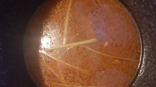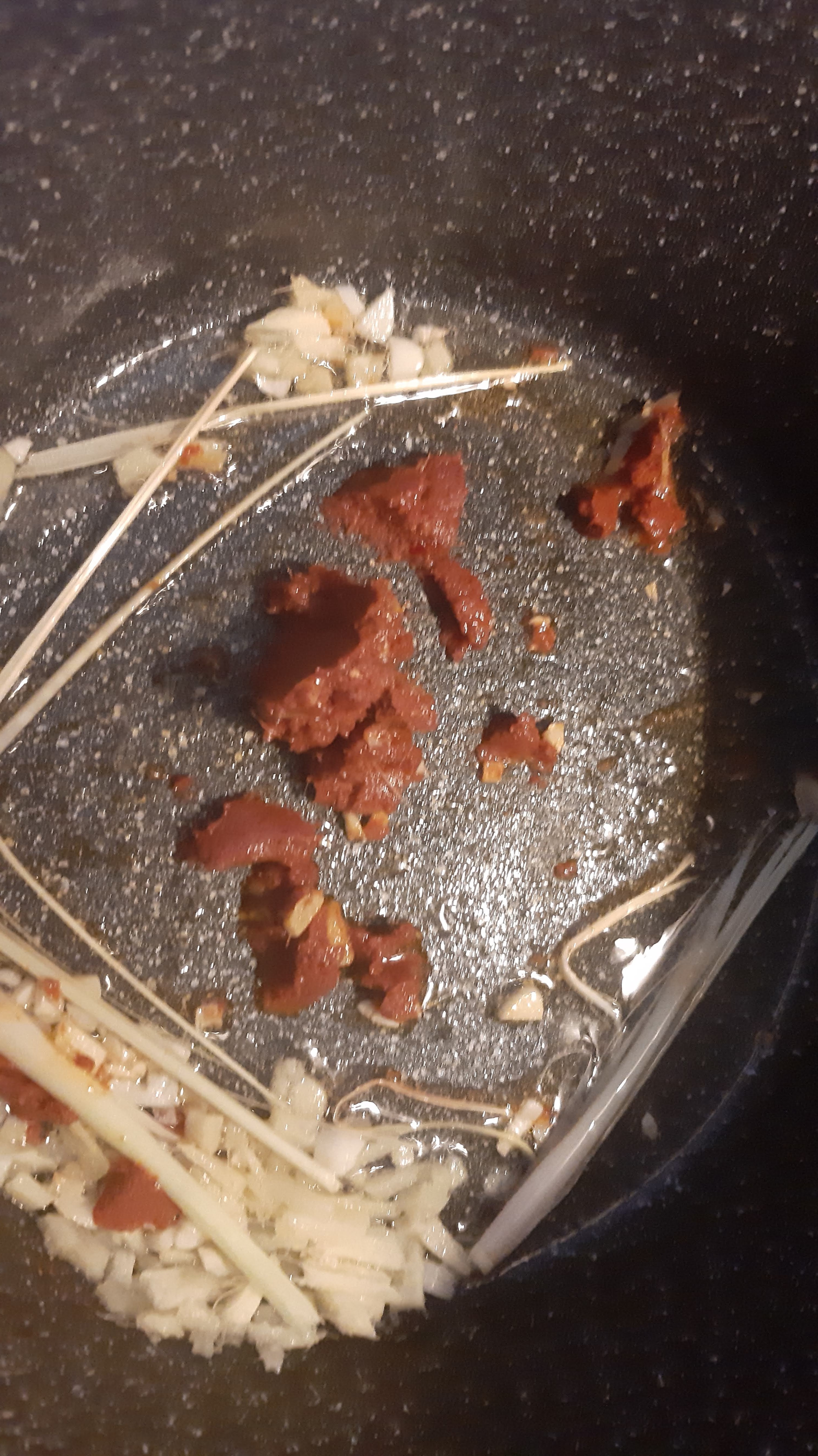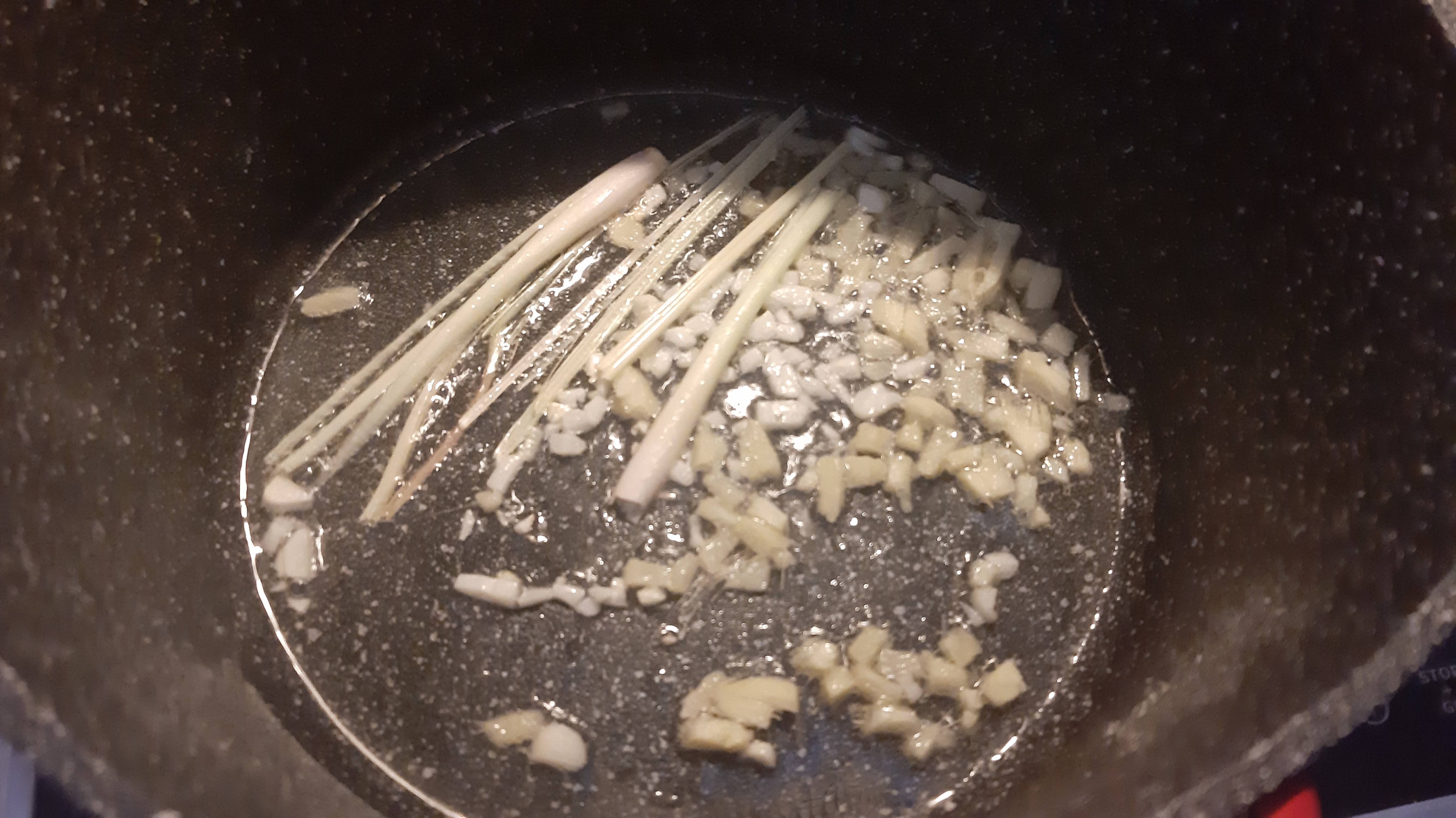 - В дълбока тенджера загрявам олиото и в него запържвам нарязанаите на много ситно джинджифил и чесън, а лимонената трева просто я разполовявам или на повече парчета. Важното е да може да бъде после извадена.