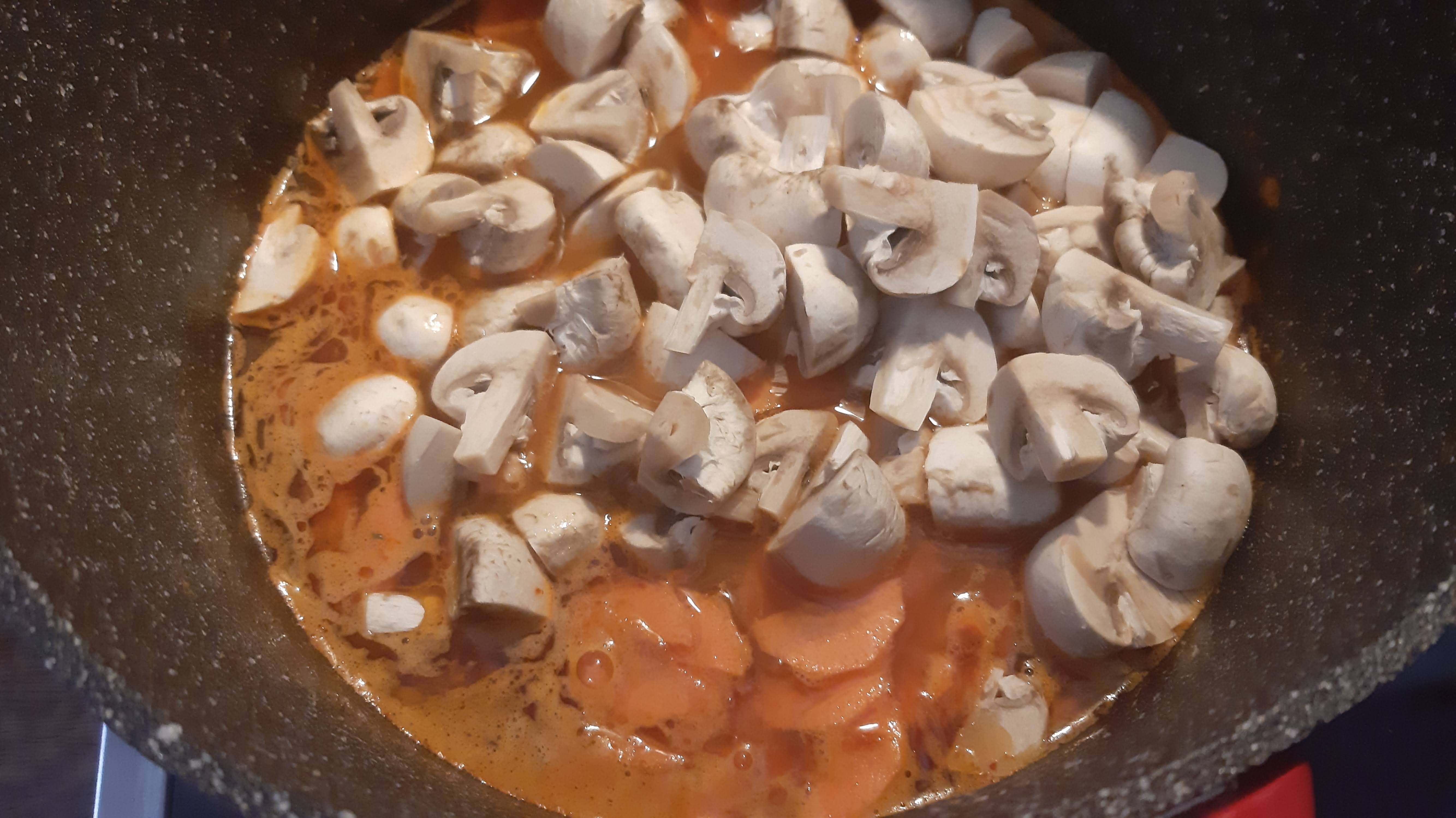 - Щом бульона заври, добавям почистените и нарязани на едро гъби, и нарязаните на много тънки полумесеци моркови. Ако са много дебели, ще останат сурови.