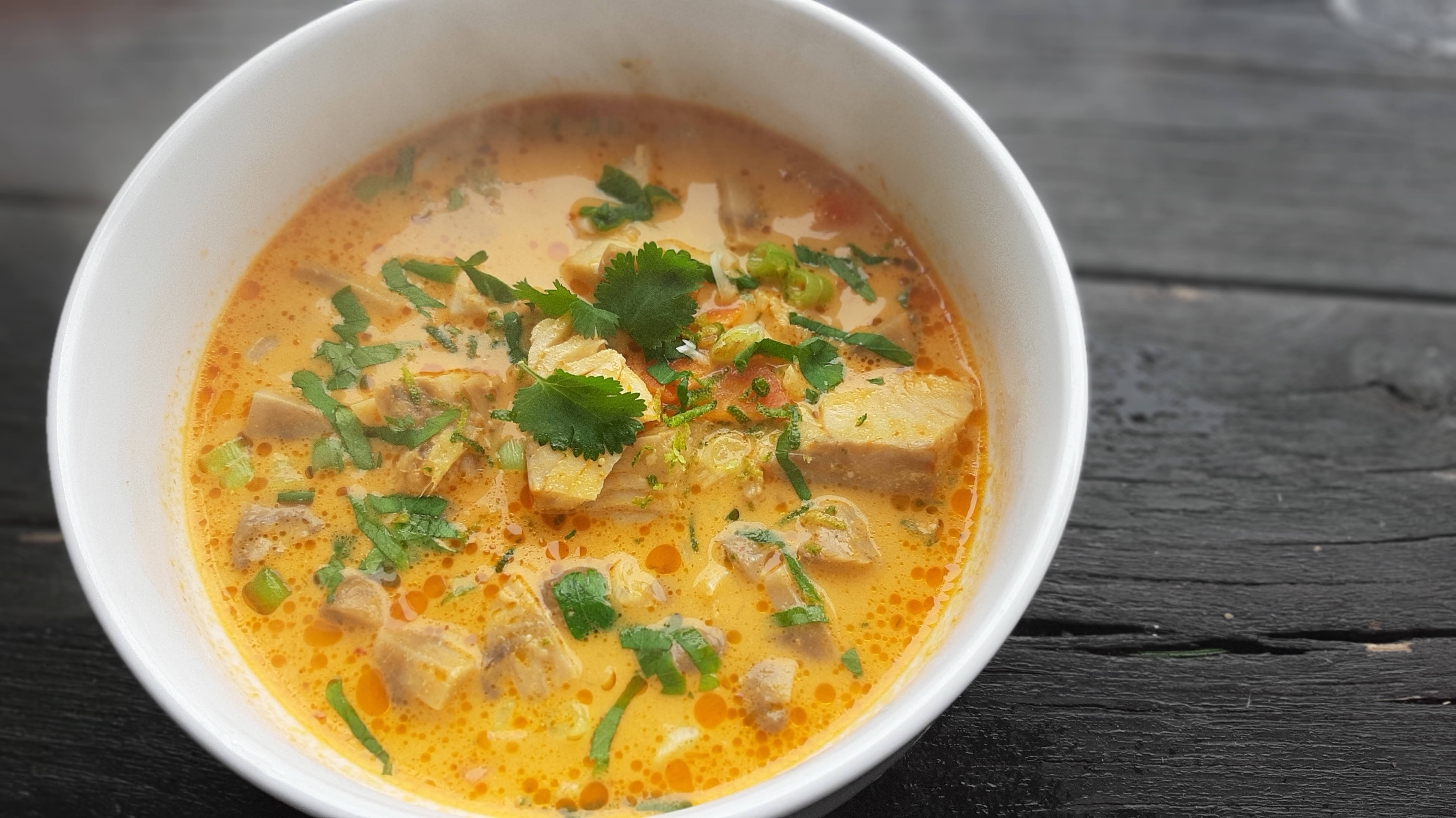 Тази кремообразна супа с кокосово мляко и прясна бяла риба, здравословен джинджифил, хрупкави зеленчуци и вкусна (люта) къри паста се приготвя много лесно и запълва вечерята прекрасно с аромати и вкус. Пресният кориандер (за тези, които го обичат) и зеленото лимонче дават финалната нотка на това ниско – въглехидратно ястие.