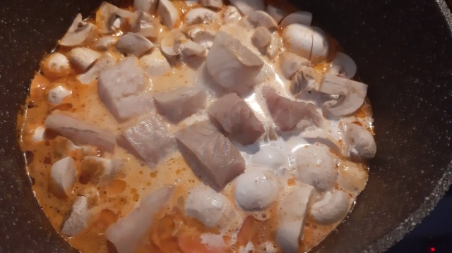 - Намалявам котлона на средна мощност, заливам с кокосовото мляко и добавям нарязаната на едри 3 см кубчета.
