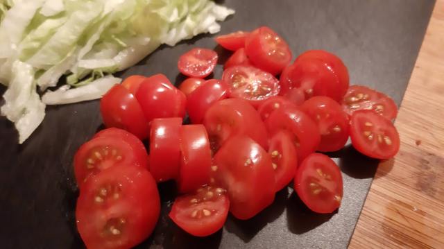 400 гр предварително приготвено месо по желание (свинско, пилешко, пушко или говеждо). Можете да използвате рецептата за ГИРОС в Ухае на…или пък да го изпържите до пълна готовност в тиган.