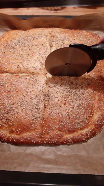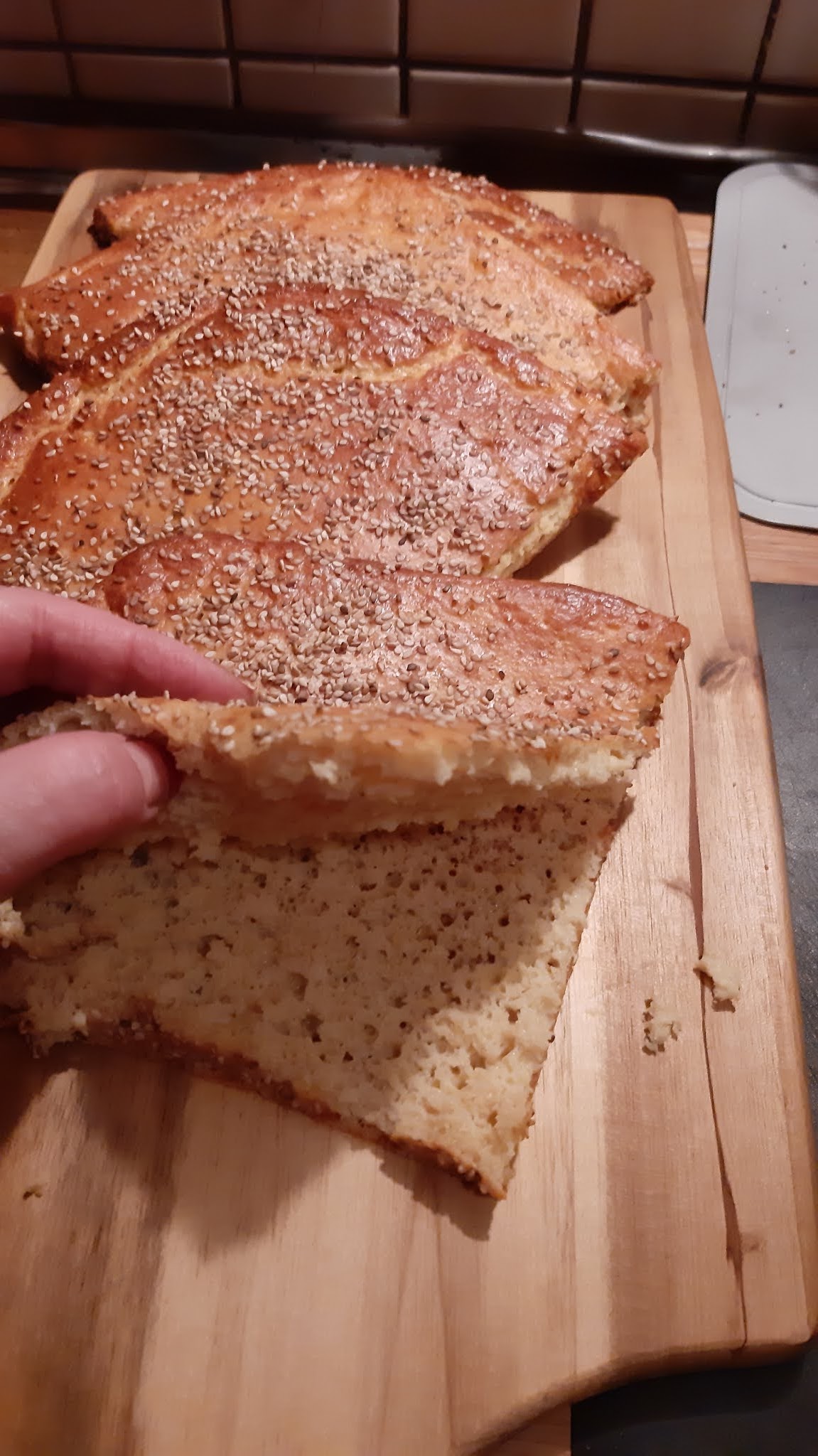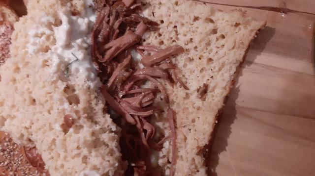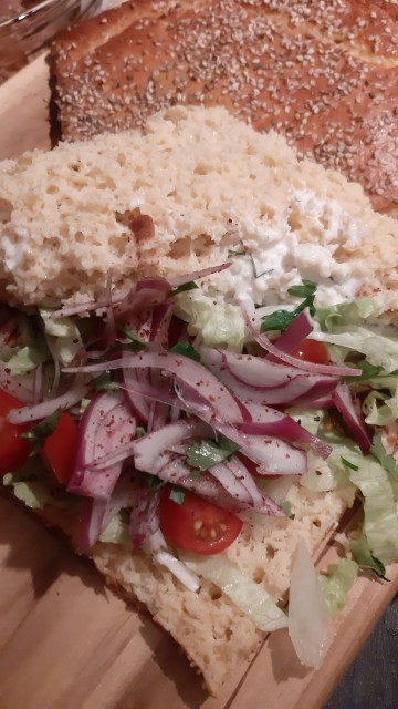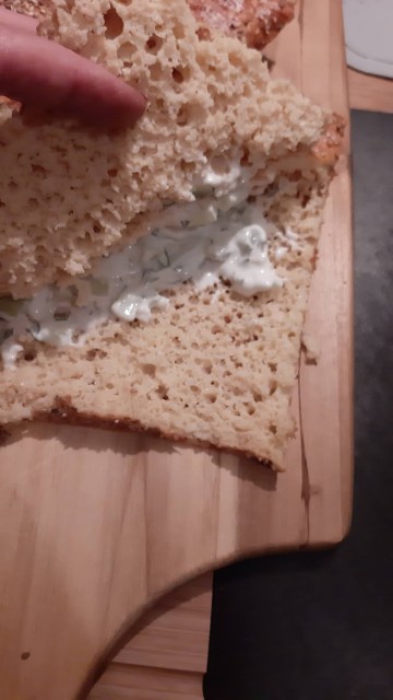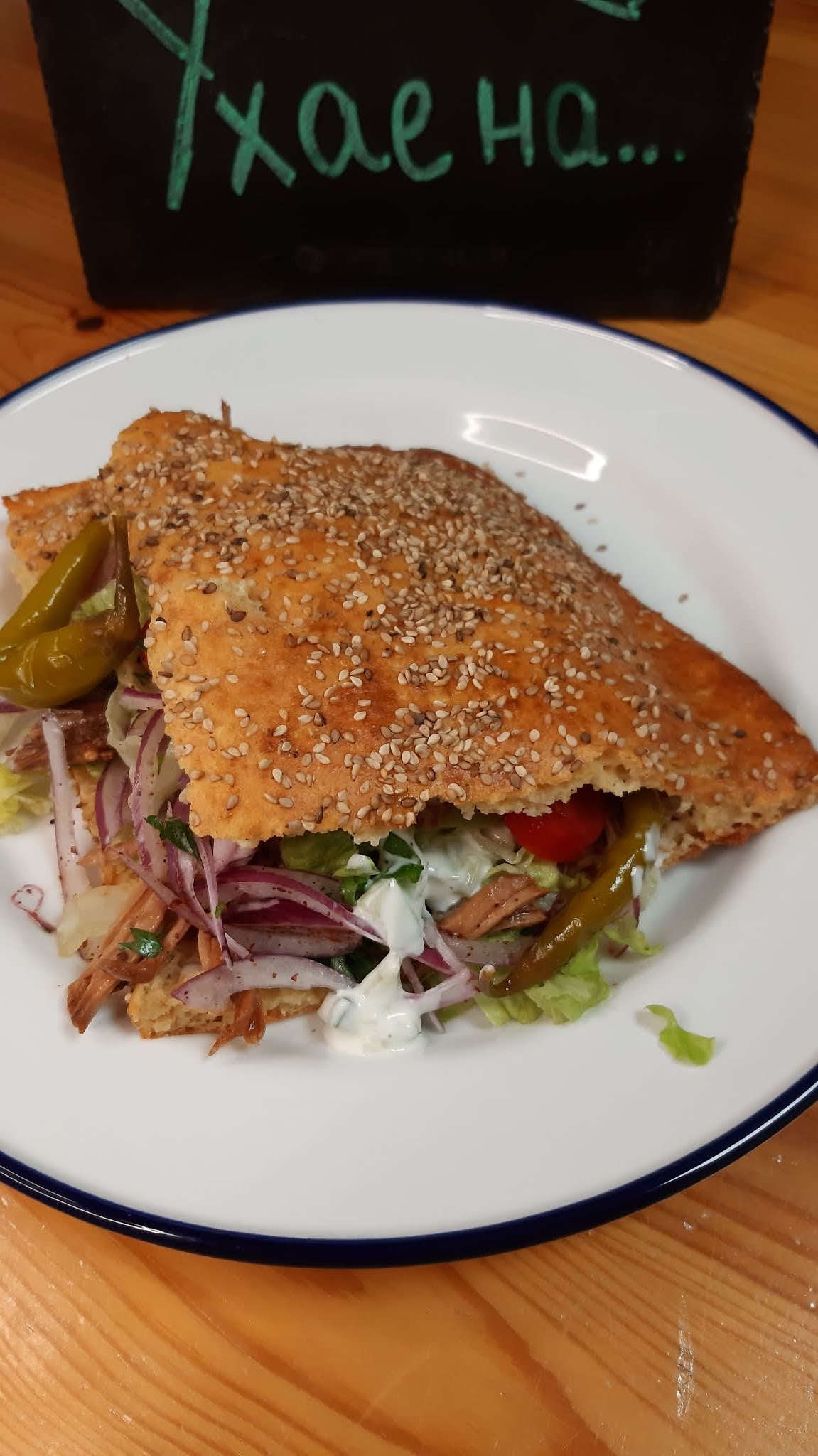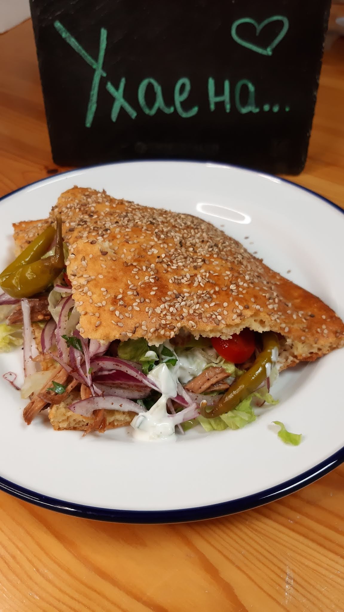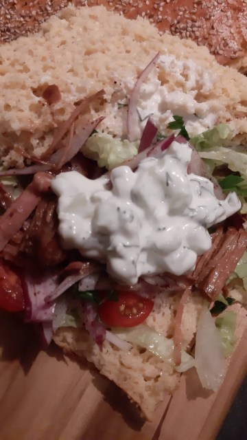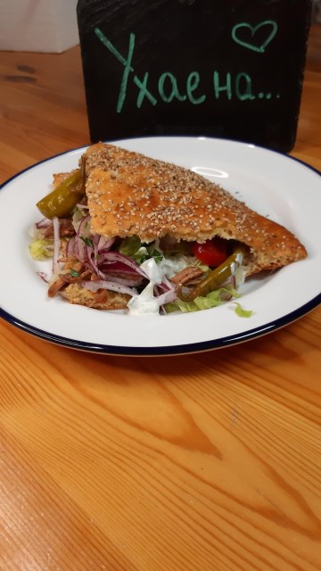 Днес турското хлебче е без брашно и много добре напълнено с месо, зеленчуци и сос с кисело мляко, който аз замених днес със сух таратор.