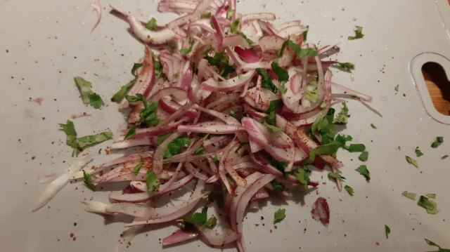 червен лук, нарязан на ленти и подправен с бибер, сумак и магданоз