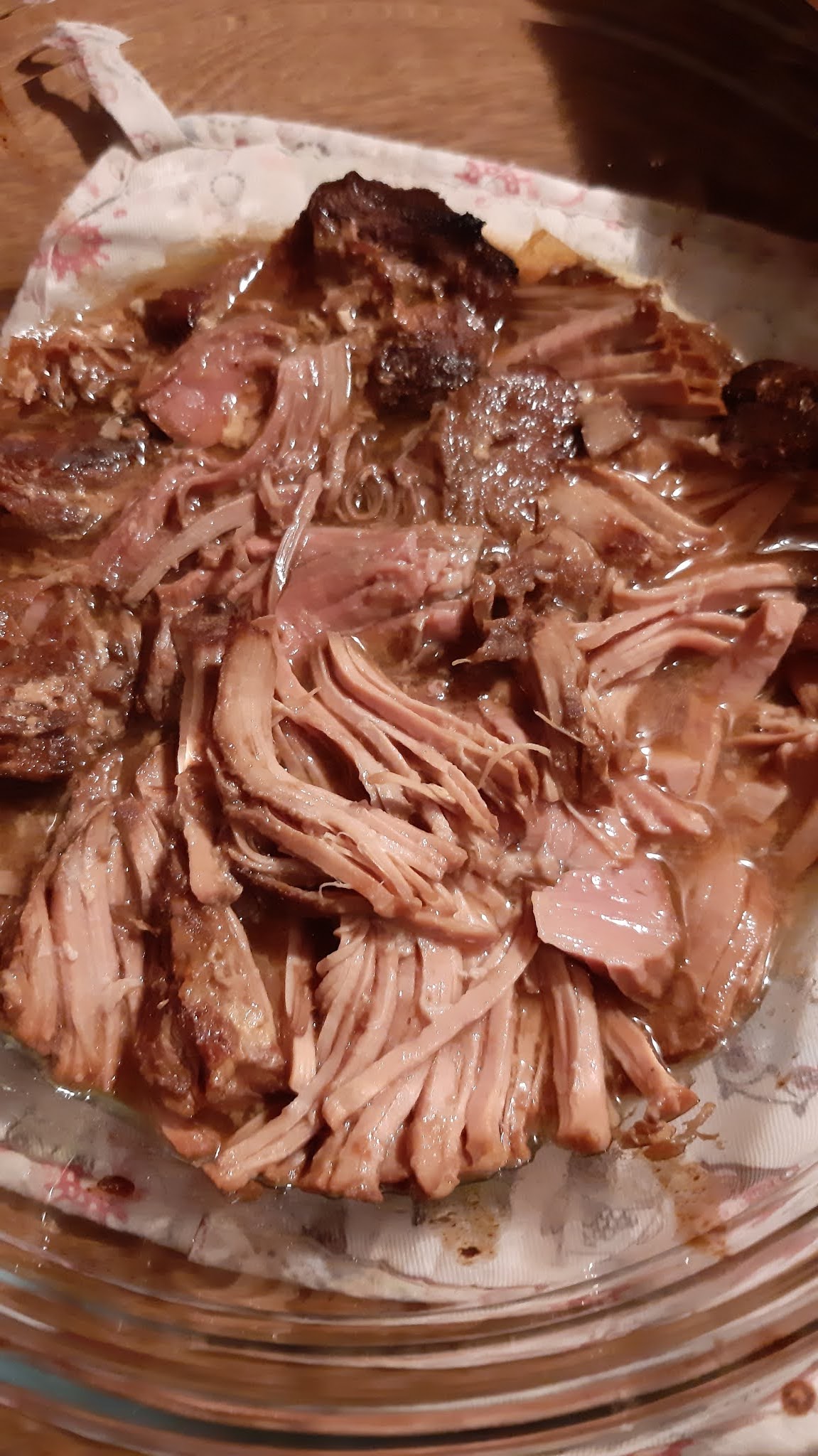 - Месото накъсвам с две вилици, за да стане на ситни парченца.