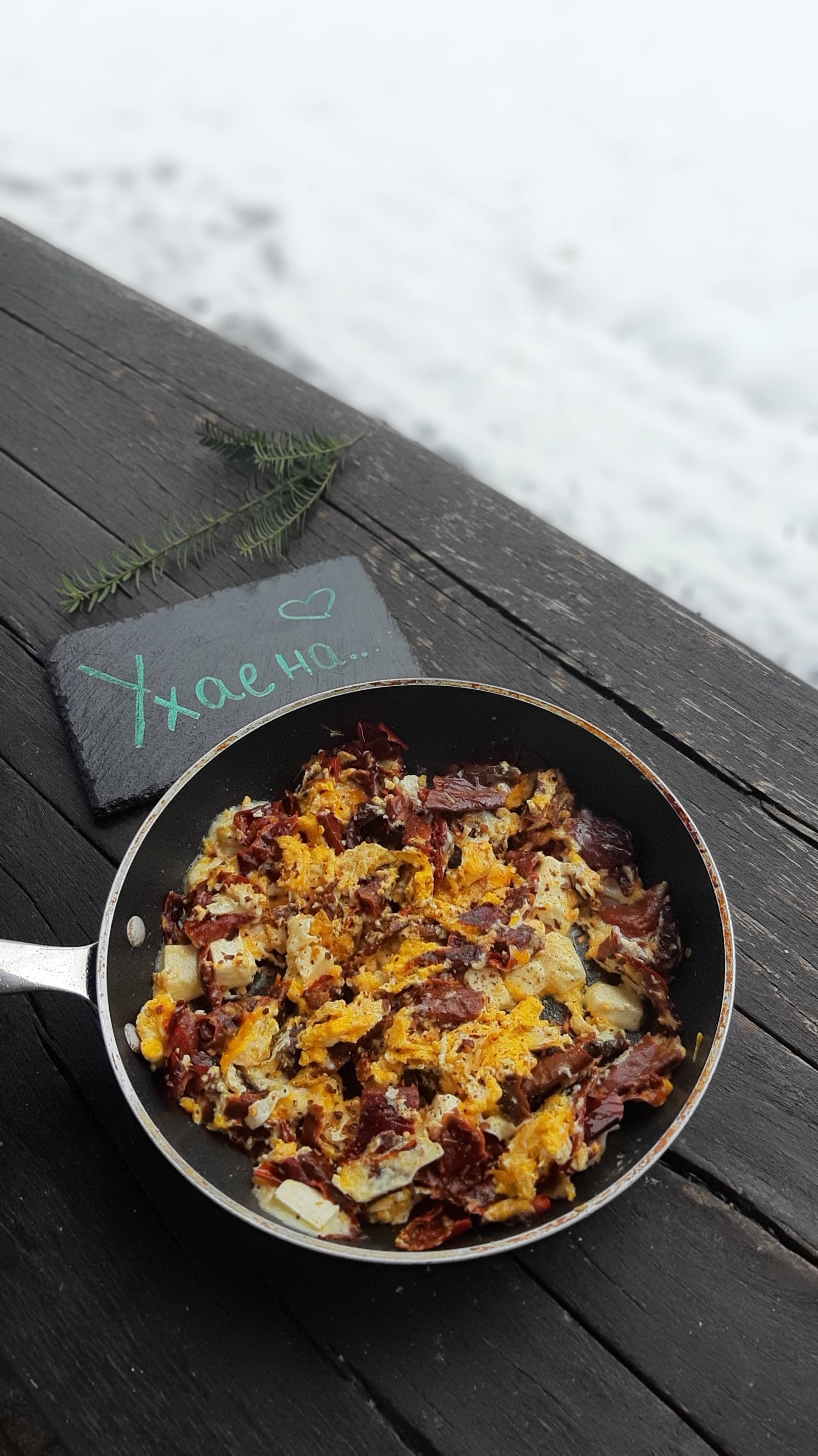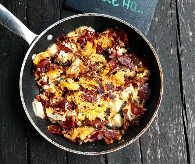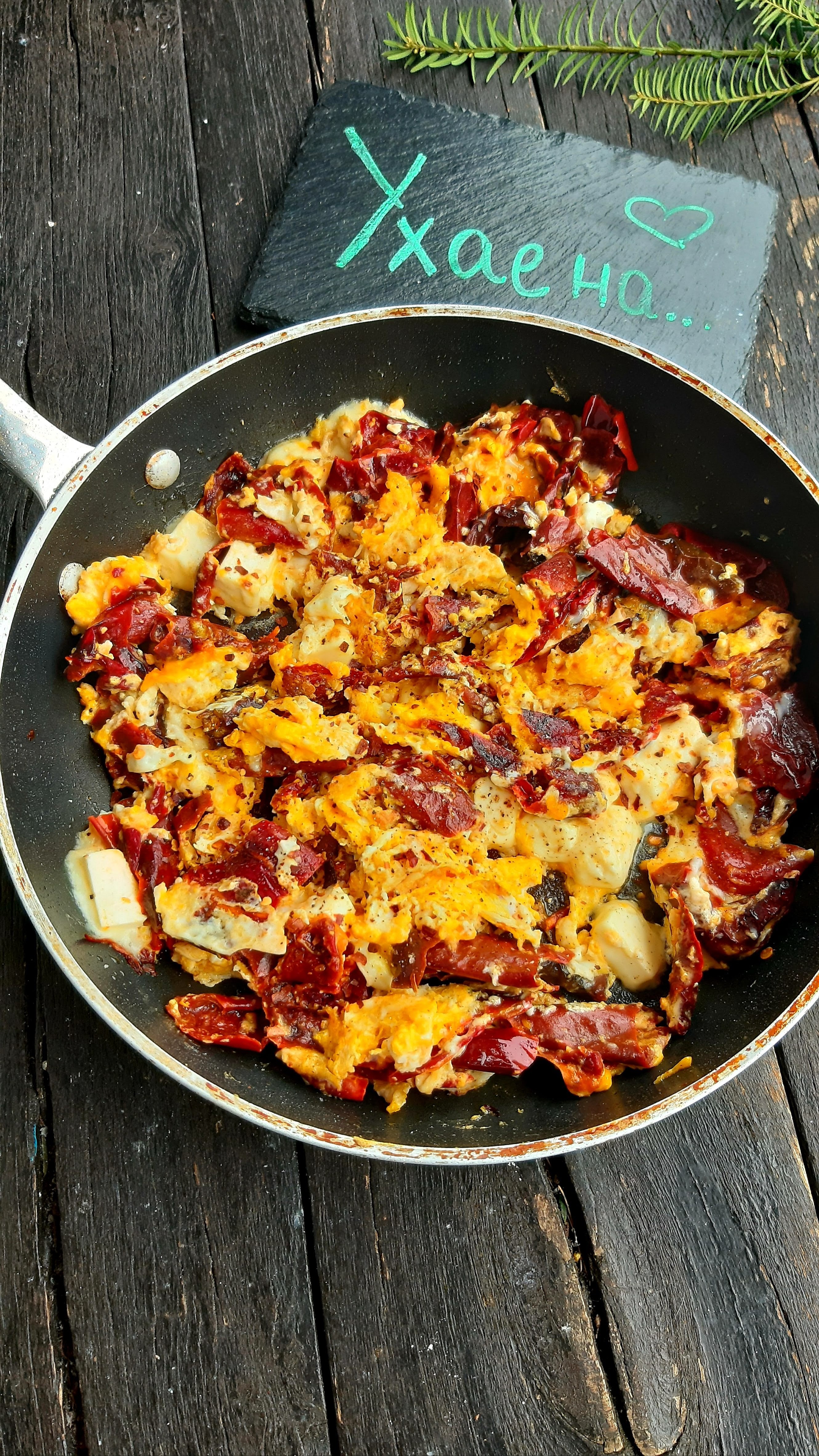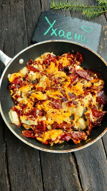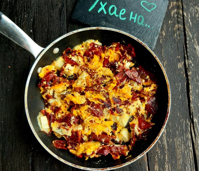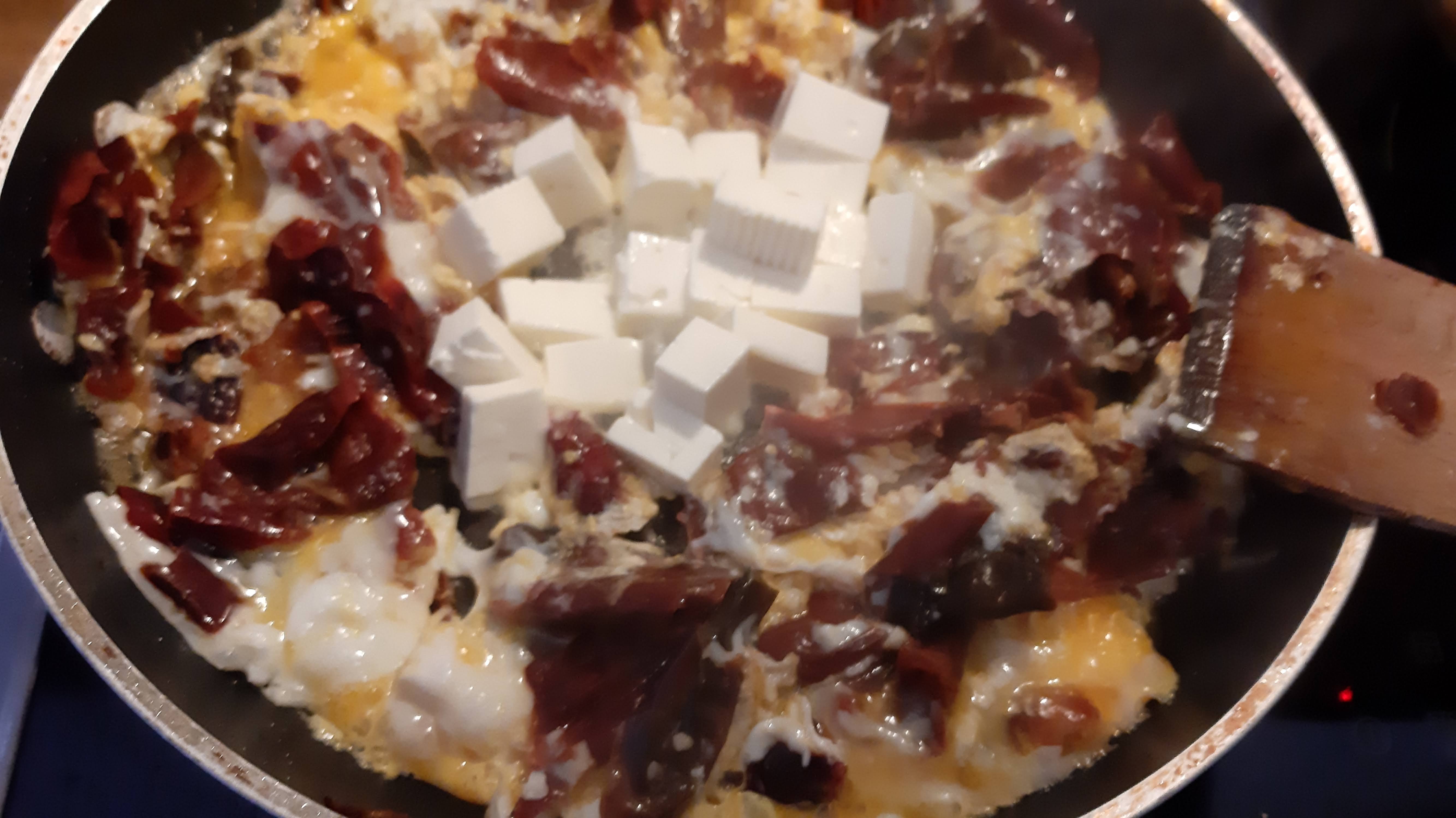 - Когато преценя, че яйцата са готови, добавям нарязаното на малки кубчета сирене и леко изпържвам.