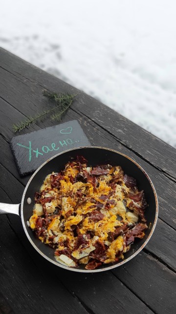 Сервирам на масата заедно с тигана и всеки си сипва от ароматната и вкусна манджа. Препечено хлебче много подхожда.