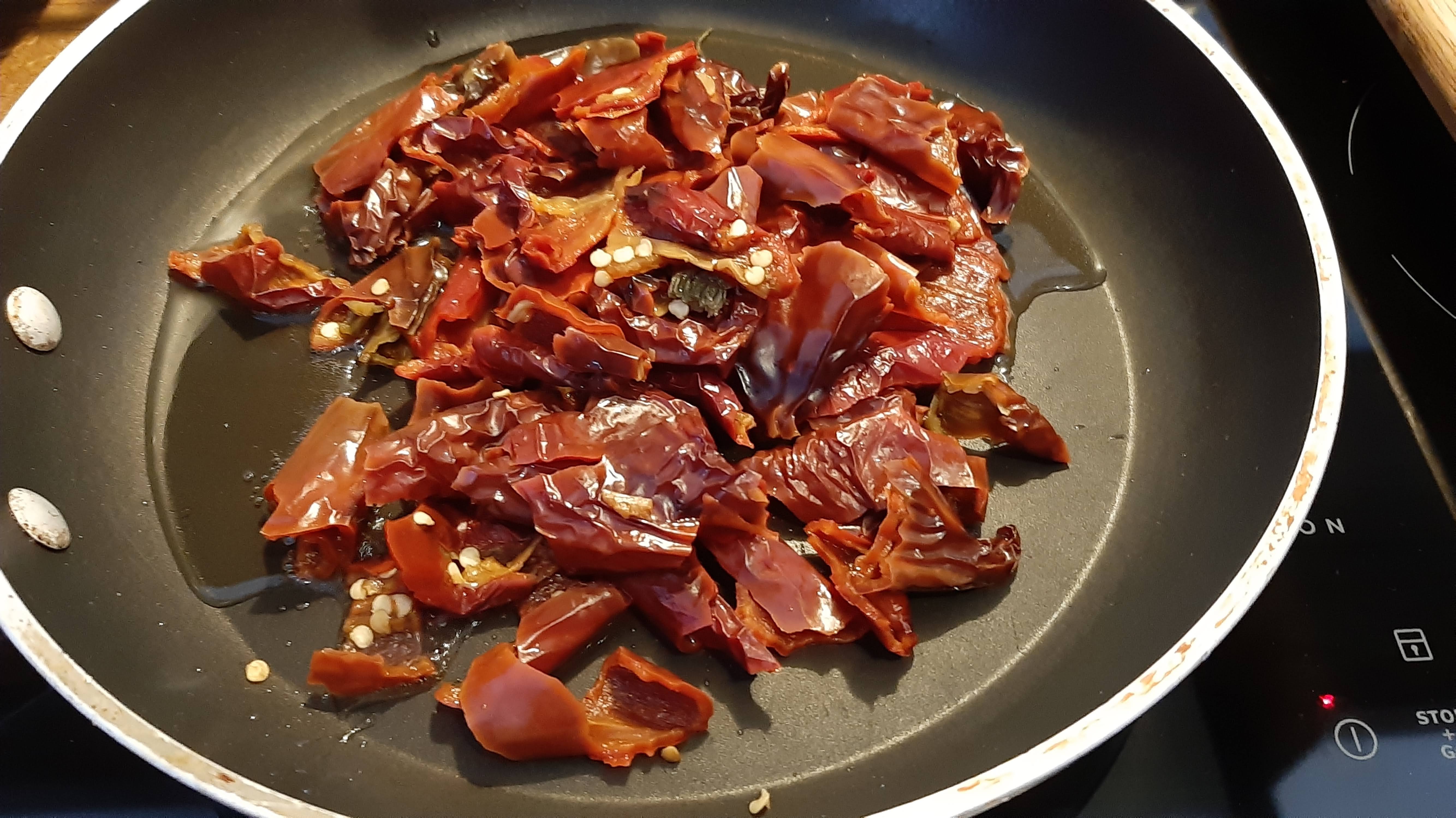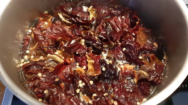 - В тенджера сварявам вода и пускам в нея начупените сушени чушки. Варя ги на средна мощност до пълното им омекване. Това може да продължи около 6 – 7 минути.