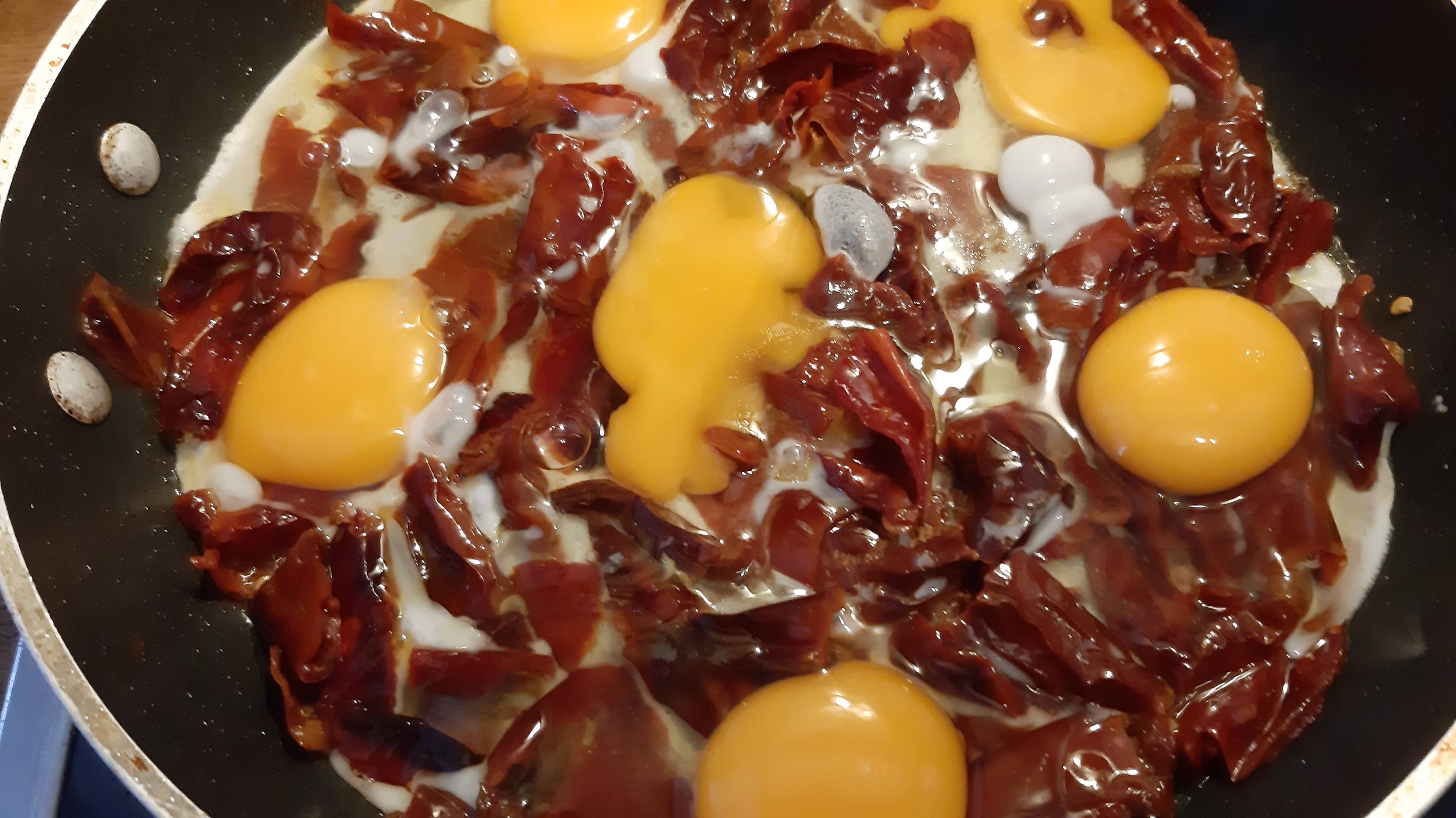 - Не бързам да ги бъркам. Изчаквам първо да се стегнат. Така се запазват цветовете на жълтък и белтък.
