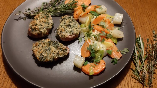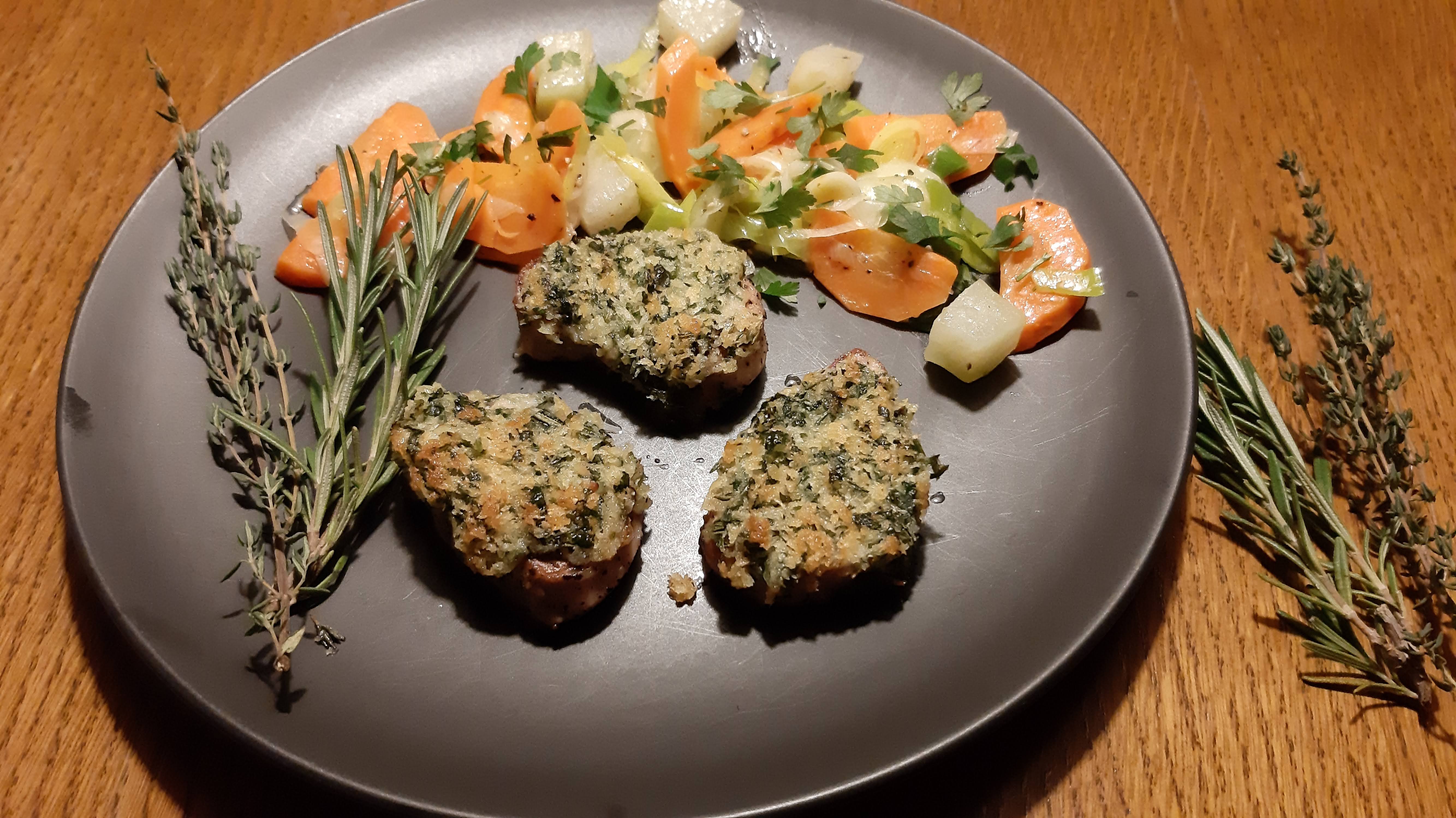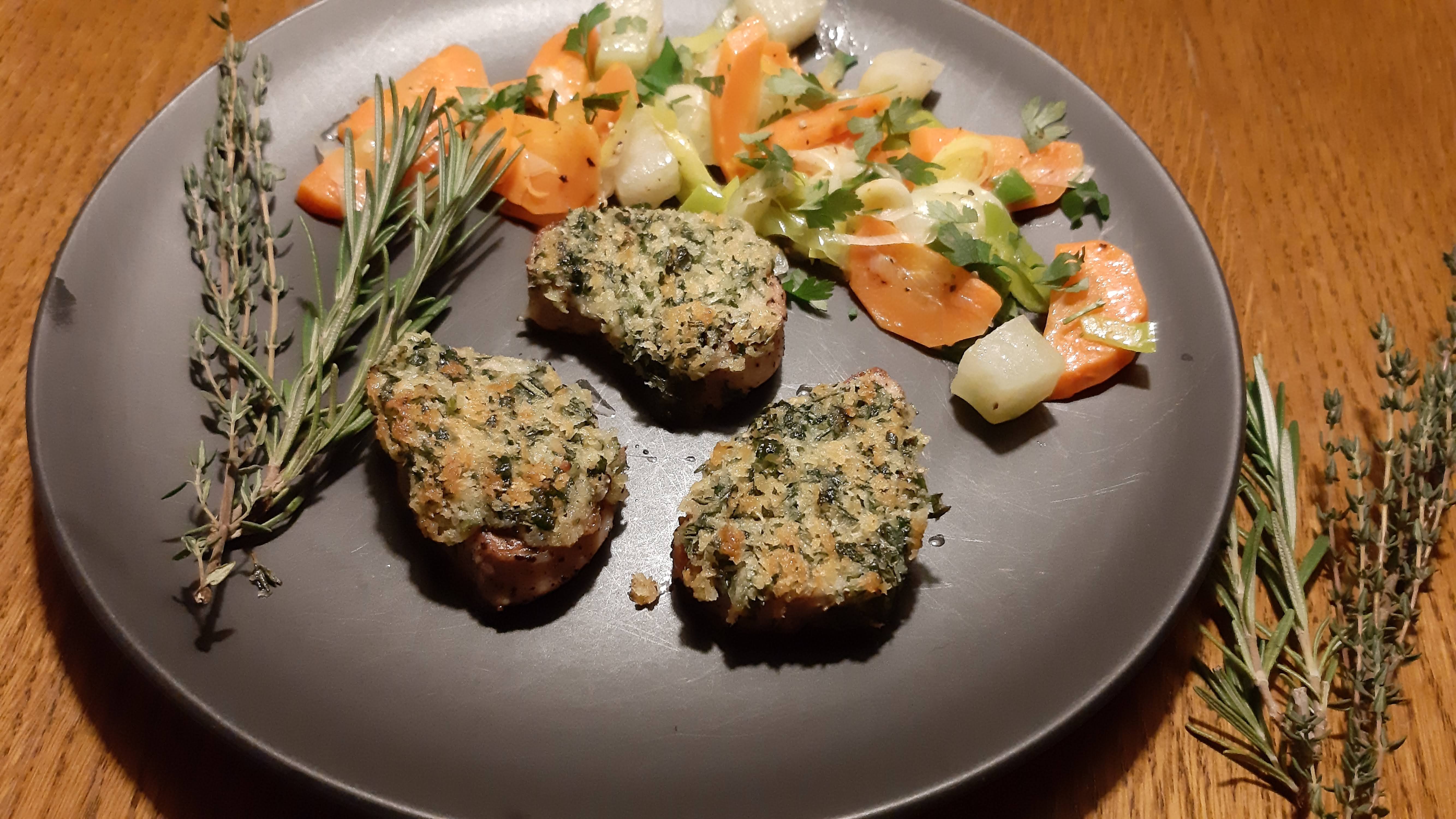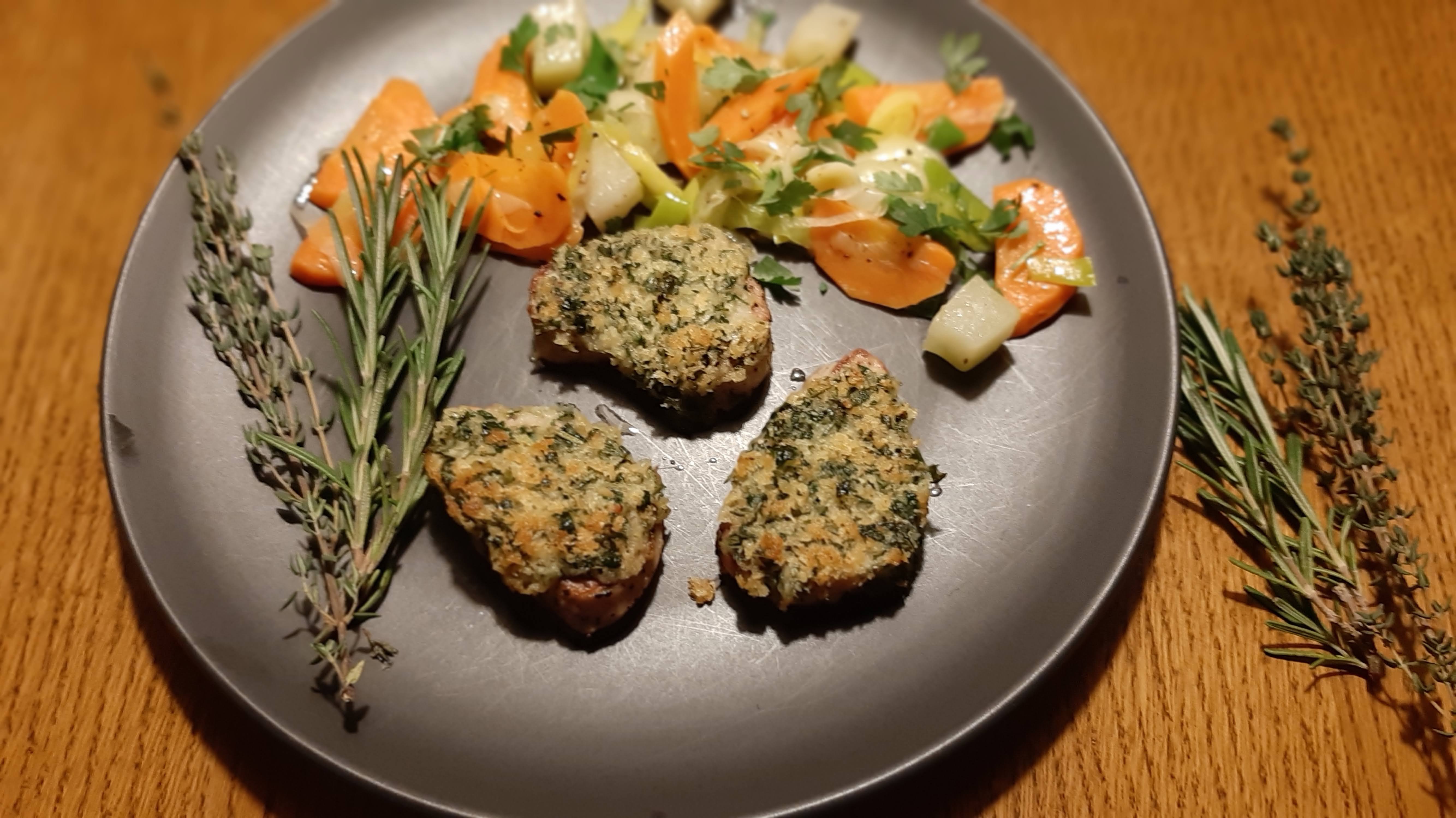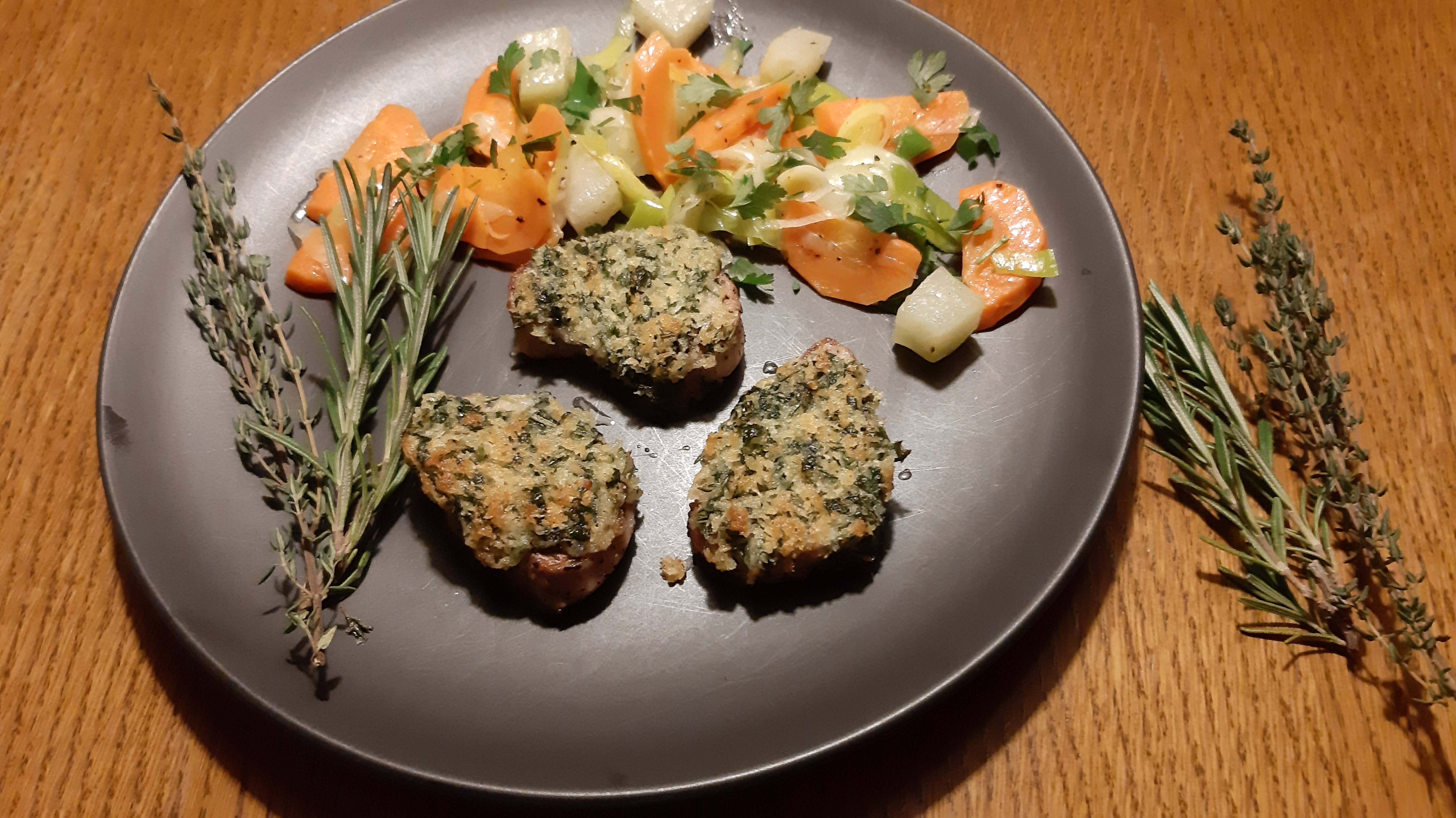 Сочното бон-филе, сервирано с хрупкава коричка от много билки, панко и масло ще Ви стане любимо. Приготвя се много бързо и не изисква никакви умения и специална подготовка. В същото време може да бъде невероятна кулинарна изненада за Вашите гости.