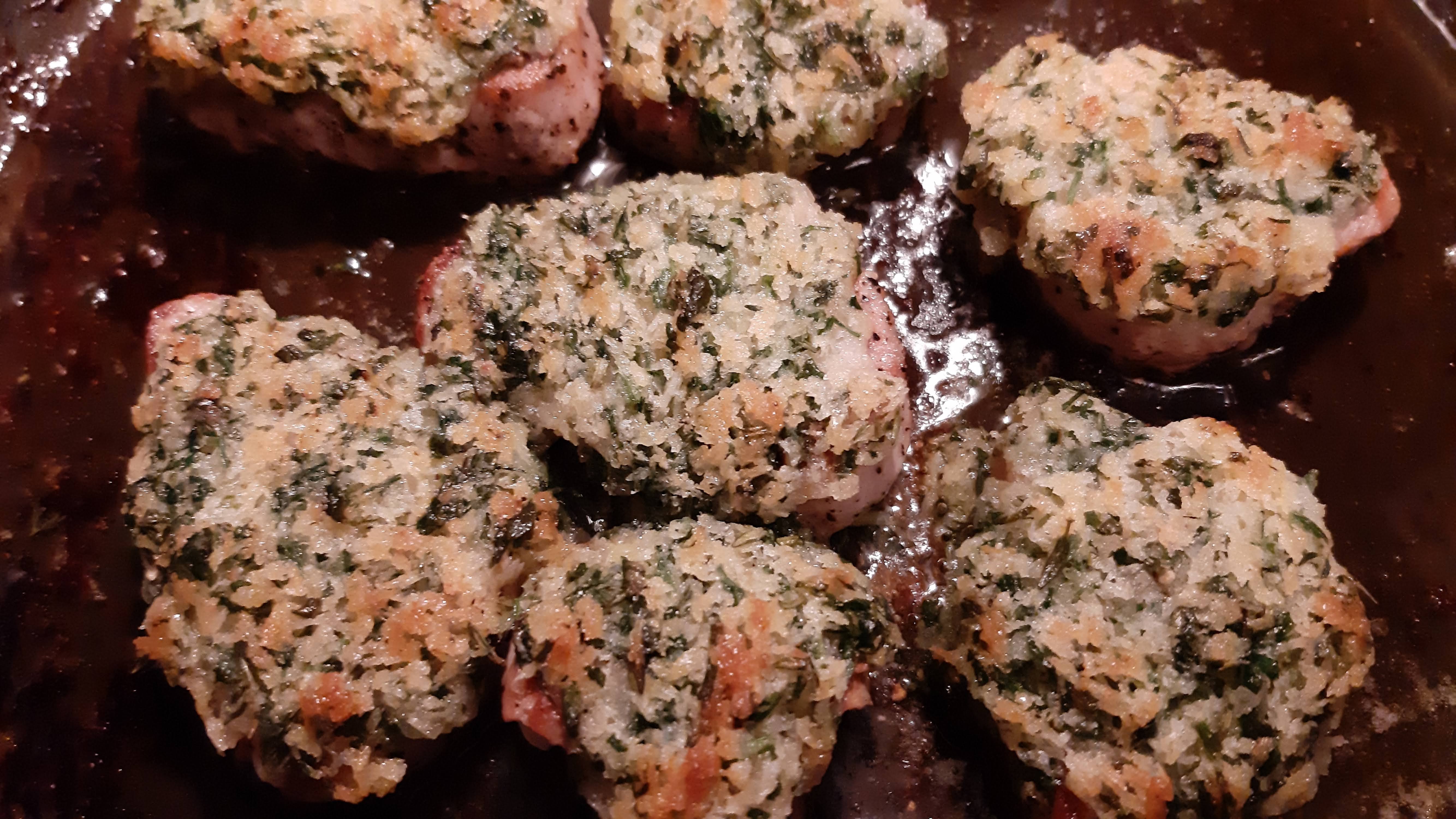 - Всяко филе намазвам плътно и обилно с билковата смес. Леко притискам с лъжицата, за да се залепи.