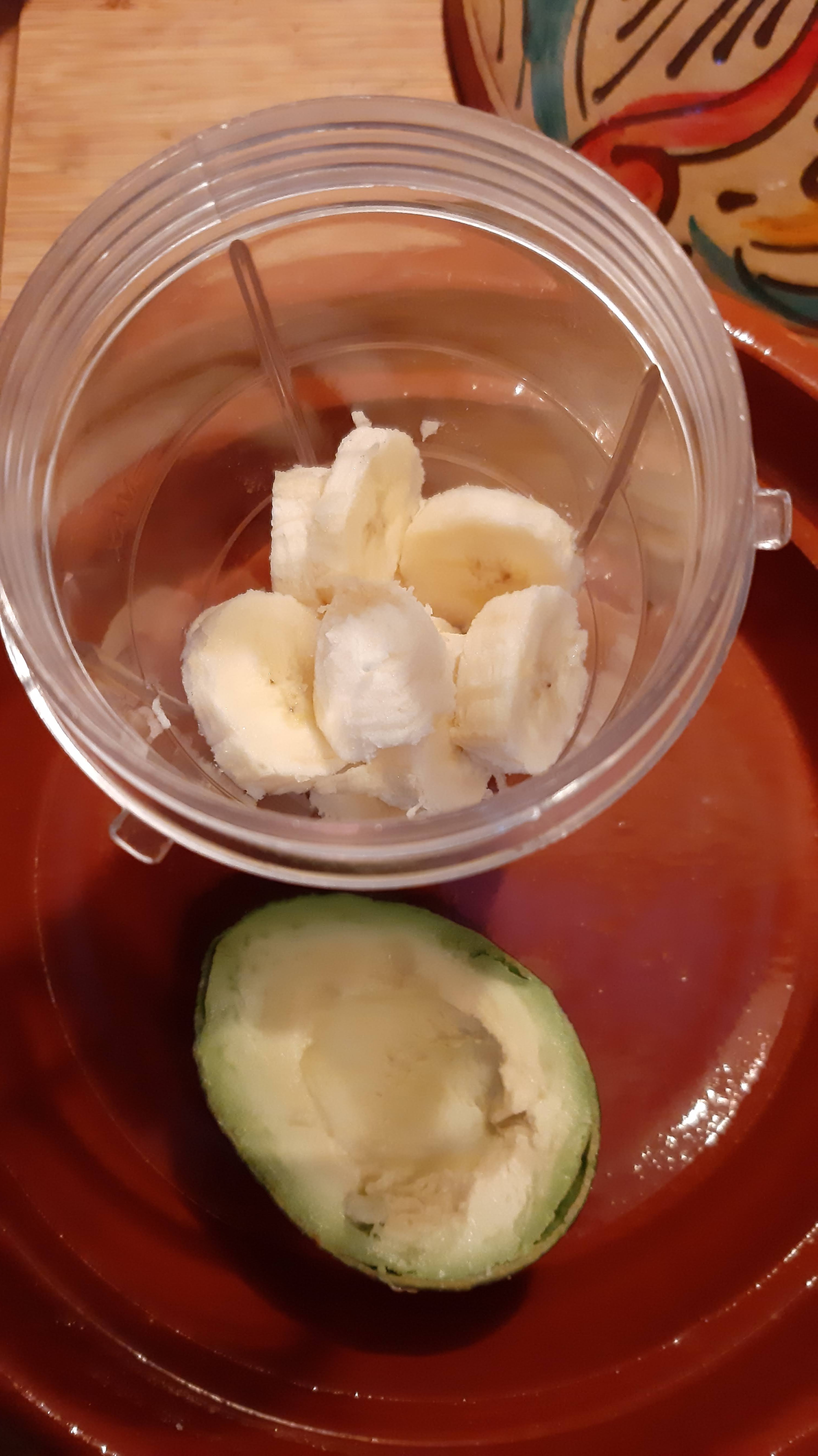 • Авокадото режа на половина. Едната половина увивам във фолио за свежо съхранение и прибирам за на другия ден в хладилник. А другата половина добавям при банана.
