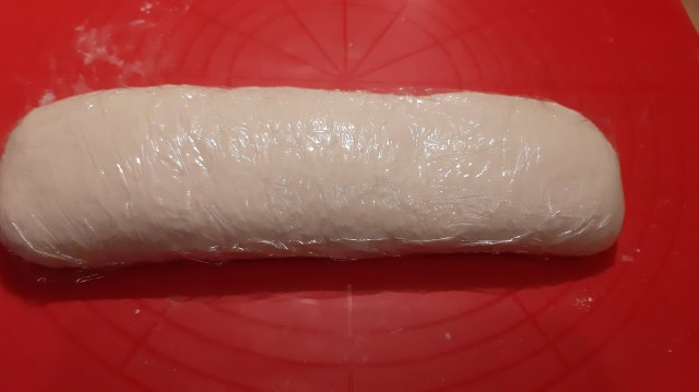 - Готовото тесто доомесвам на ръка, оформям на салам и увивам във фолио за свежо съхранение.