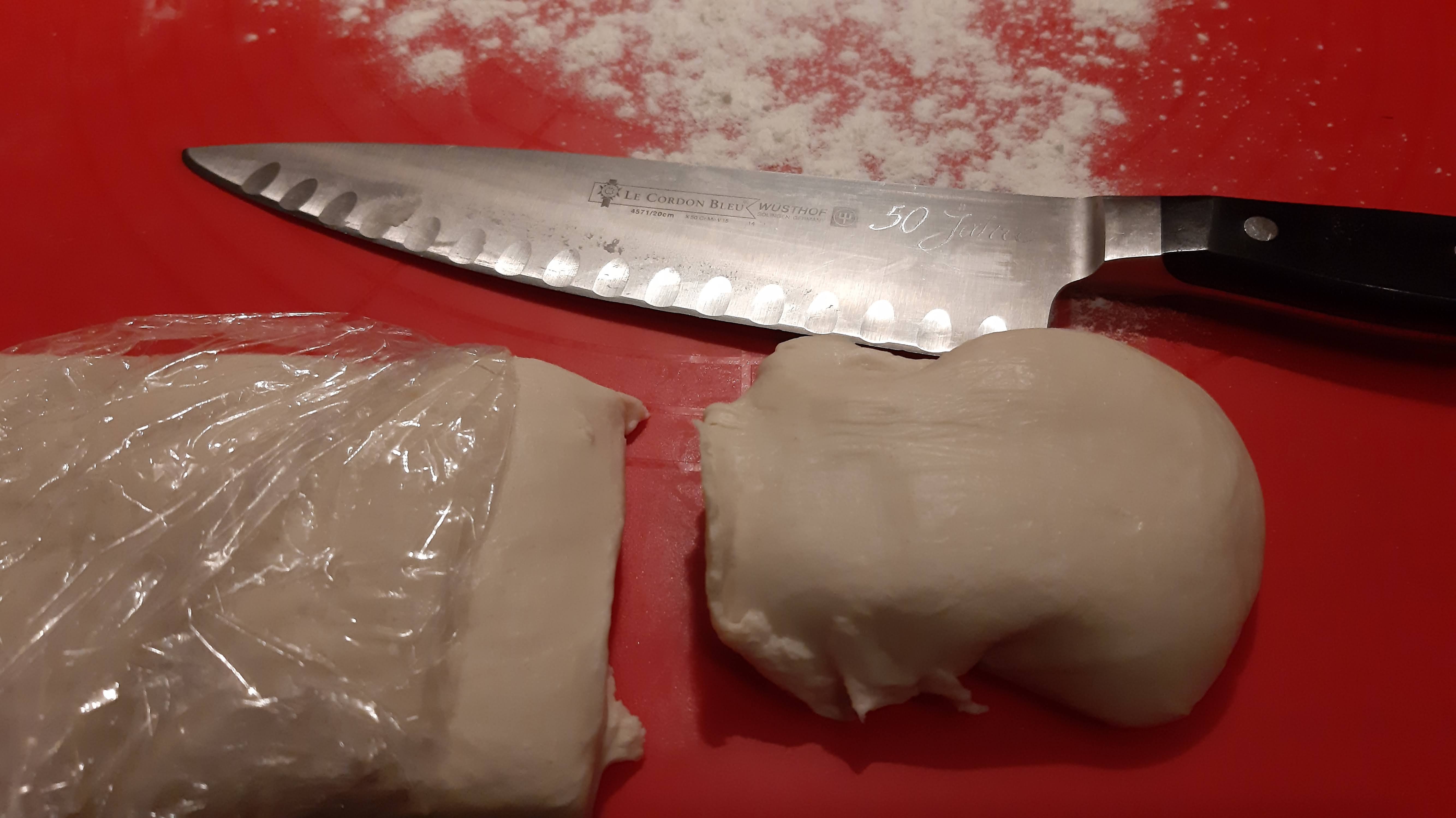 - Режа с нож нужното количество. От това тесто излизат 6 или 7 хлбчета с размер на тигана 28 см.