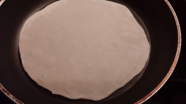 - Загрявам тигана на максималната мощност на котлона и слагам първата тортила.