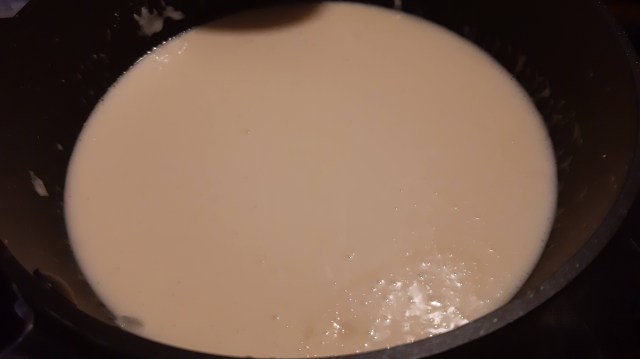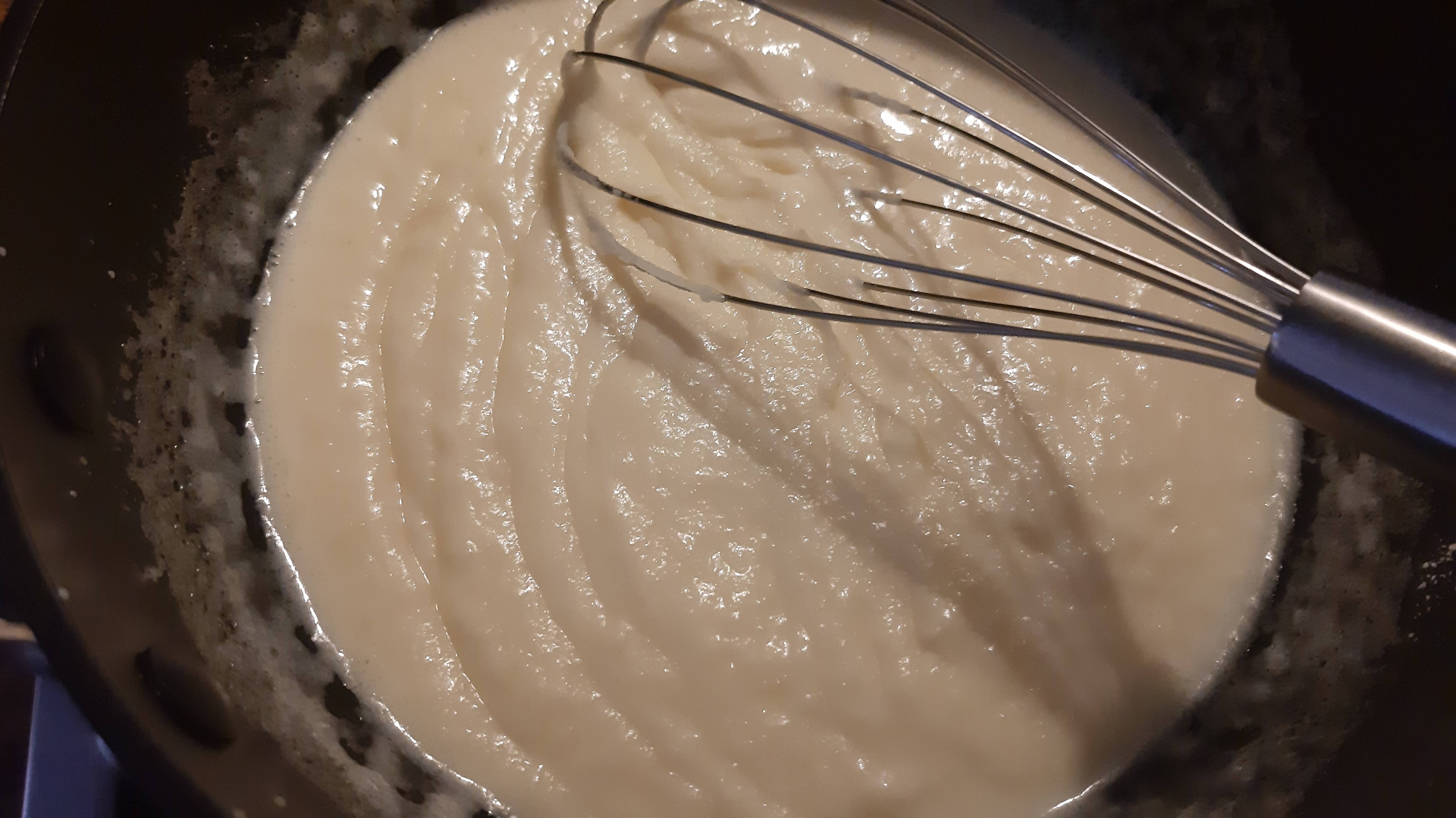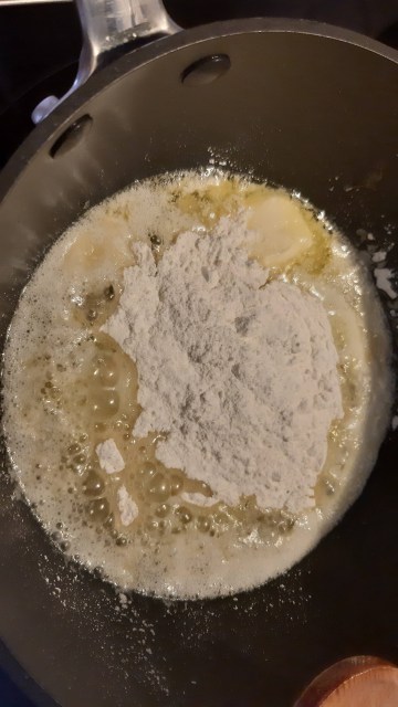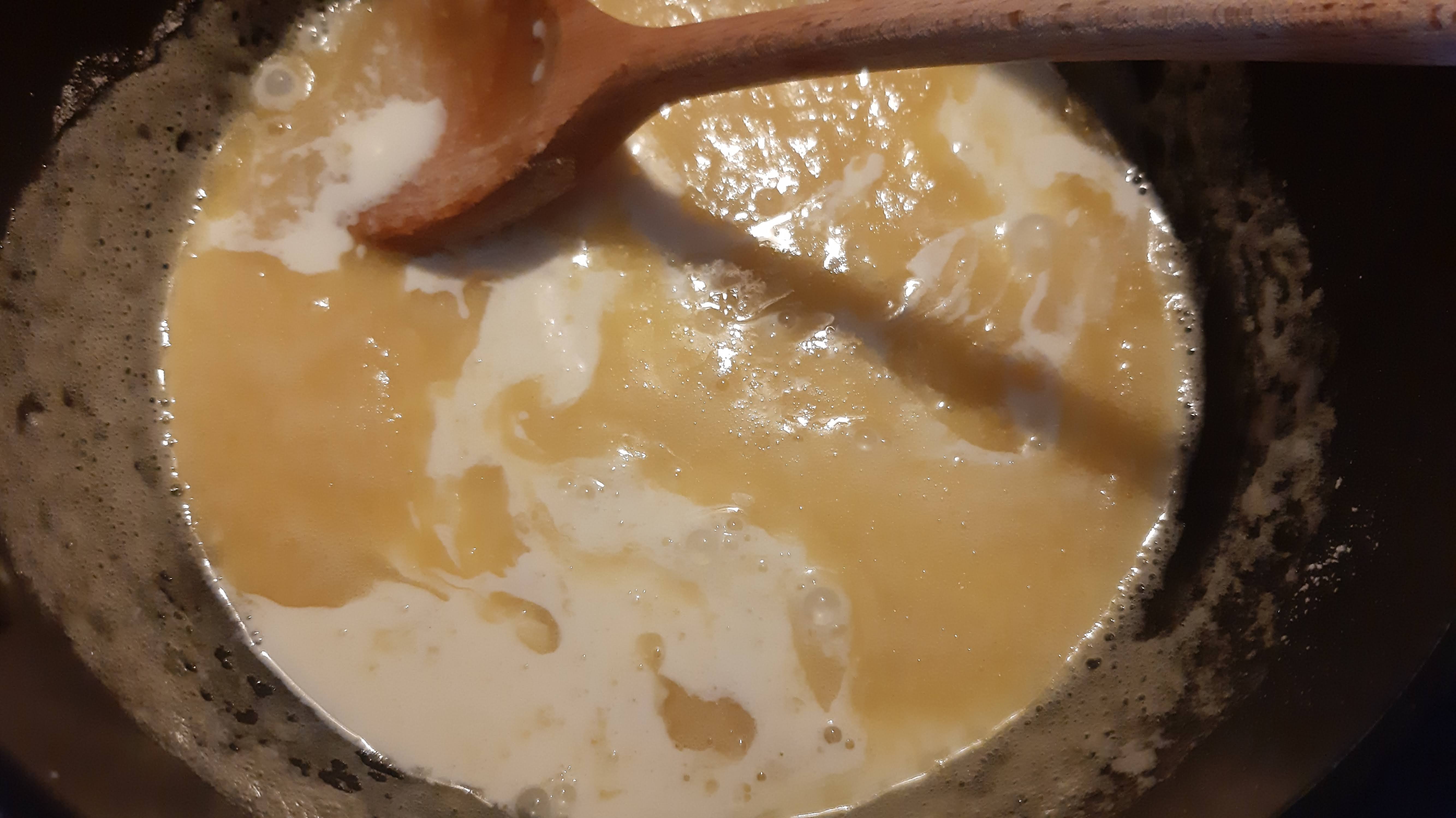 - Щом брашното замирише, заливам със млякото (сметаната) и 100 мл от бульона.