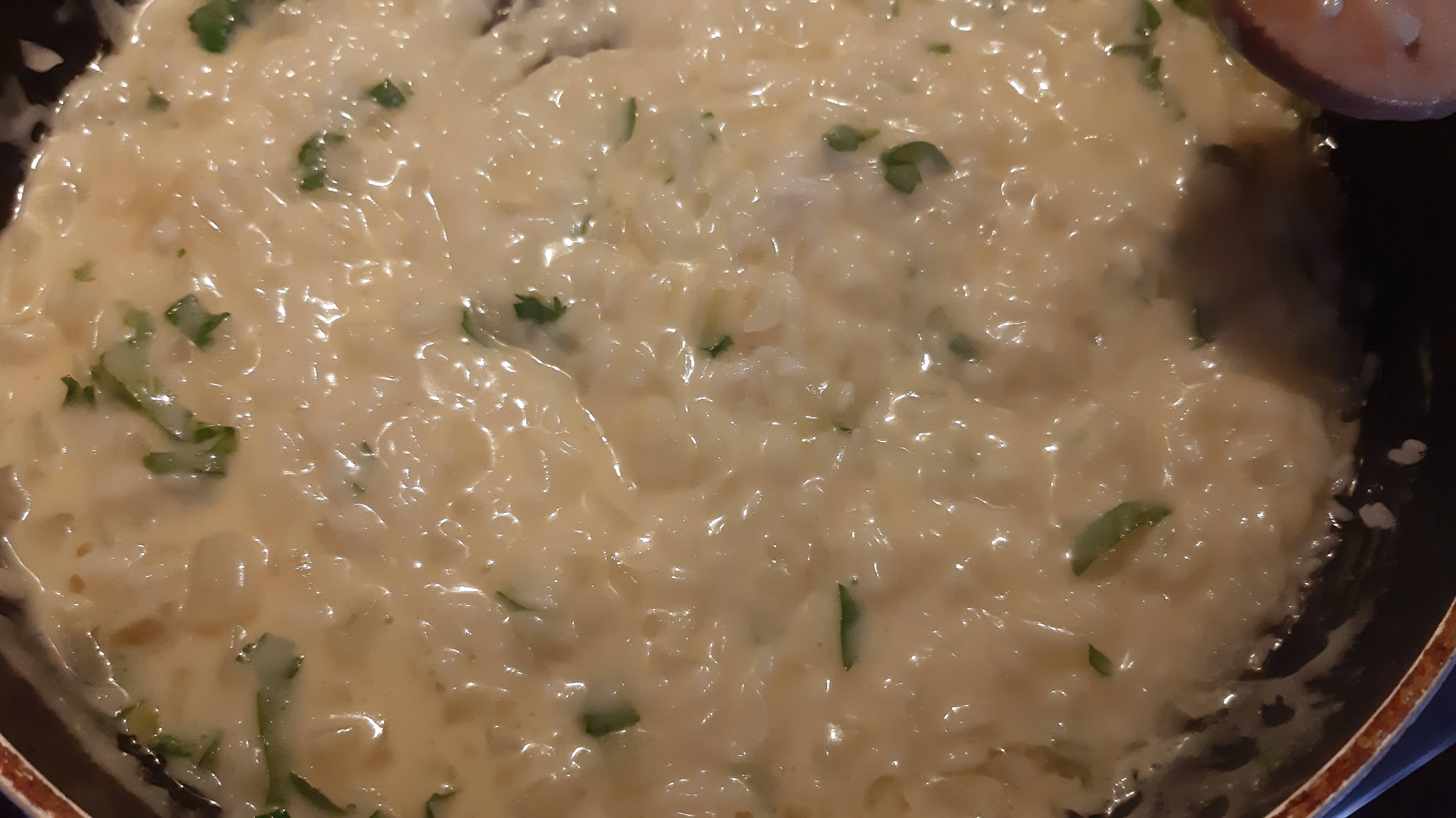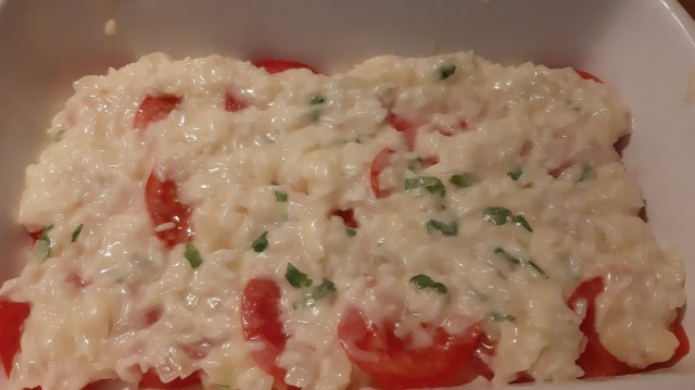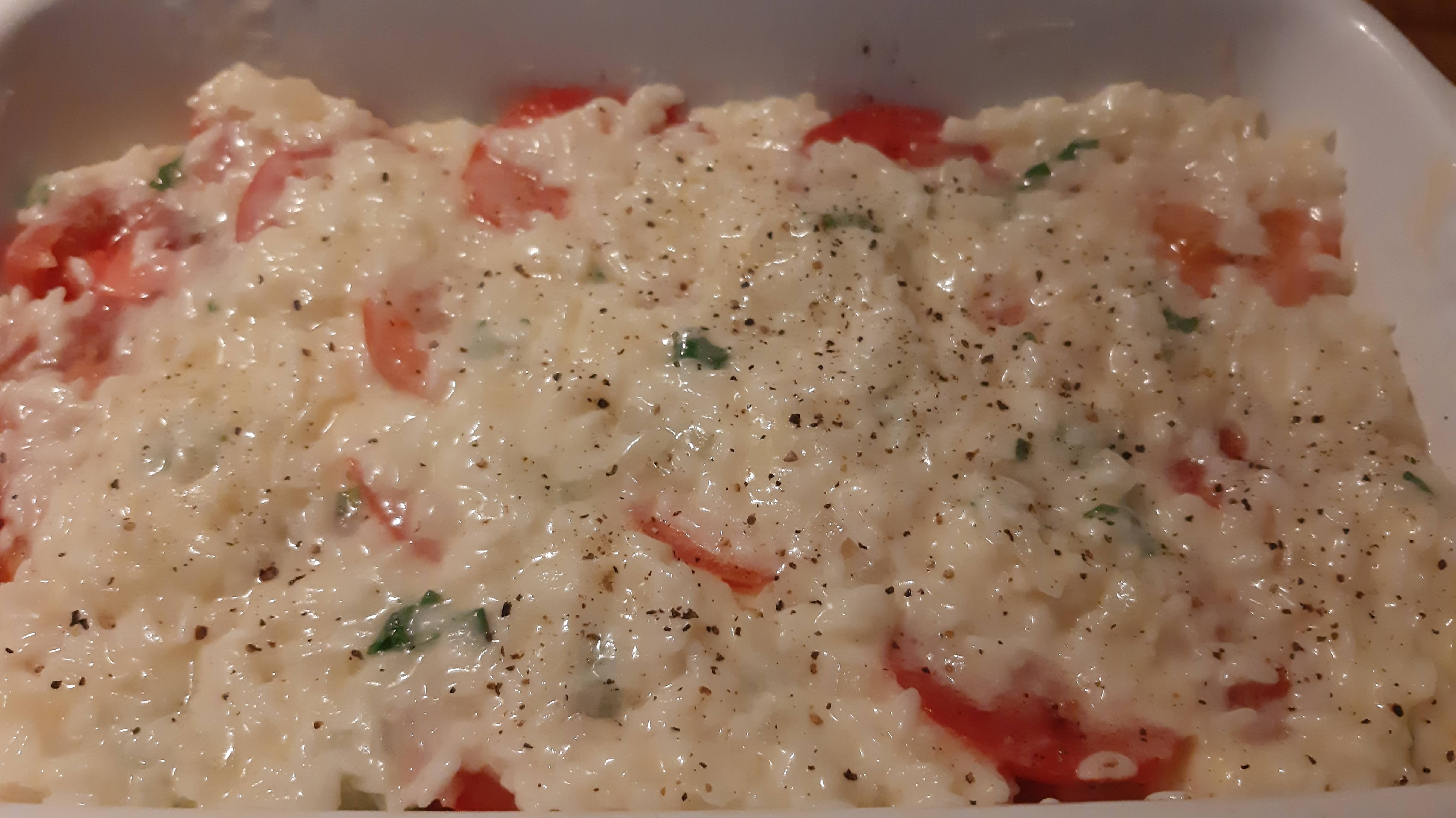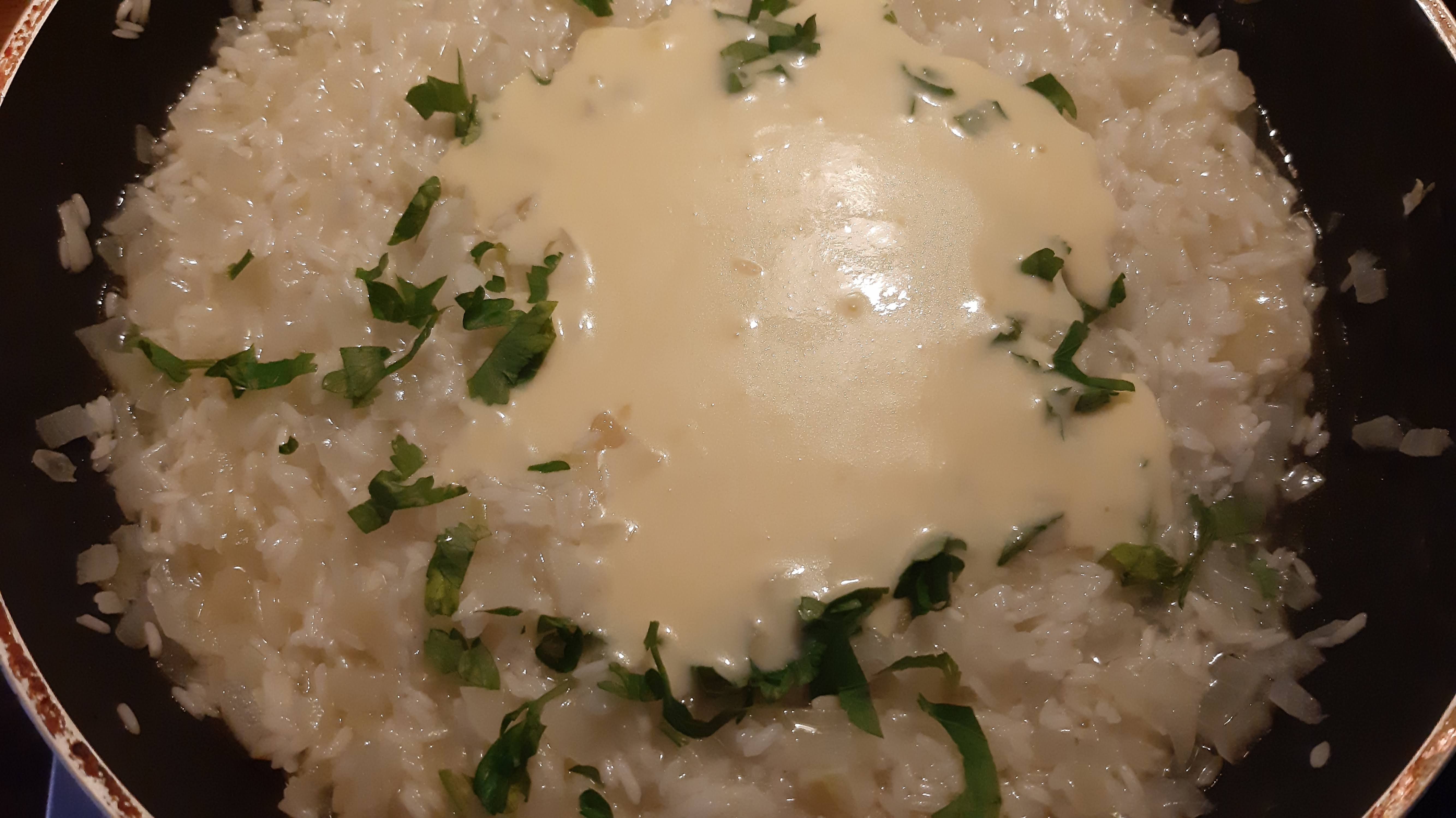 - Една трета от бешамеловия сос добавям към ориза и разбърквам.