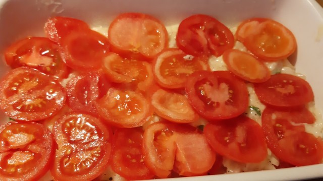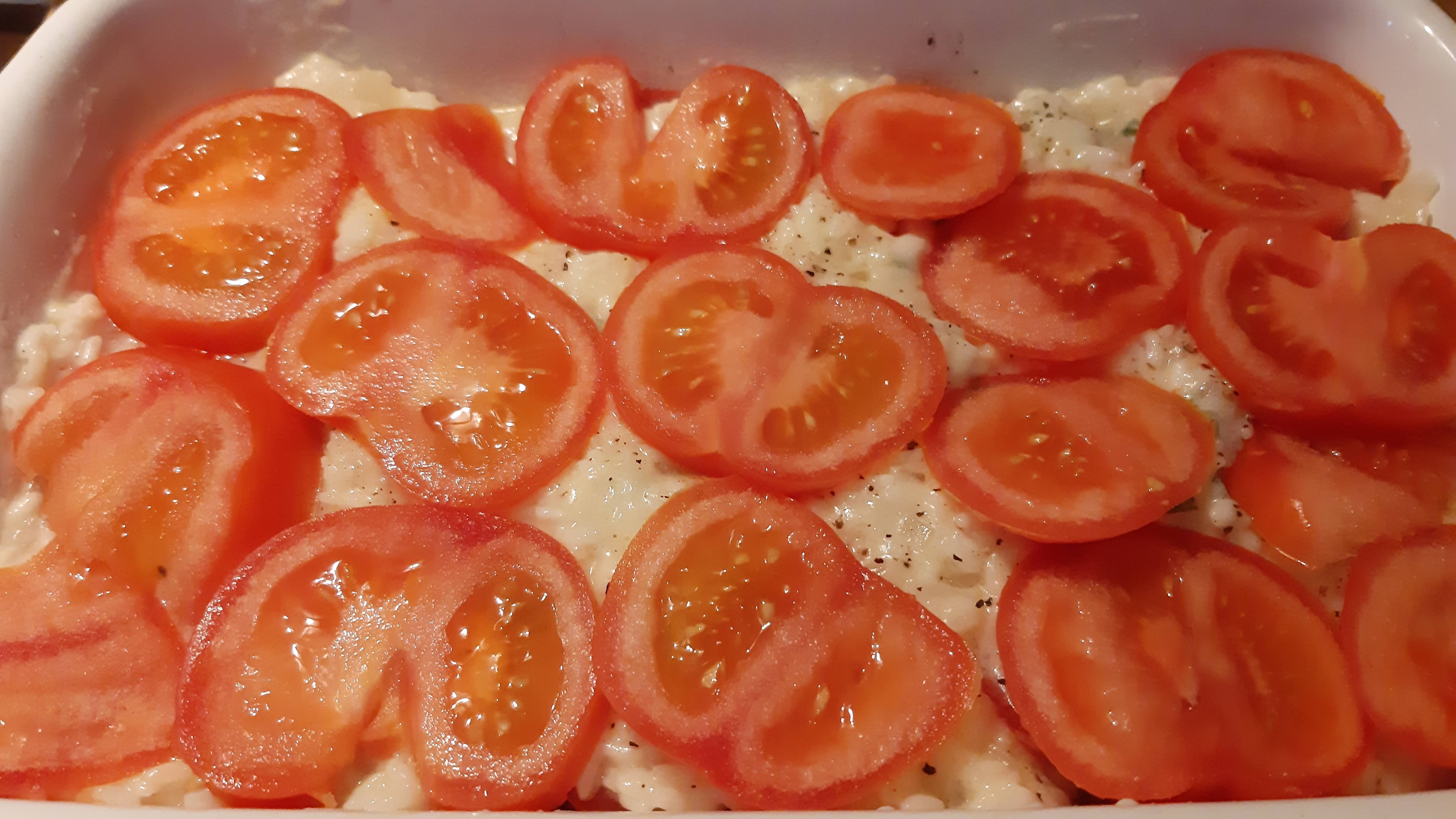- Покривам с втората третина и нарязани на кръгчета домати.