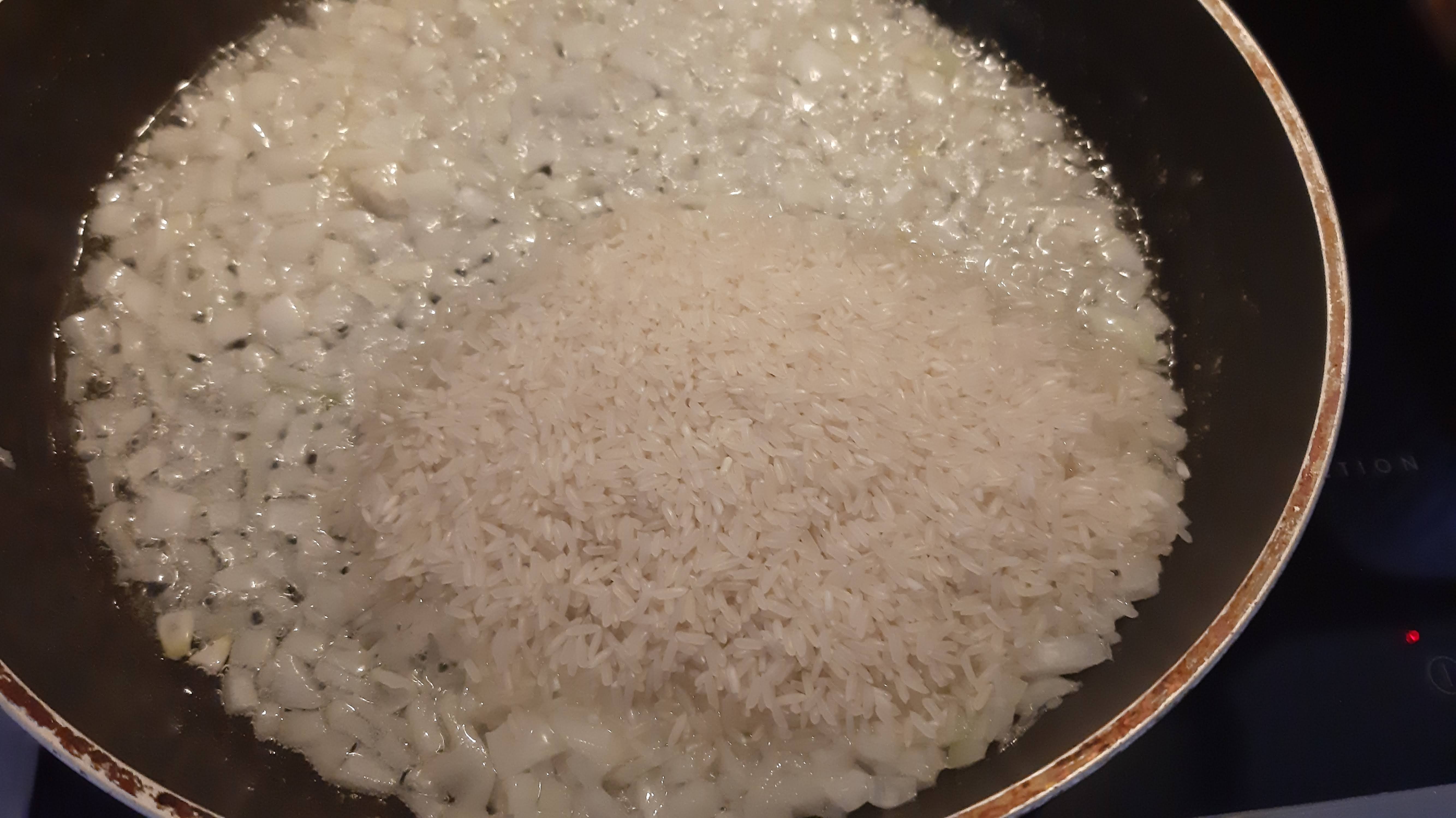 - Прибавих ориза и пържих само докато стане прозрачен, кратко.
