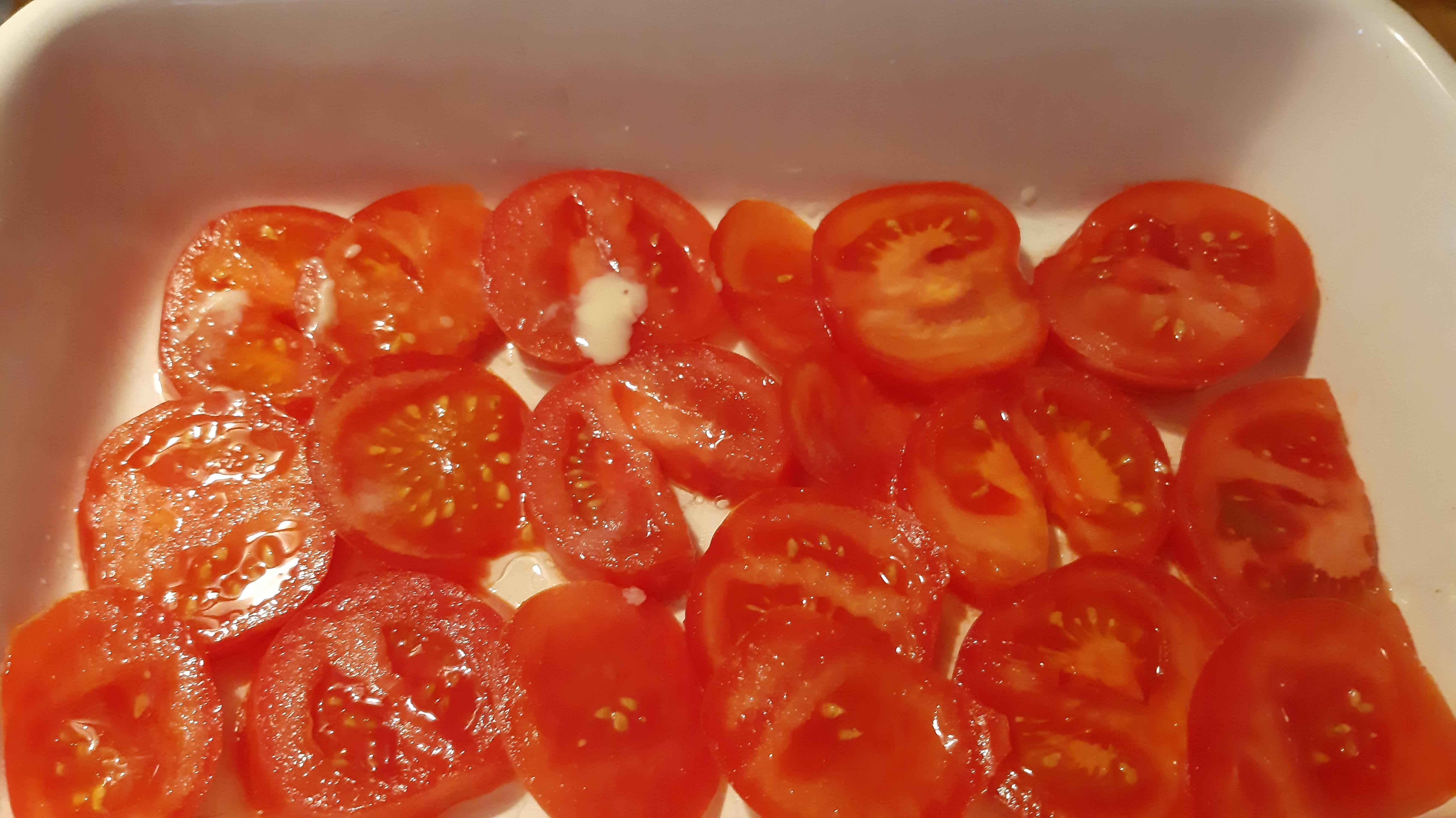 - В намазнената с останалата мазнина тавичка нареждам една трета от нарязаните на кръгчета домати.