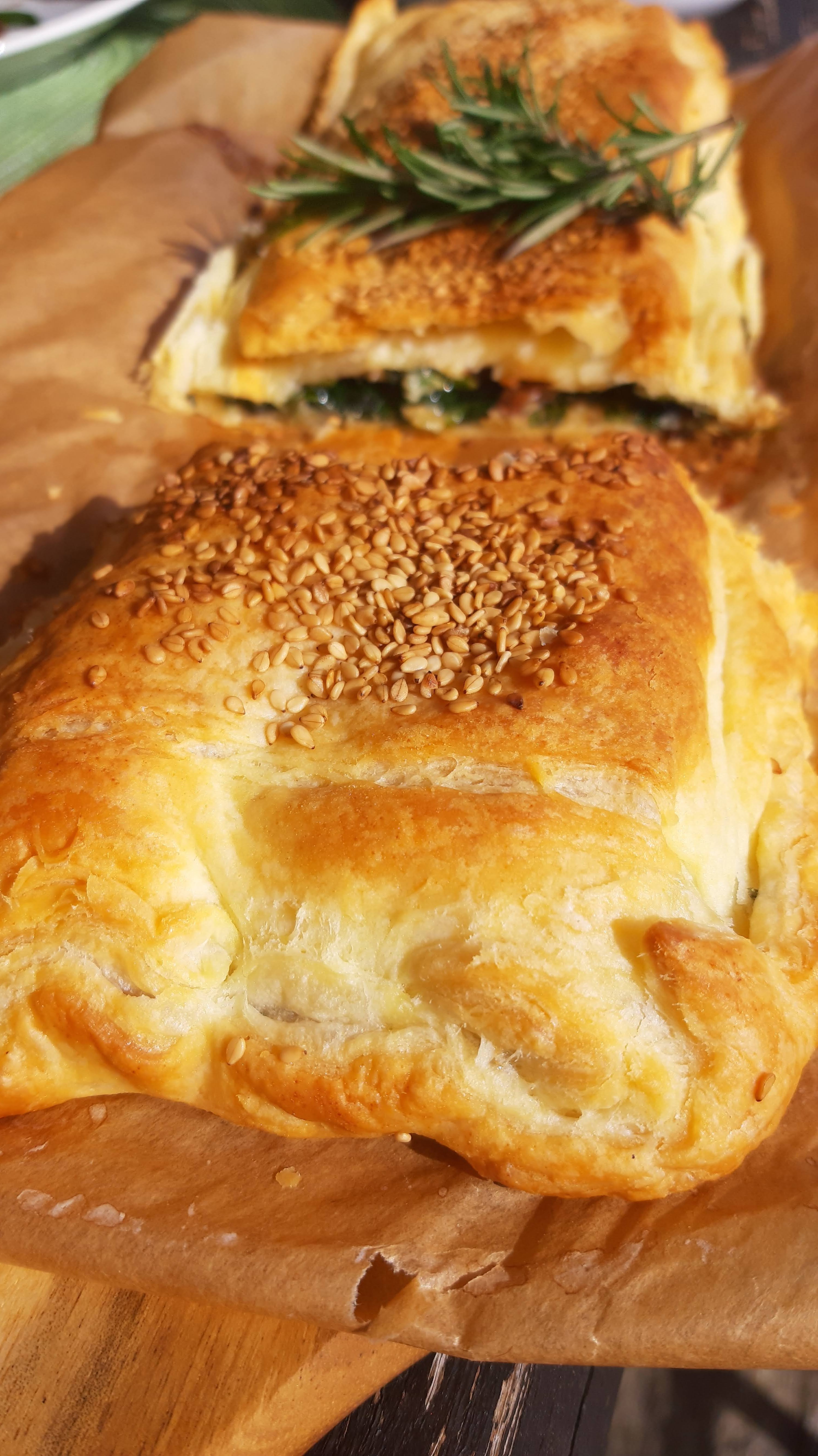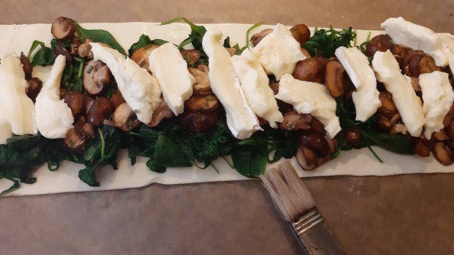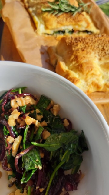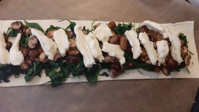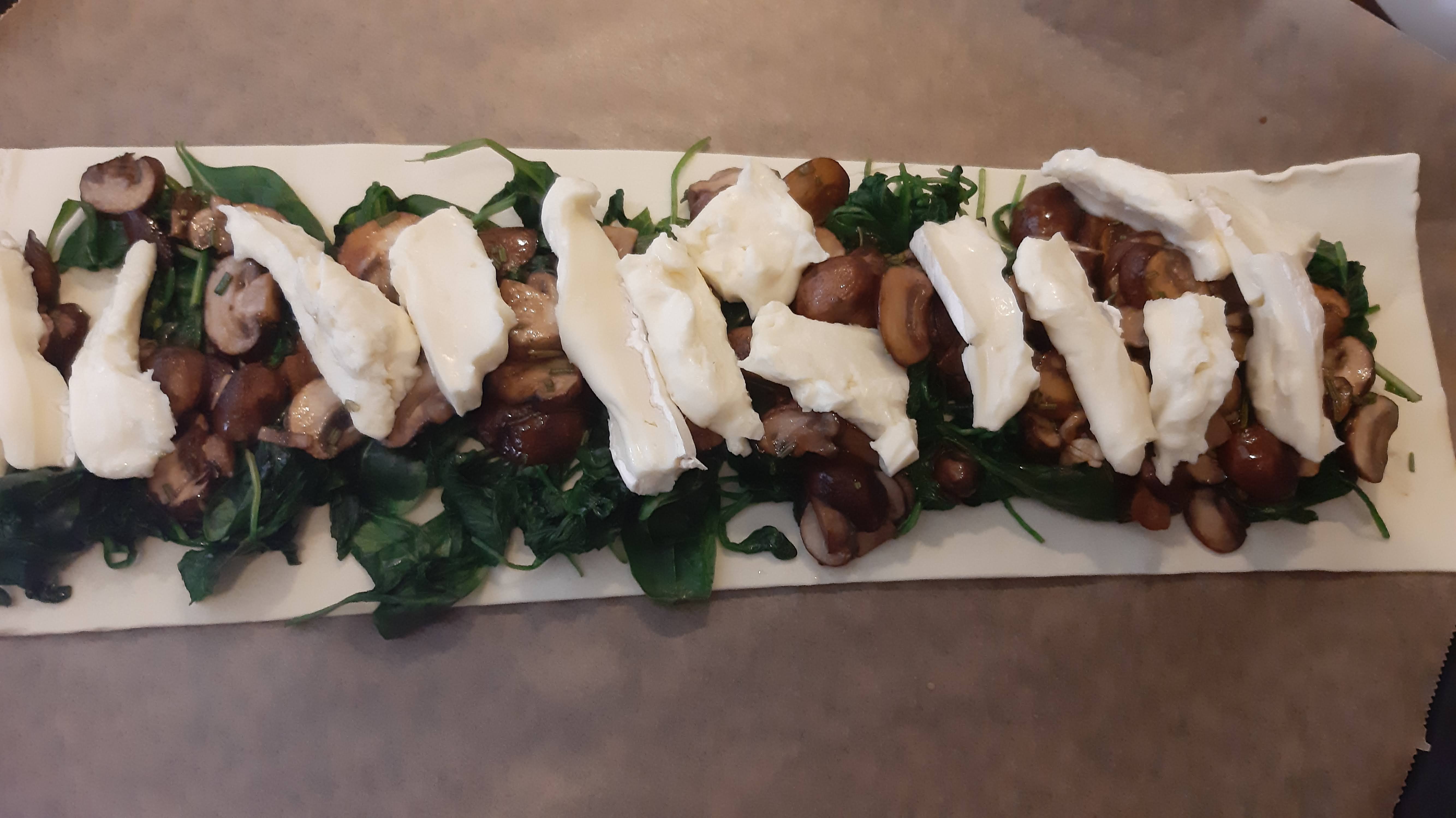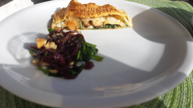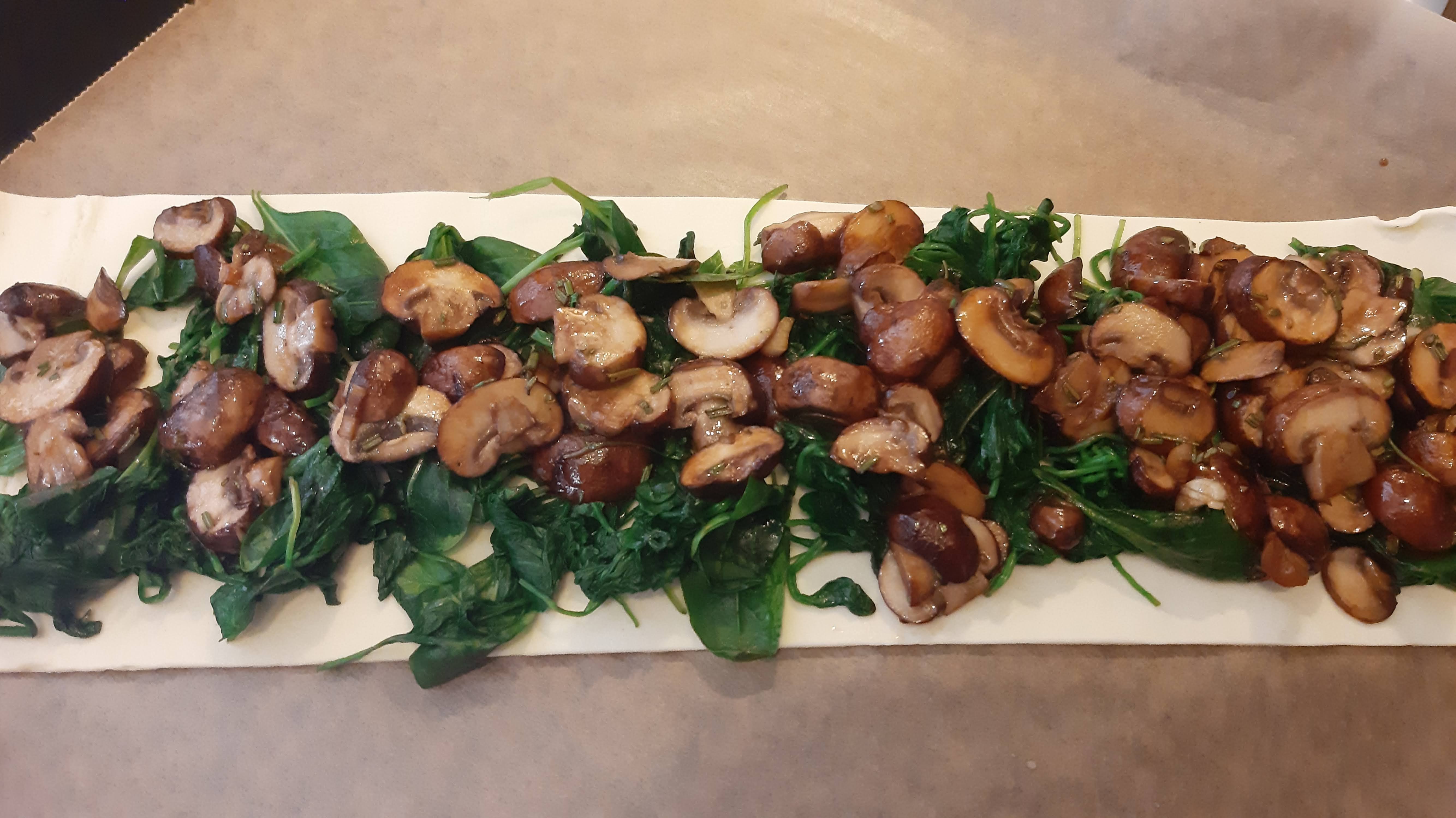 Хрупкаво и нежно многолистно тесто с много фина плънка от сирене бри, пресни гъби и спанак. Към него добавих вкусна салата с орехи и спанак. Прекрасна вегетарианска кухня.
