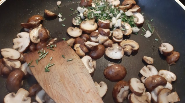 - Към края на пърженето добавих нарязания на ситно розмарин и нарязаната на филийки скилидка чесън.