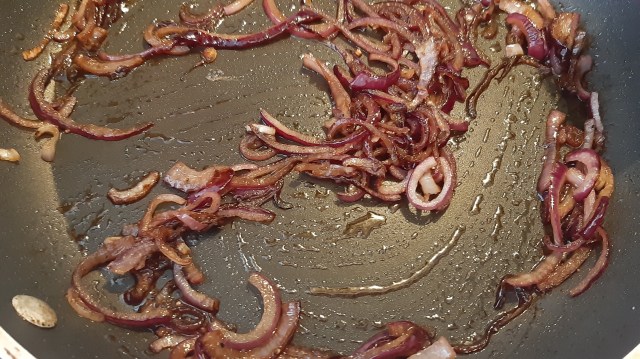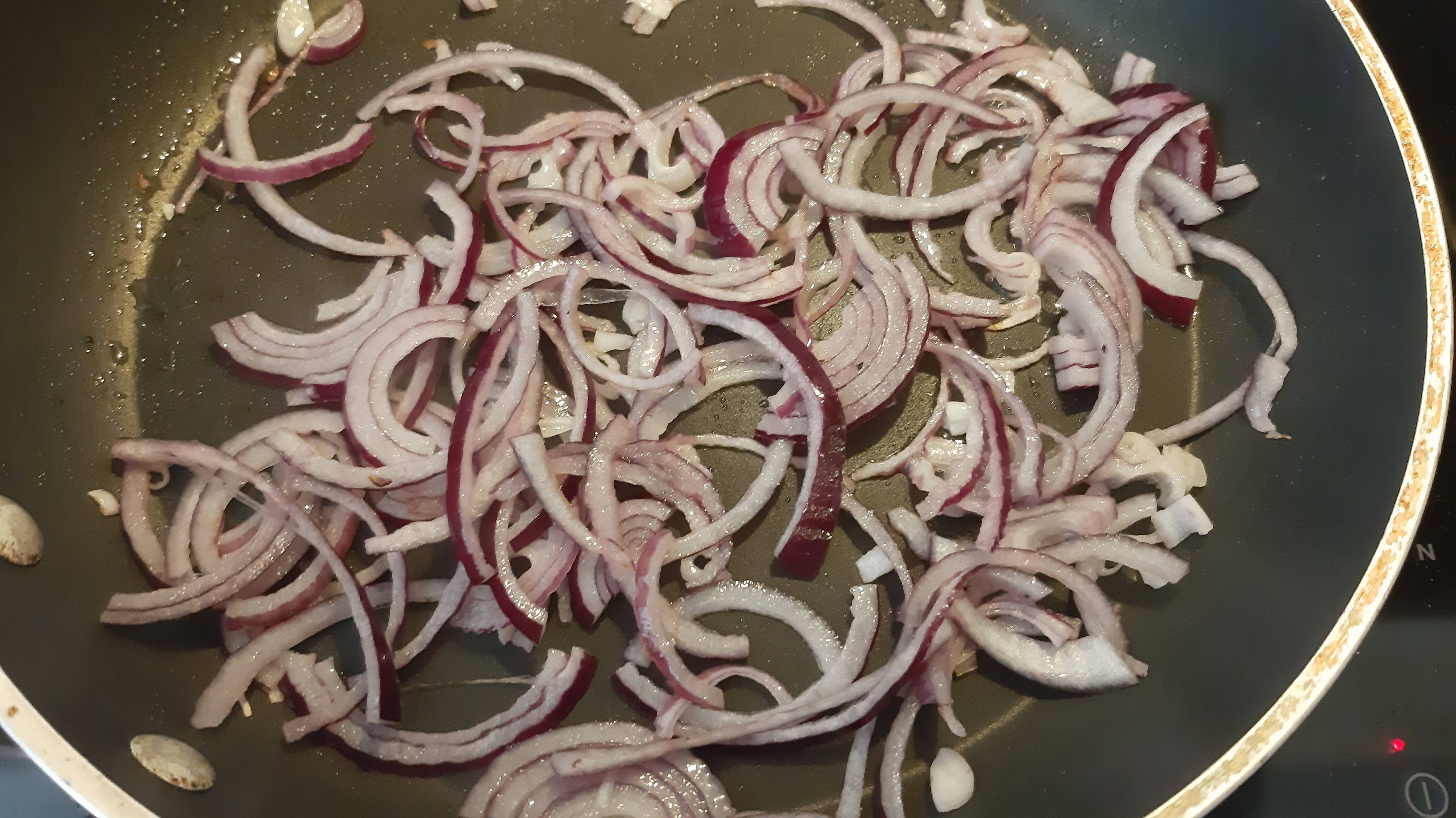 - В същия тиган сипах 1 с. л. олио и на средна мощност на котлона пържих нарязания на ленти червен лук или до неговото омекване.