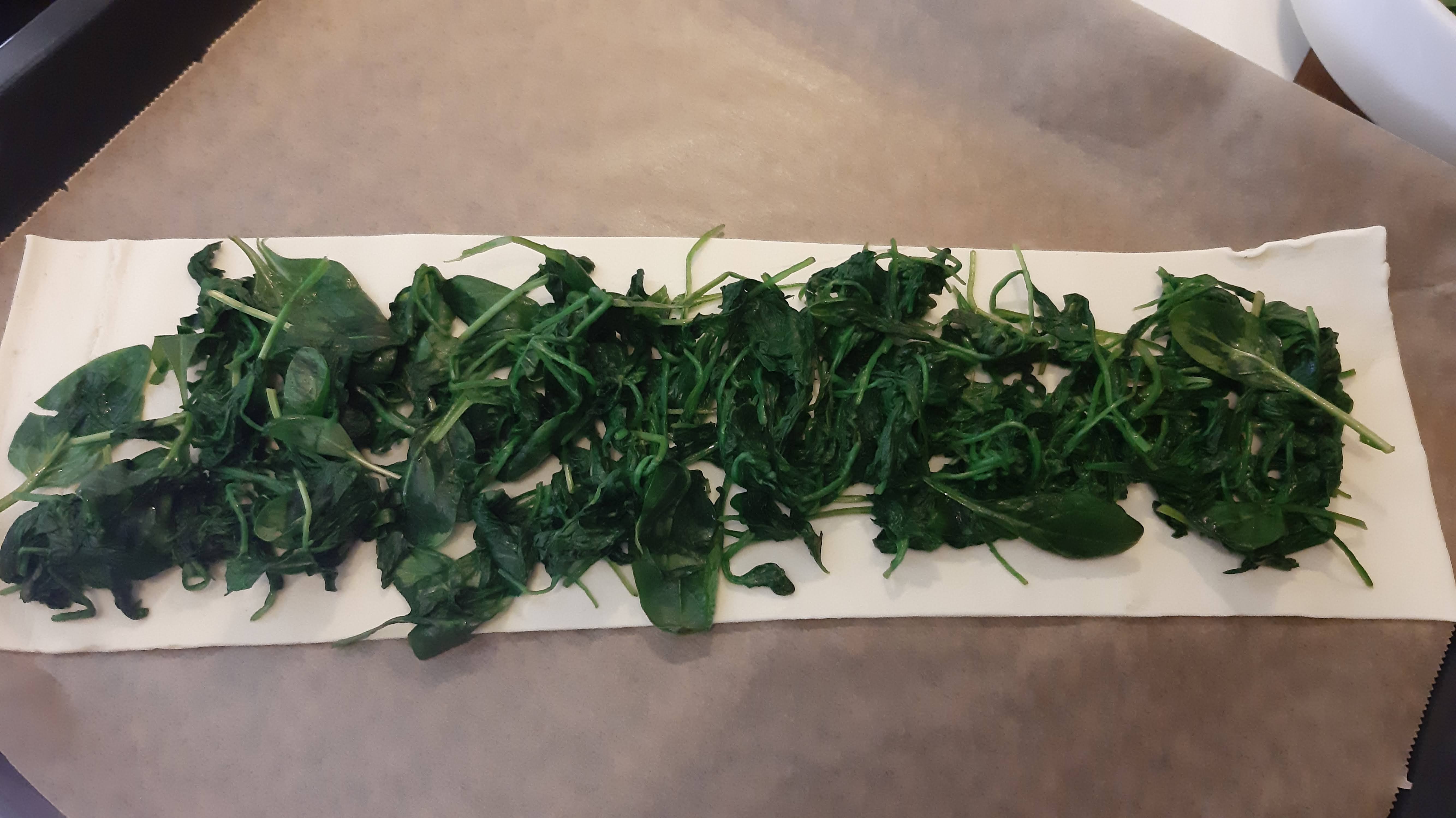 - Върху него подредих добре отцедения спанак като оставях около 2 см от всички страни свободни от плънка.