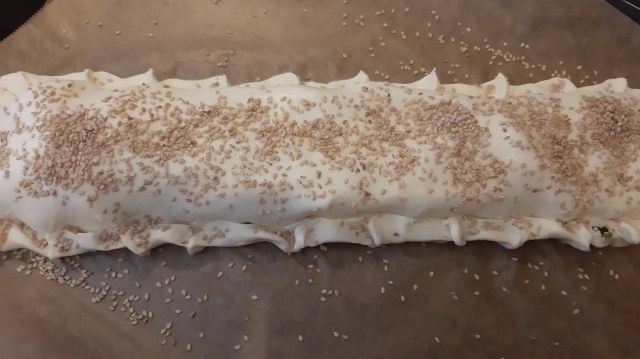 - Намазах щрудела с вода и поръсих обилно със сусам.
