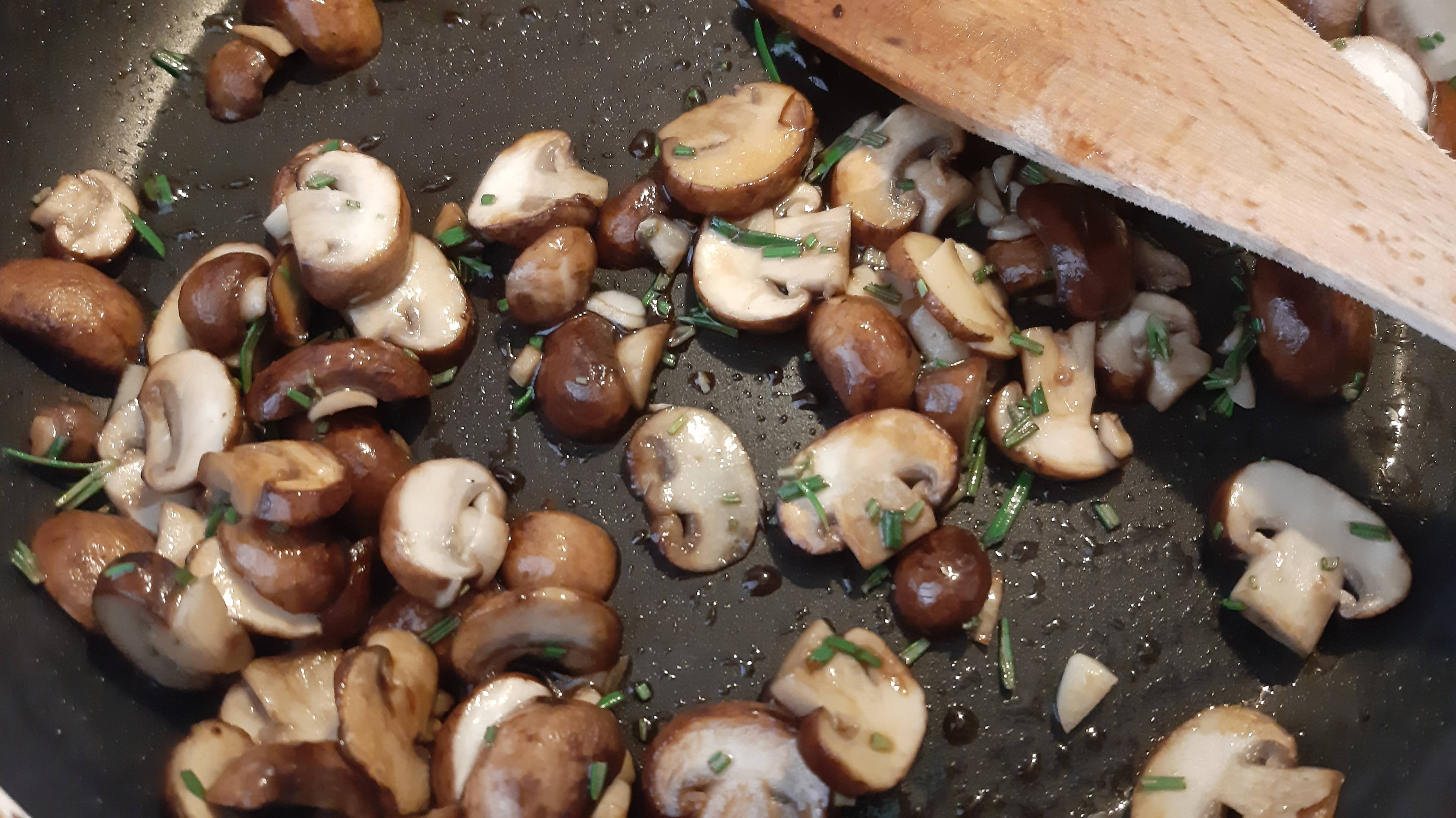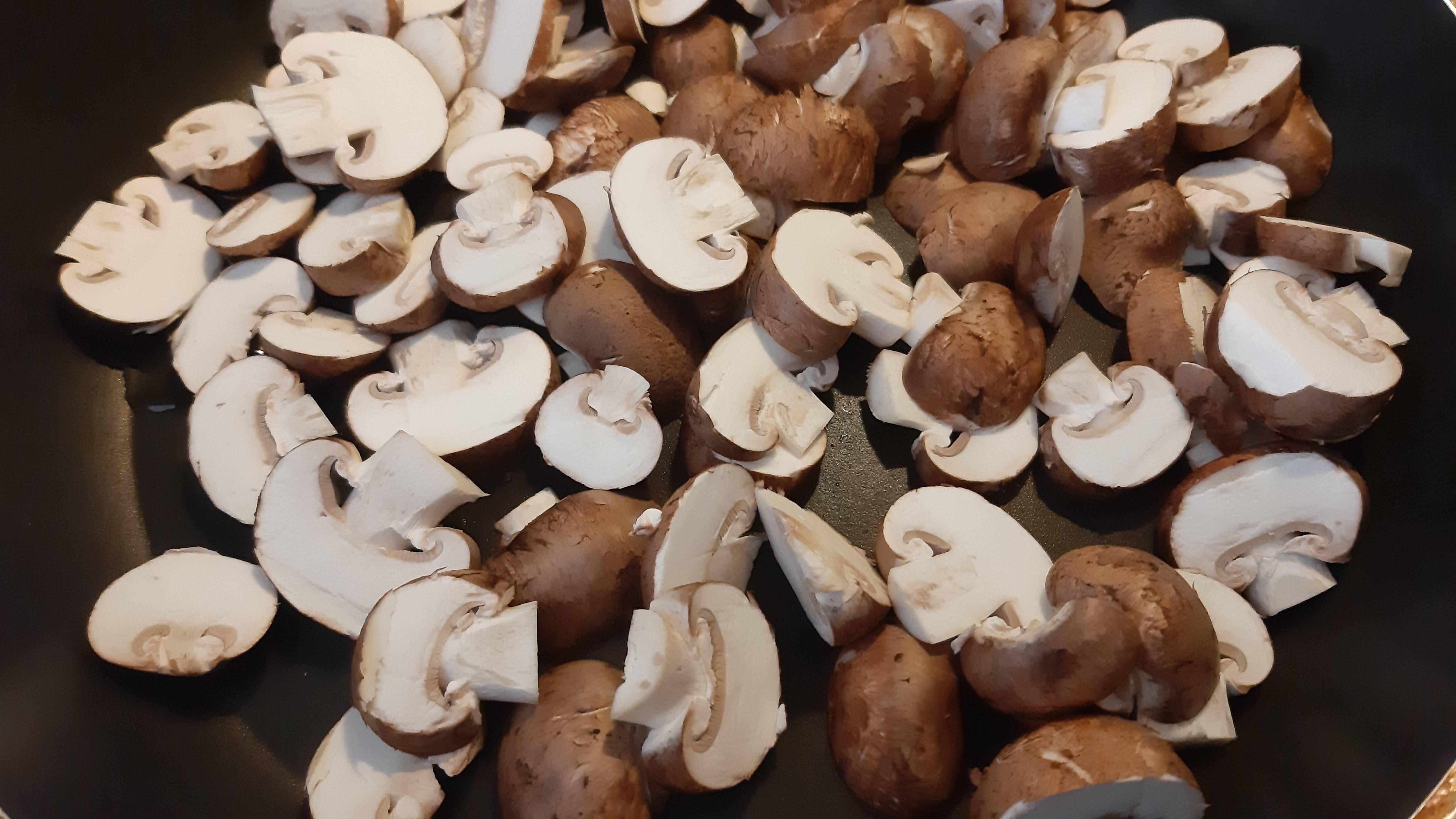 - В тиган загрях 1 с. л. олио и изпържих на силен огън гъбите до златист цвят.