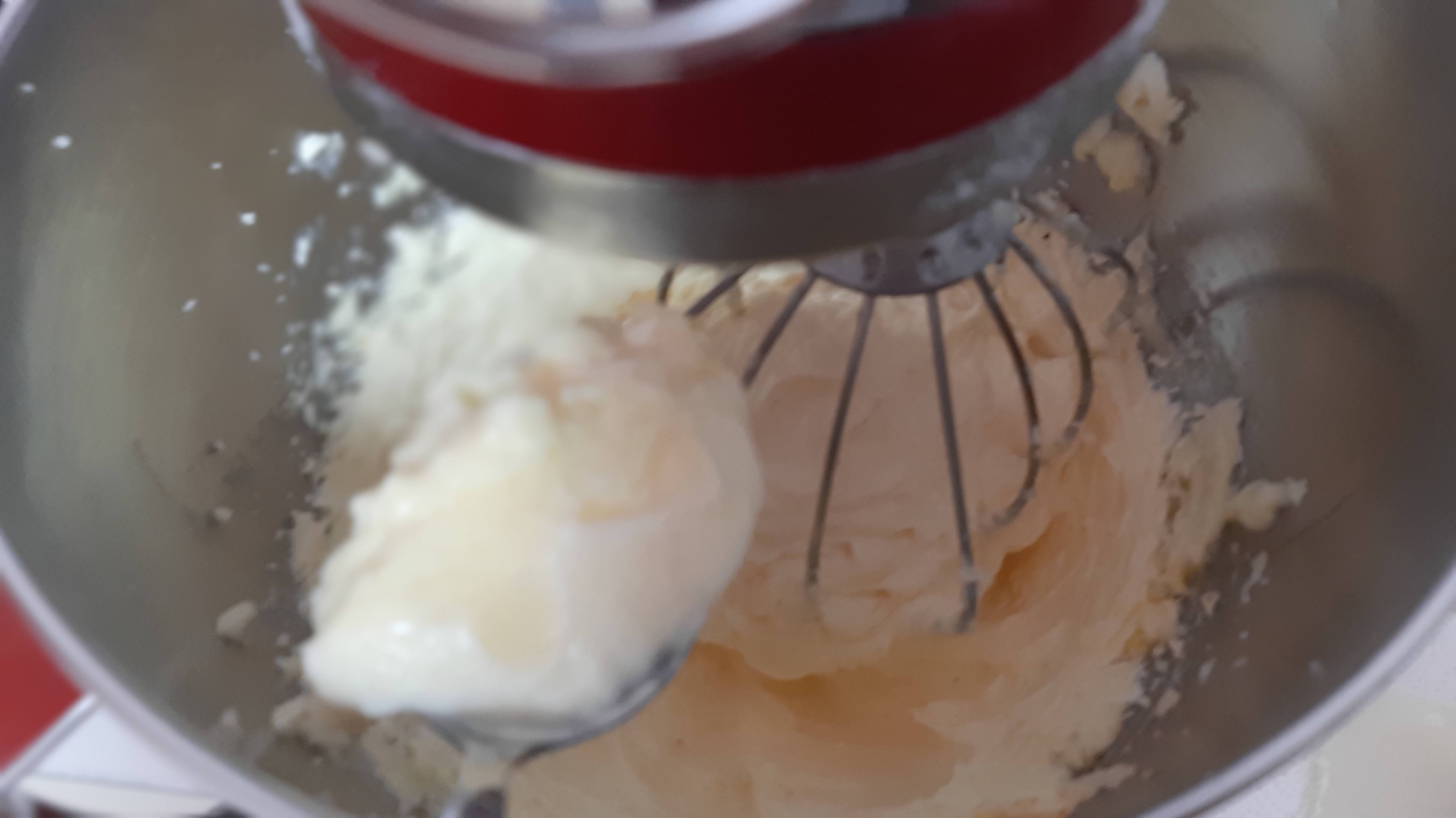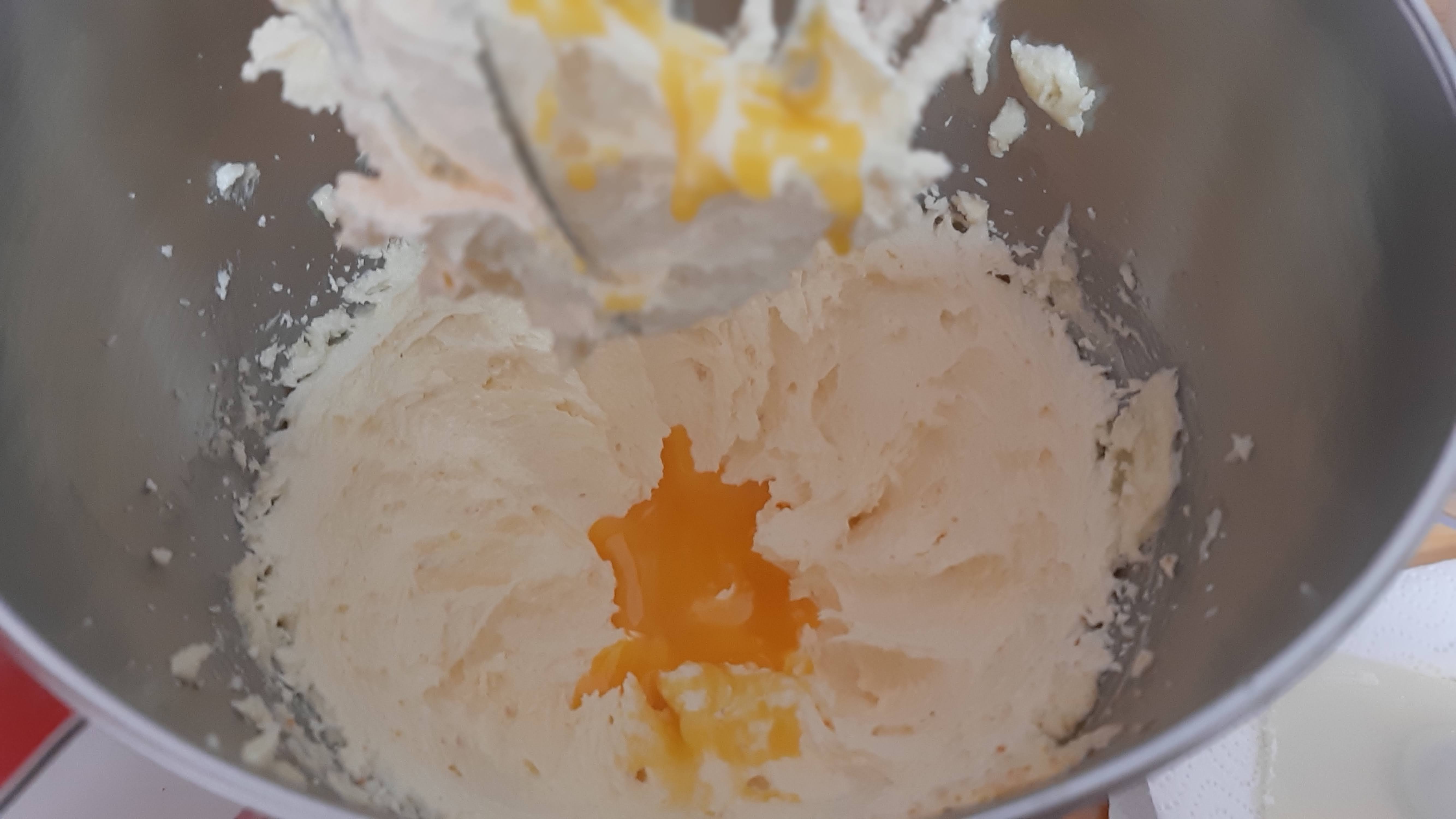 - След това започнах да добавям един по един жълтъците. Първо един, разбивам, втори разбивам, трети и другата половина от кората на лимона.