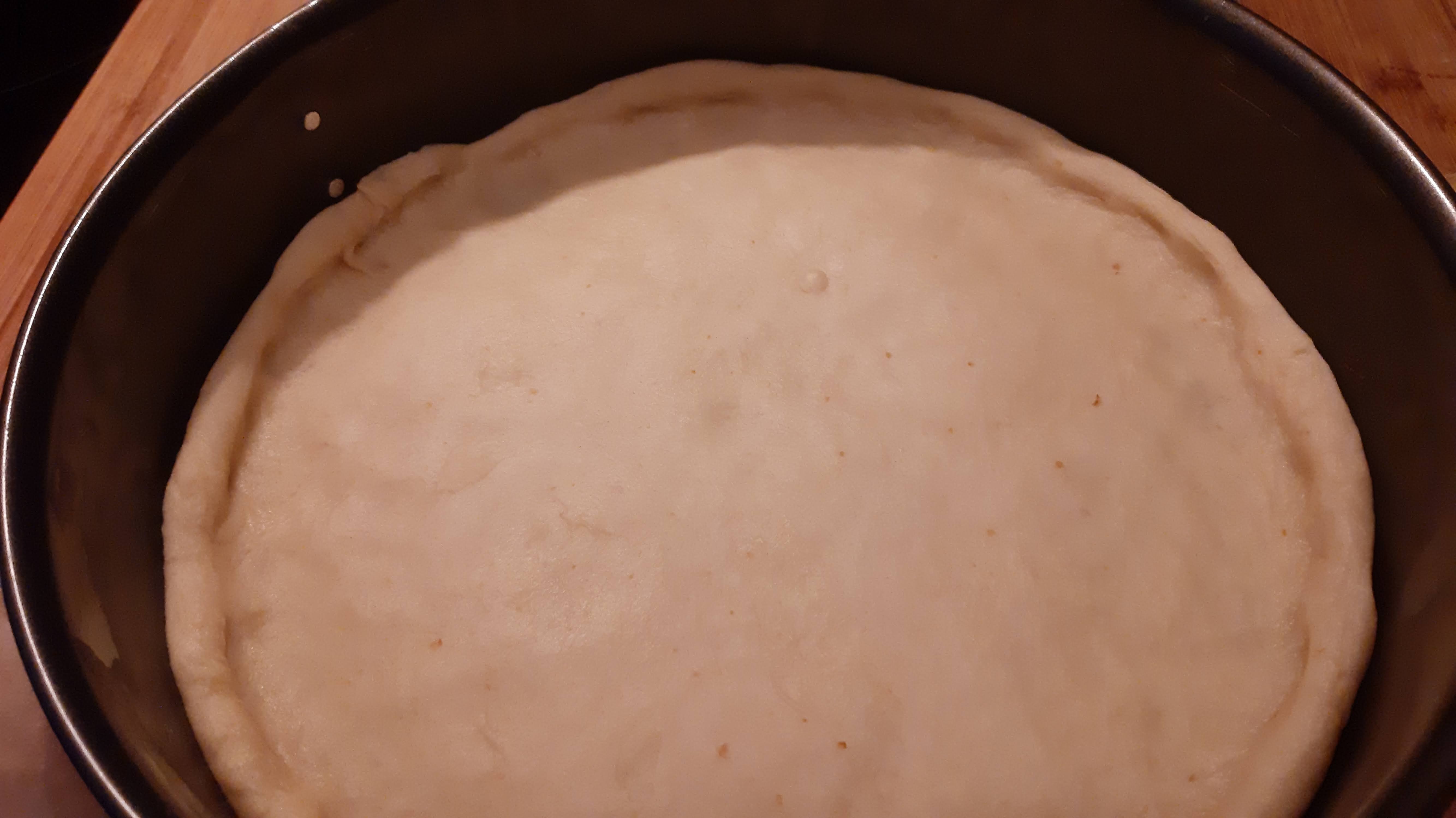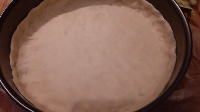 - Готовото тесто разточих с размер малко по-голям от дъното на формата и прехвърлих в нея.