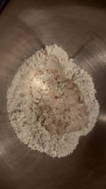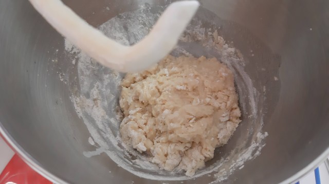 - За целта отмервам брашното в купата на миксера, добавям солта и разбърквам. Правя кладенче в брашното, натрошавам маята и размесвам заедно с 1 с. л. захар, и 3 с. л. от топлото прясно мляко.
