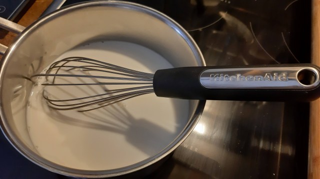 - Слагам останалото мляко на котлона и малко преди да заври добавям разтворения прах.
