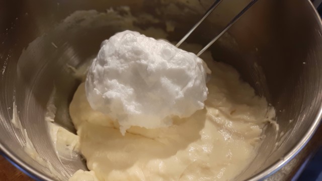 - Най-накрая и без миксер, а само с тел добавям белтъците.
