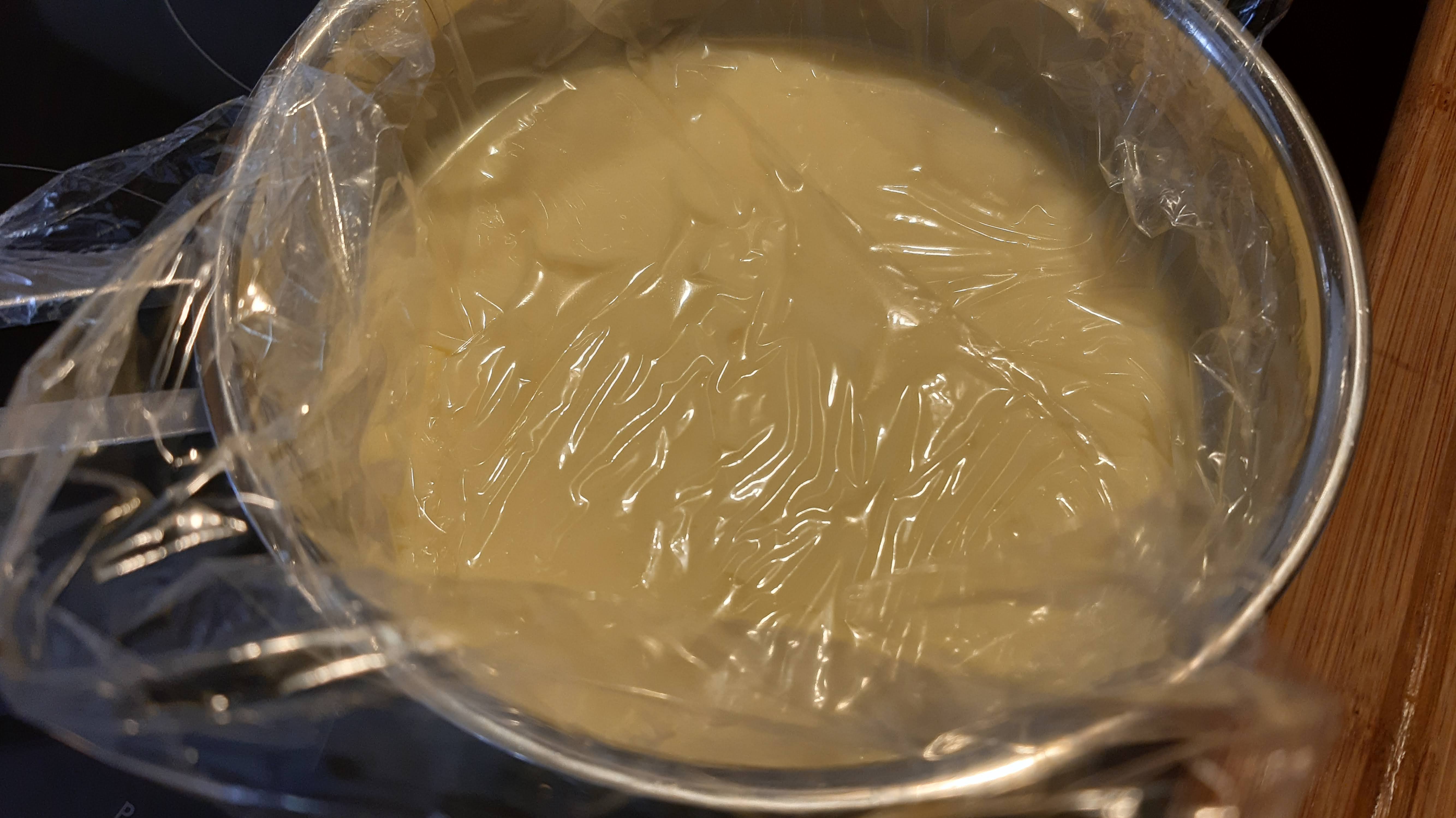 - Веднага дърпам от котлона и покривам с фолио за свежо съхранение така, че да се залепи за крема.