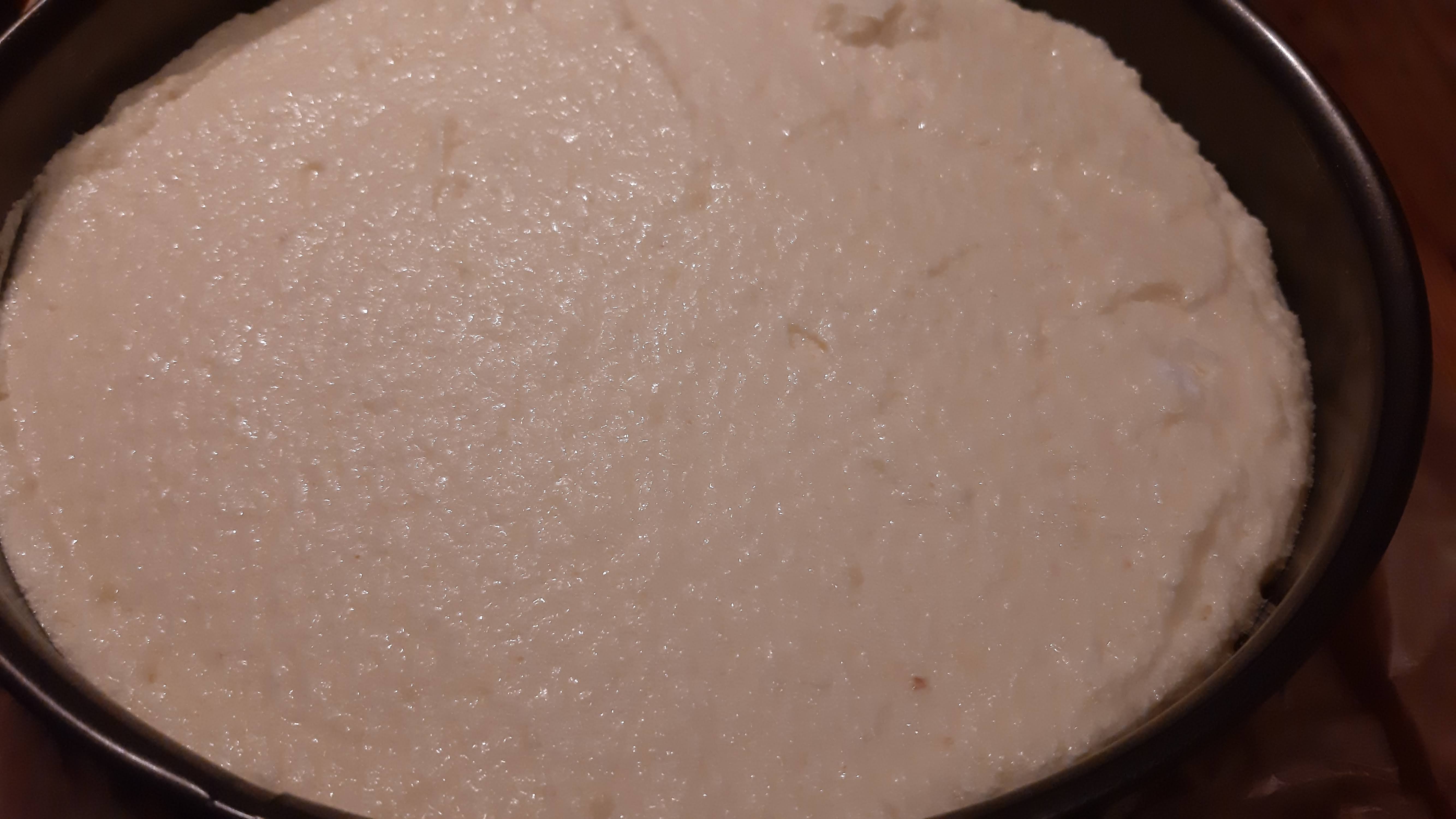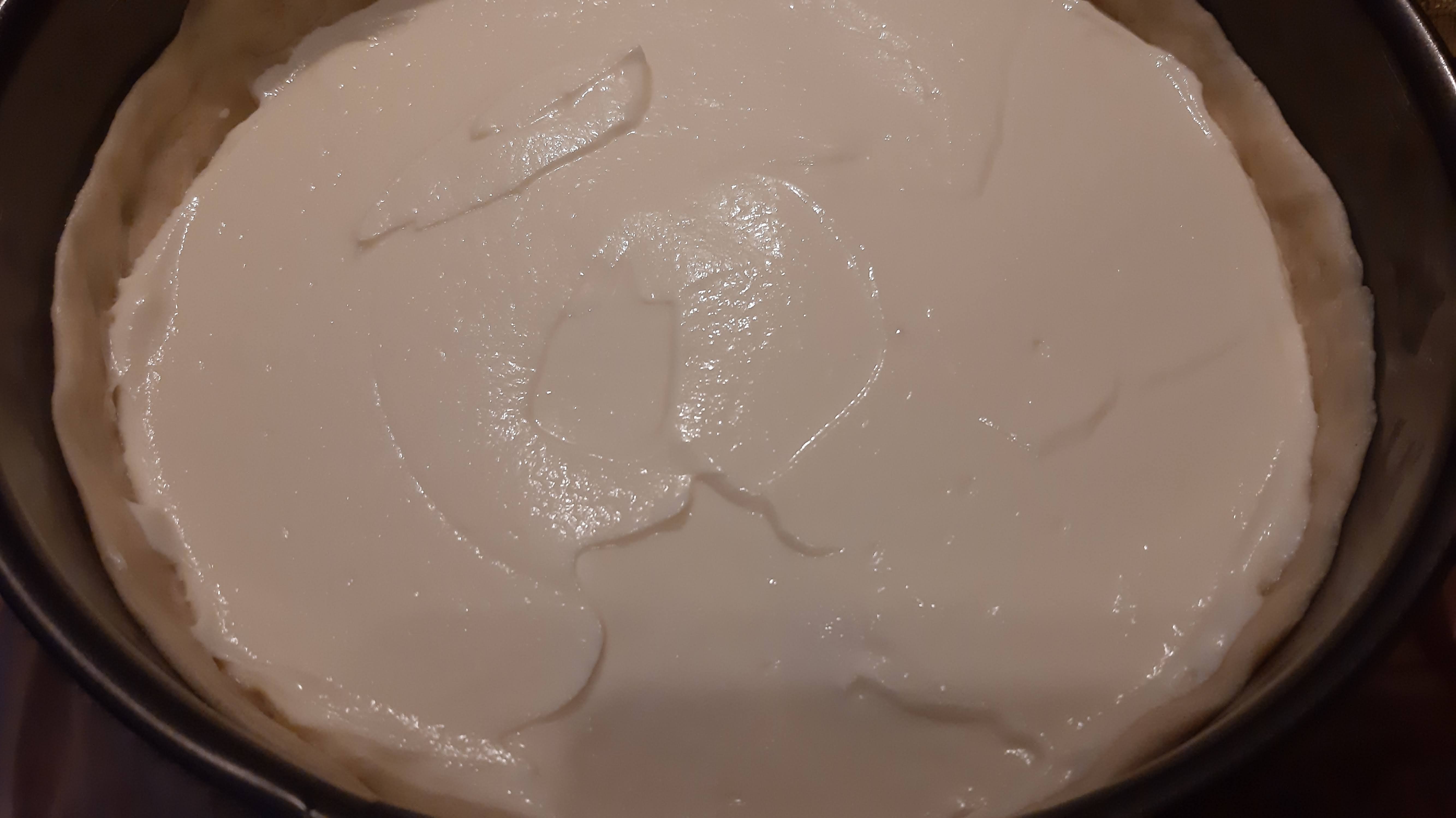 - Изсипах върху тестото и загладих.