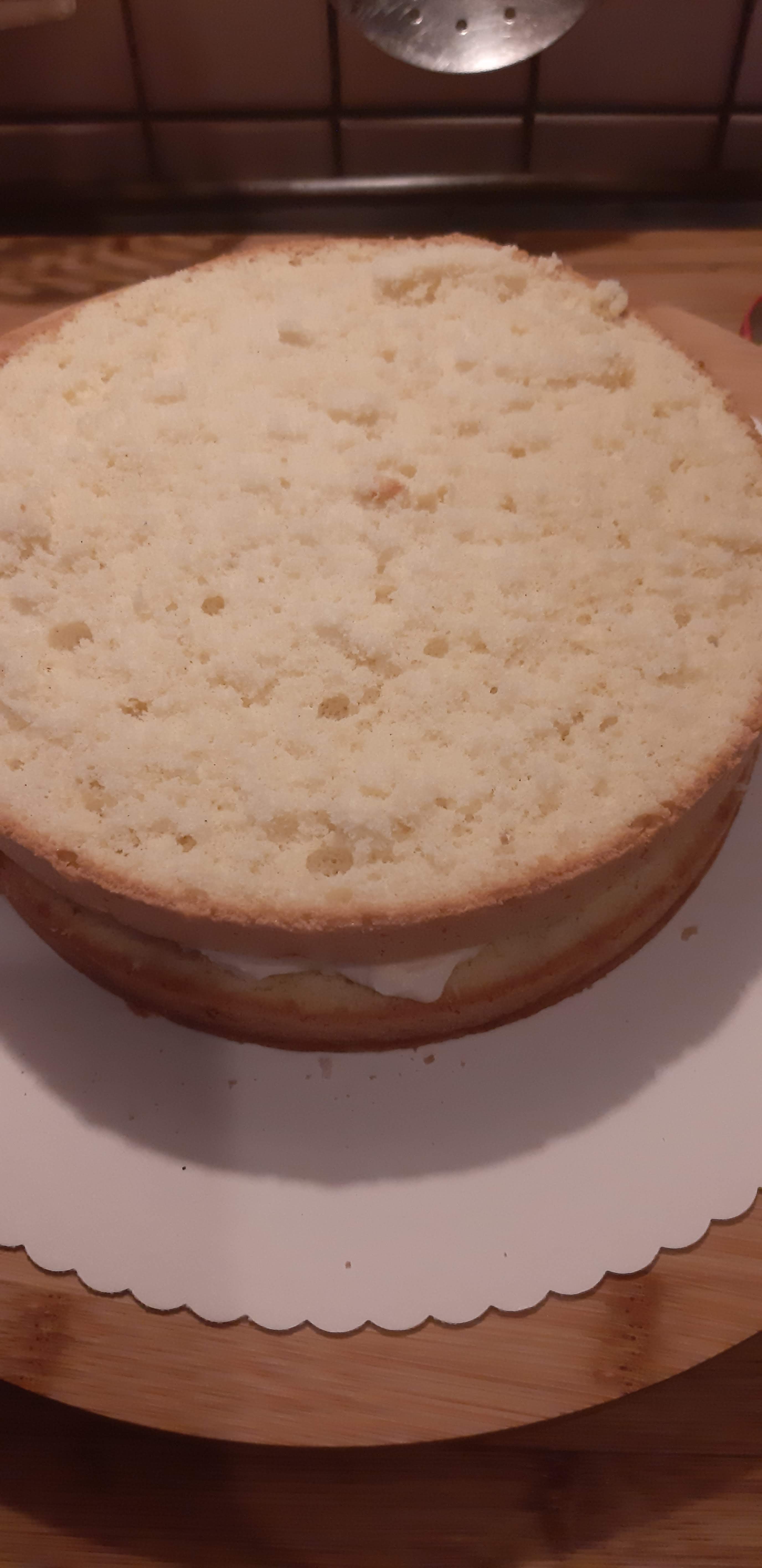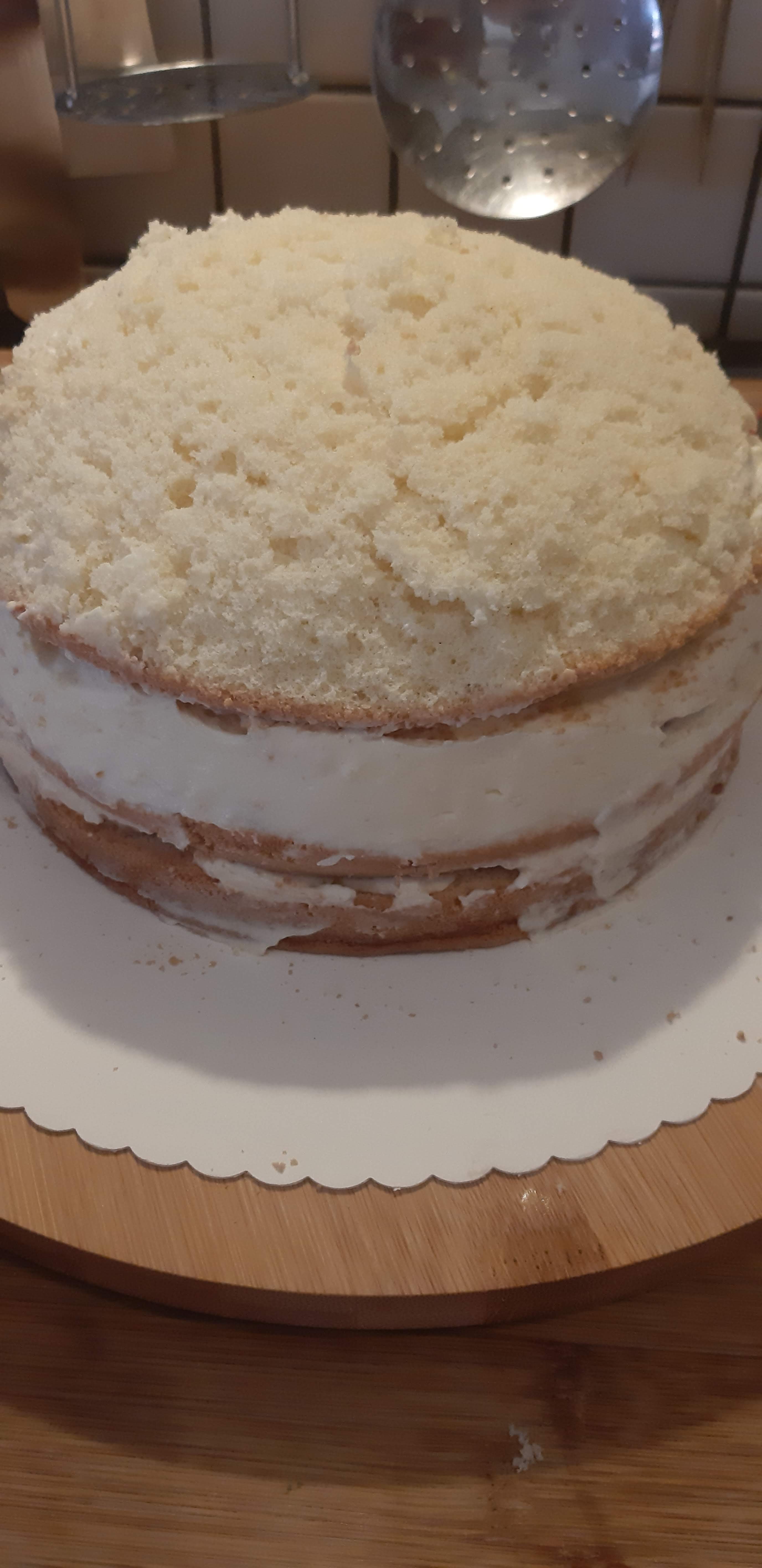 - Покрих с 1/3 от крема като отново оставих 1 см място от ръба на блата и покрих с втория по-дебел блат.