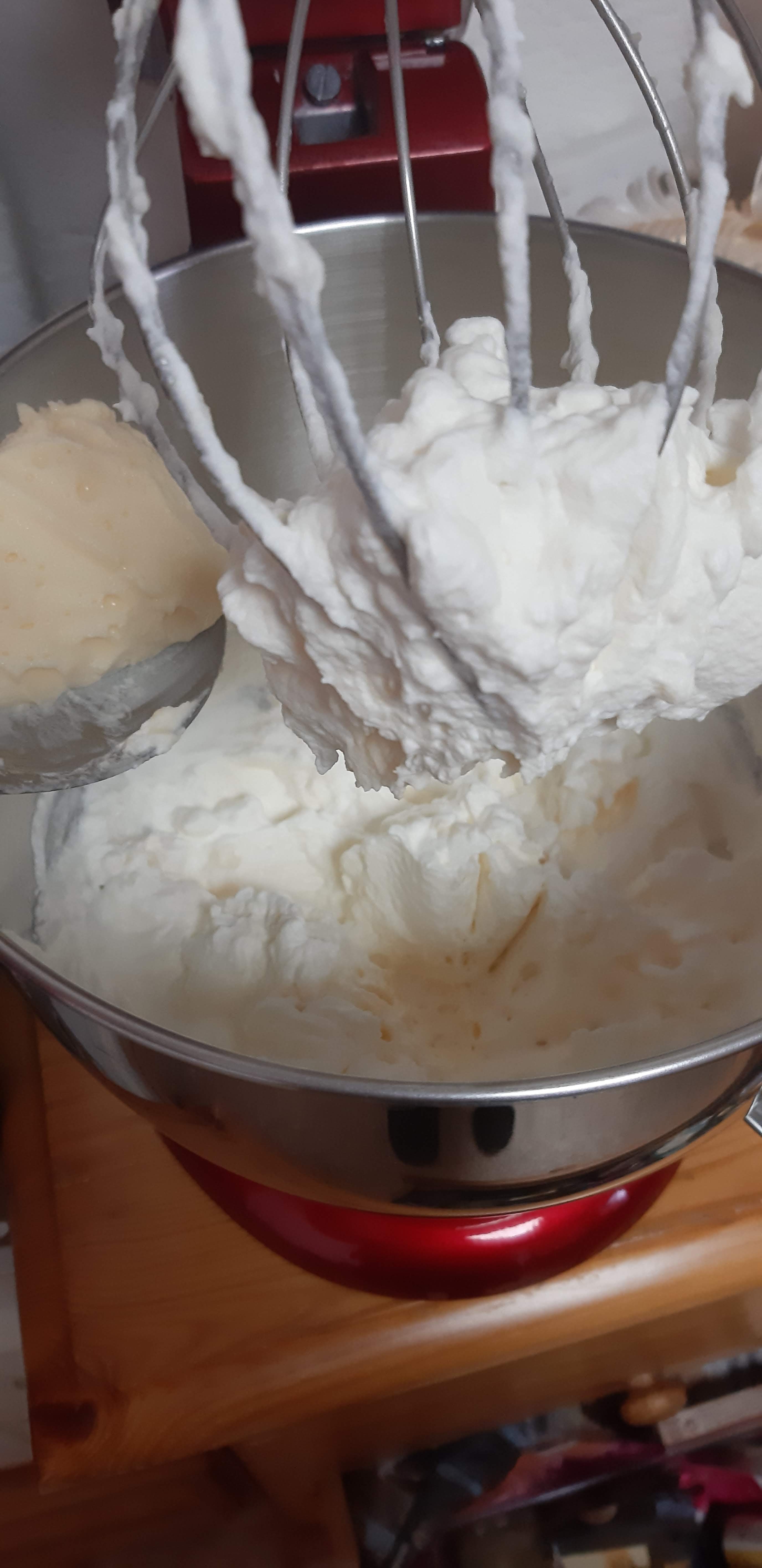 - Когато сметаната се сгъсти, добавих към нея лъжица по лъжица от сгъстения и охладен яйчен крем.