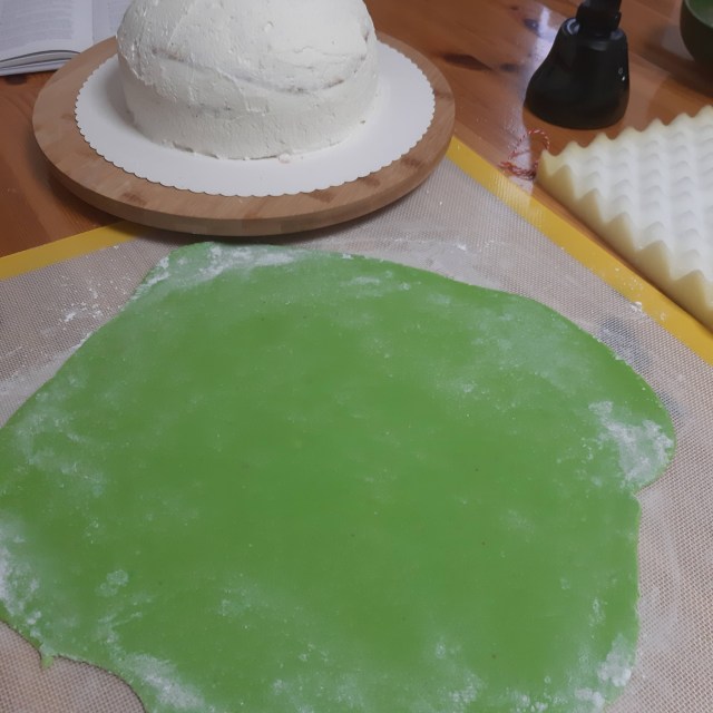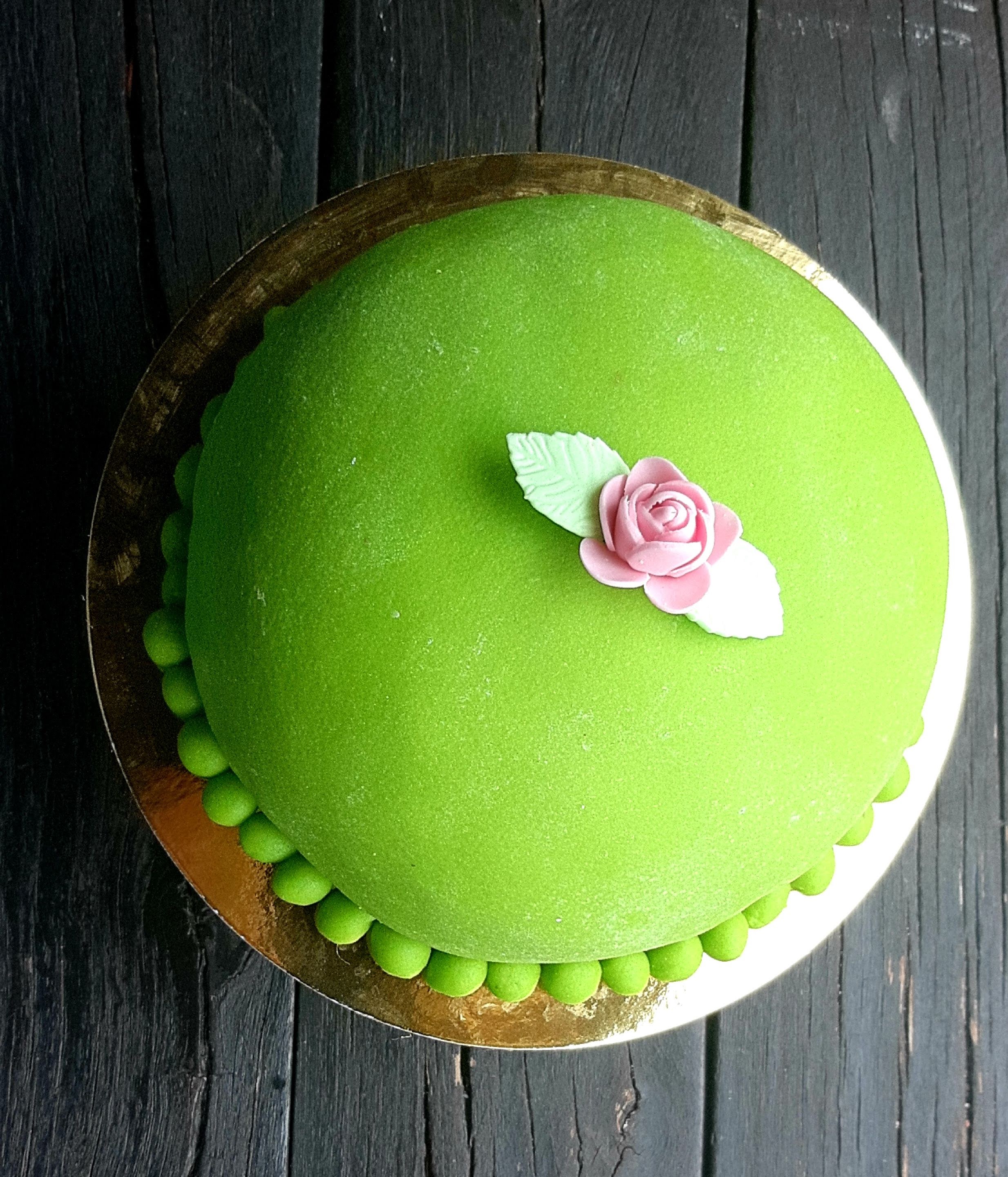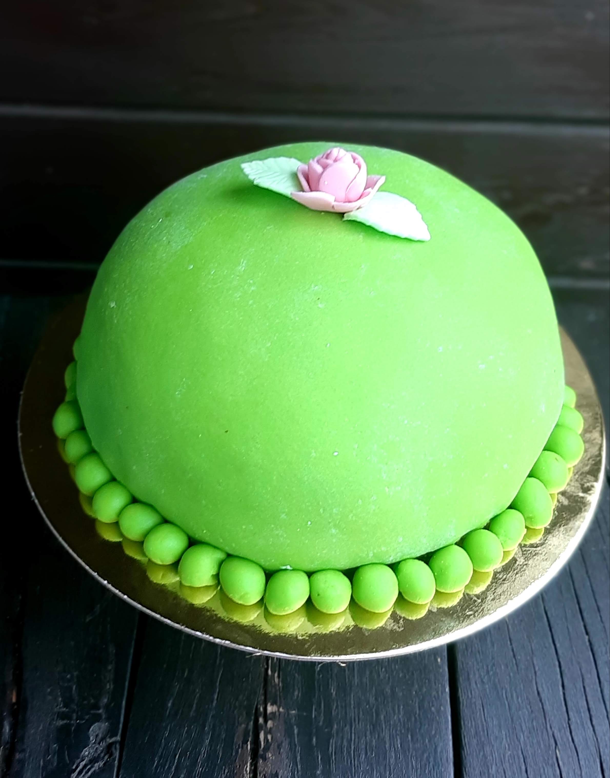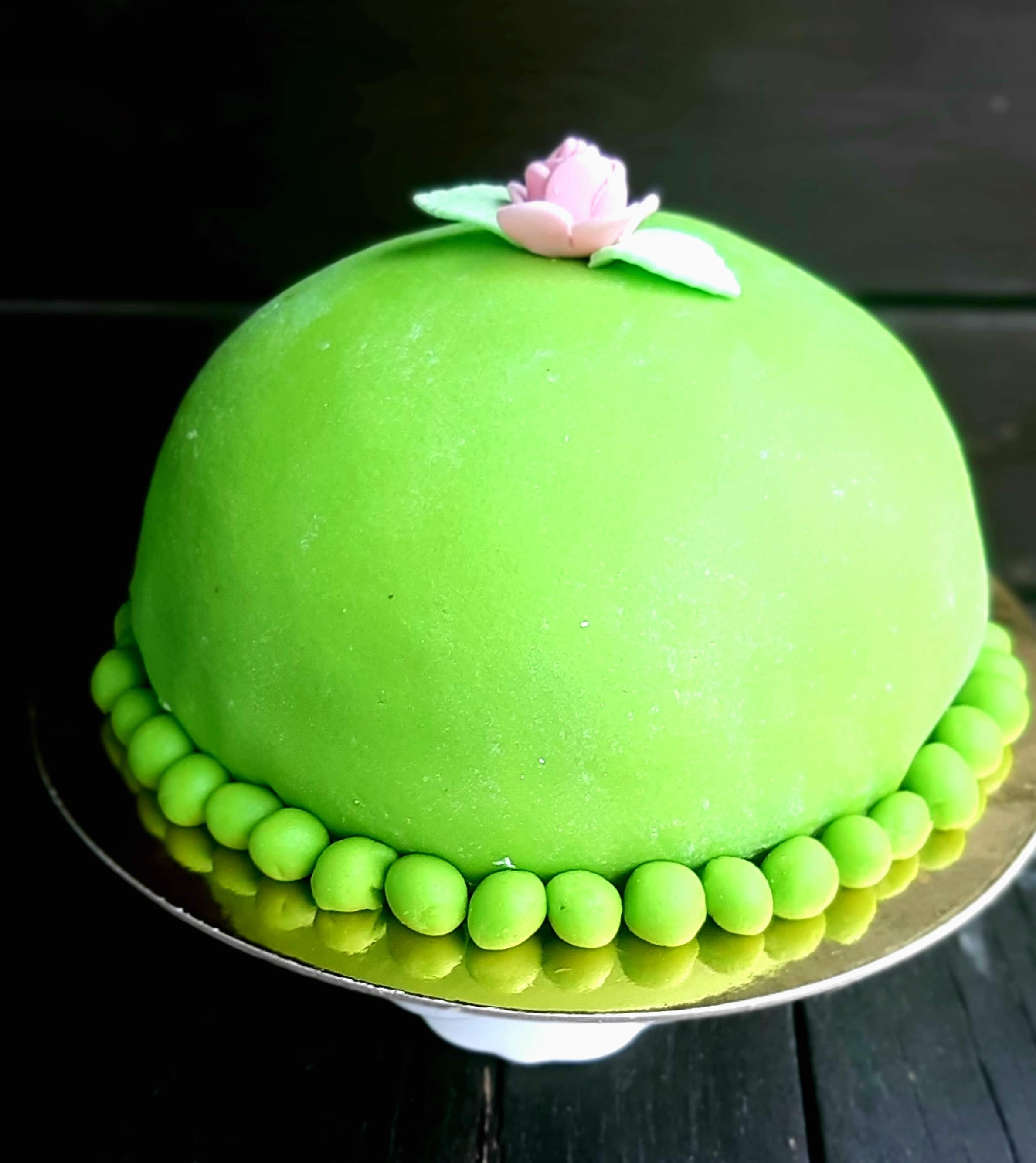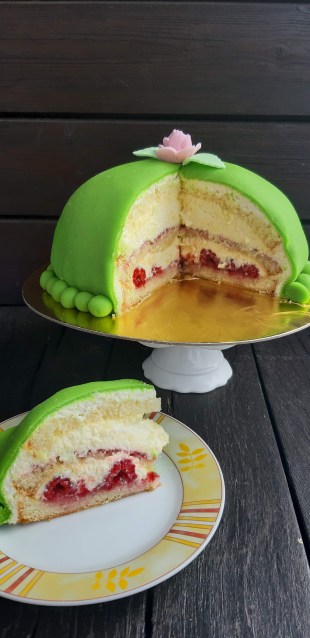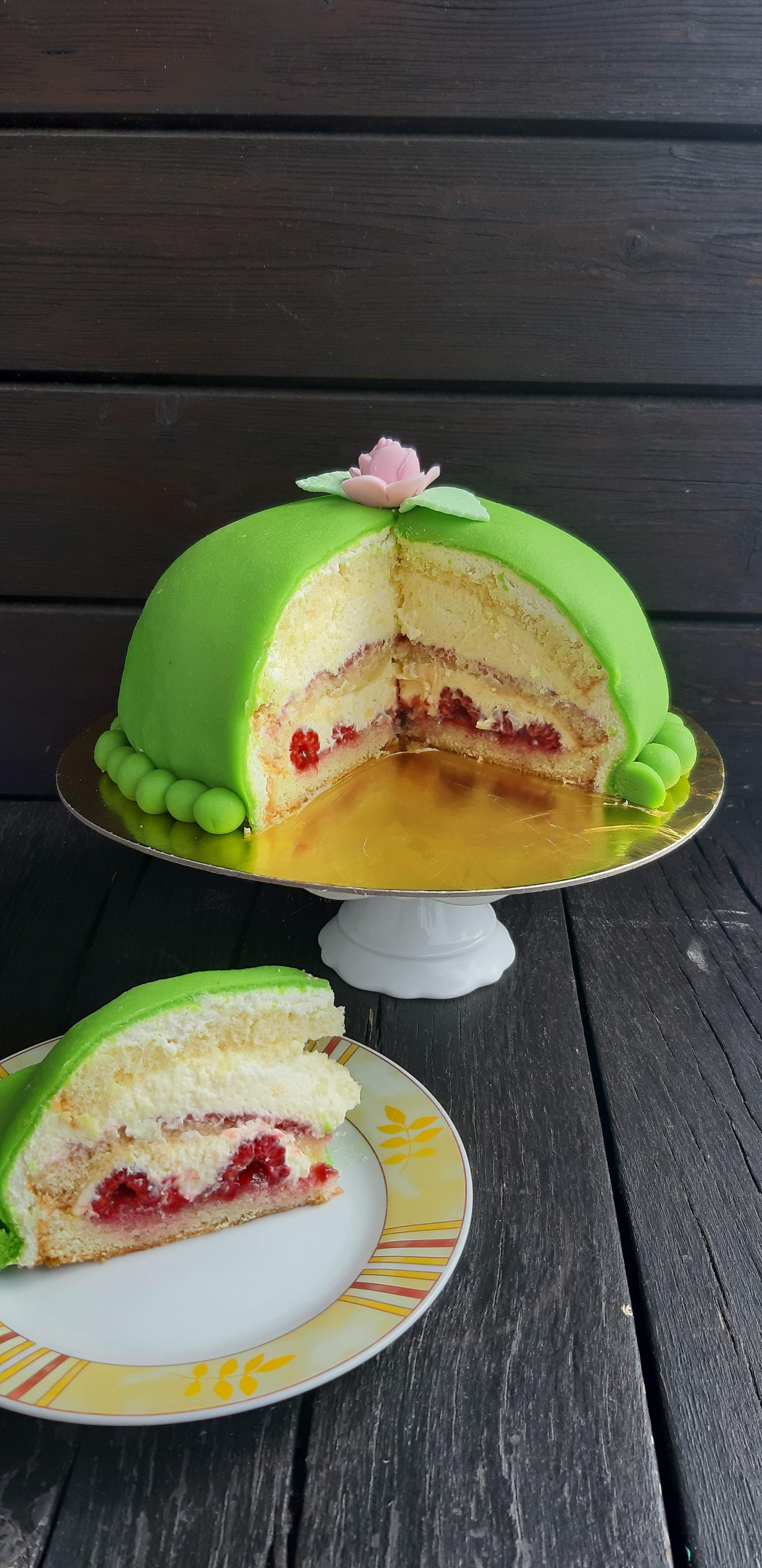 За тези, които ме питат дали не се разстопява зеления капак от сметаната. Не! Не се разтопява, защото това е тесто от марципан. Даже стават стегнат от стоенето в хладилник. А съвсем малкото присъствие на захар в крема, правят тортата изключително лека и до детайли съчетана и завършена.