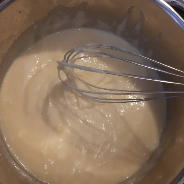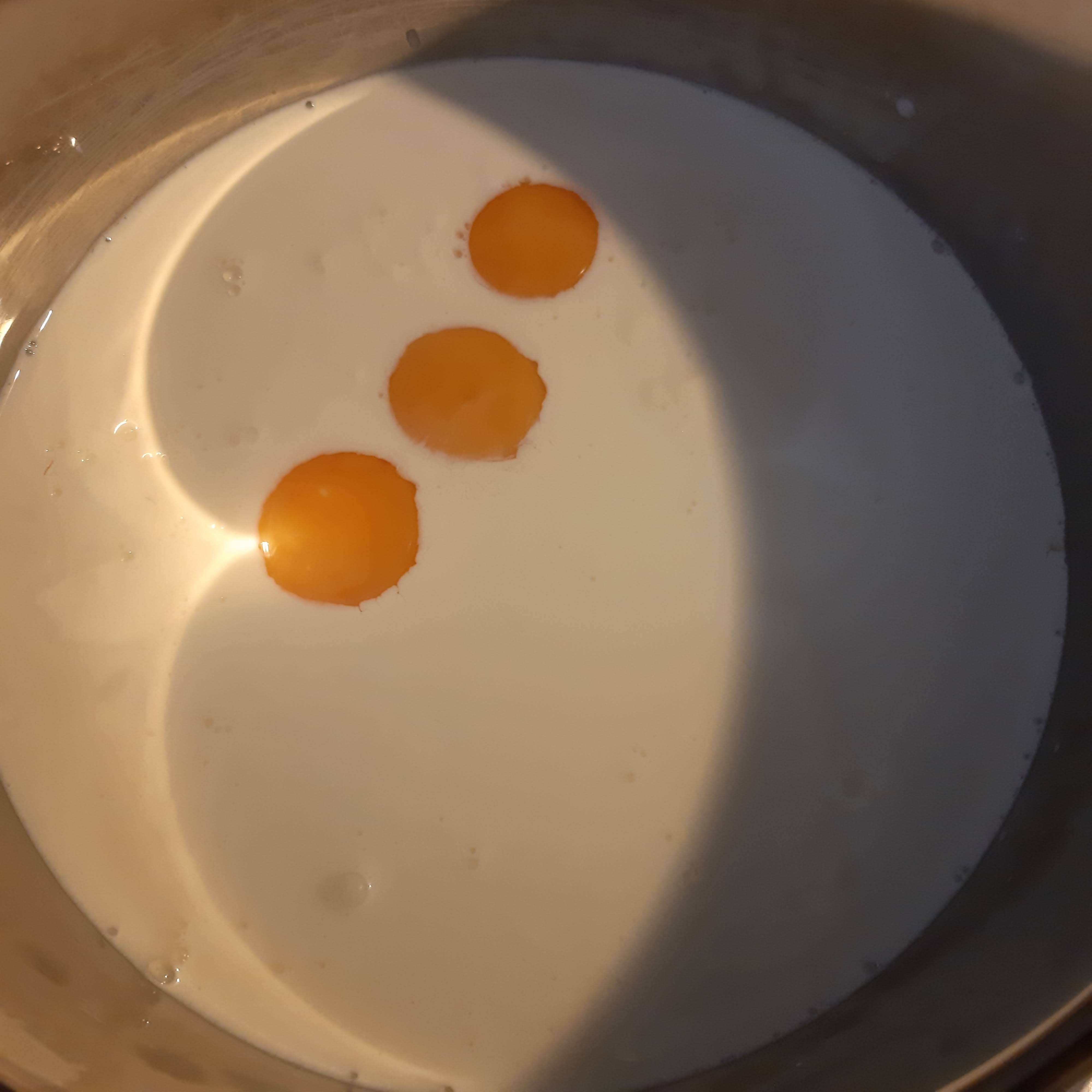 - За целта в тенджерка смесвам млякото, 225 г от сметаната, захарта, жълтъците и картофеното брашно.