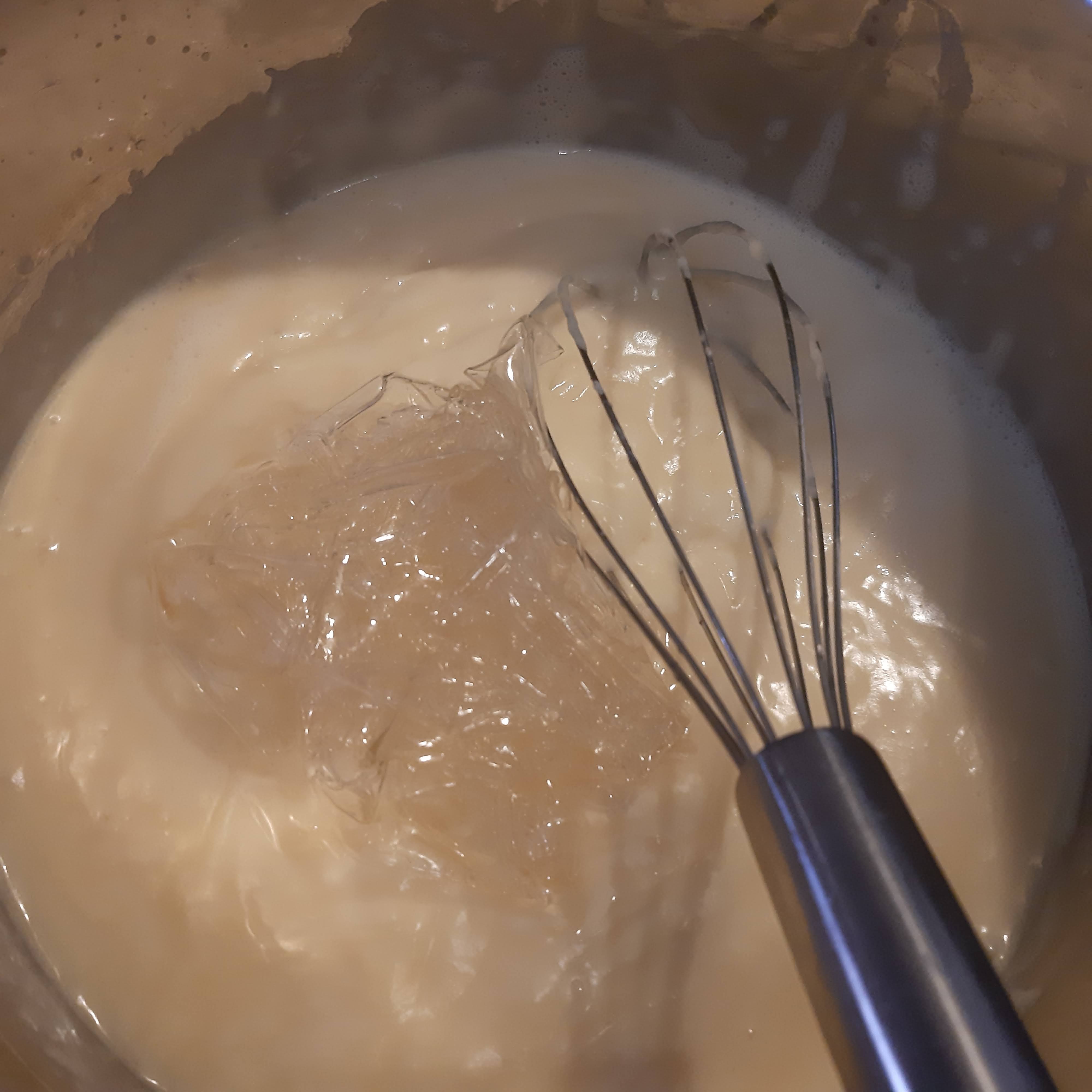- Изтисквам набъбналия желатин и добавям към горещия крема. Разбърквам до пълното му разтопяване.