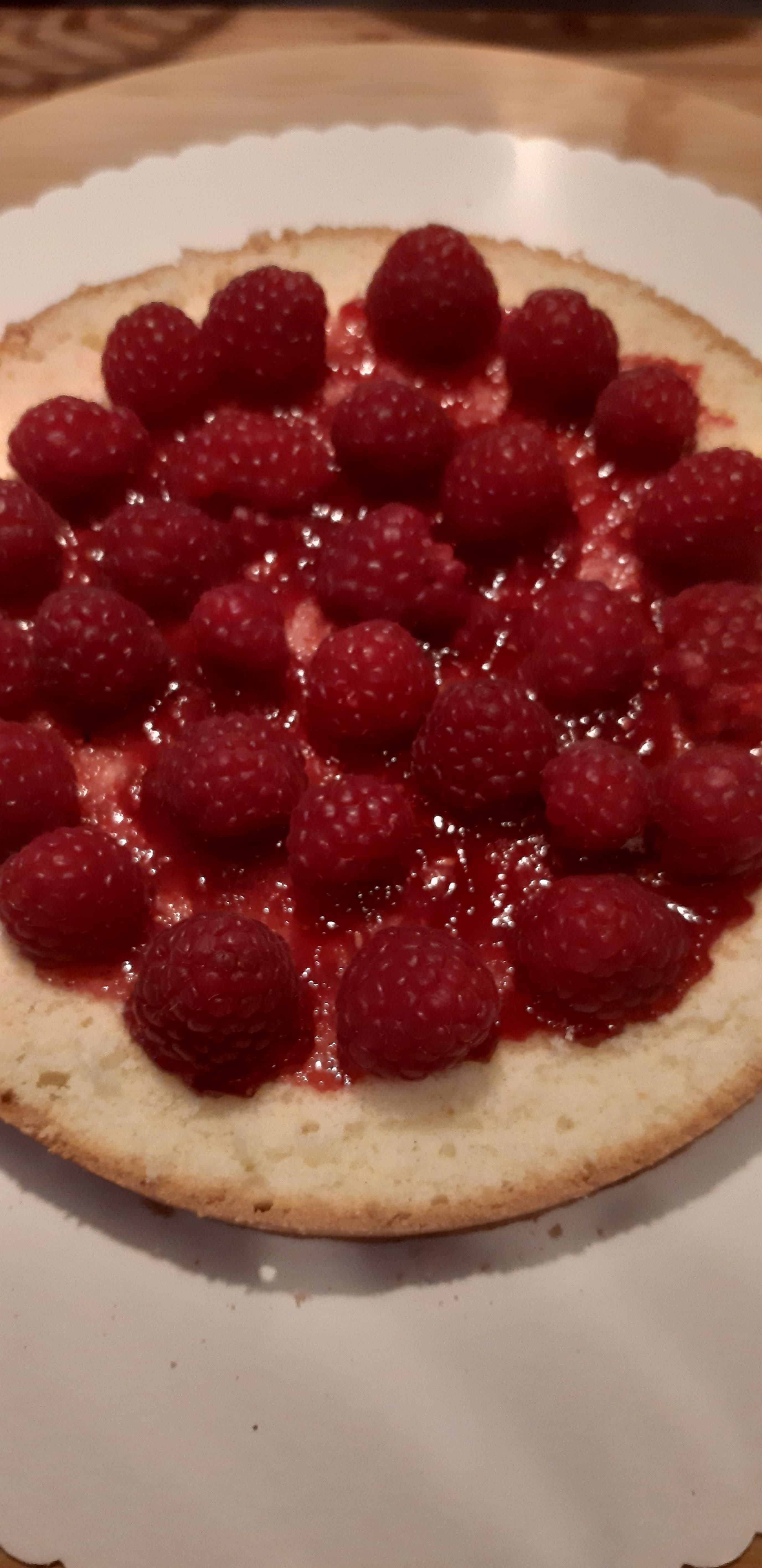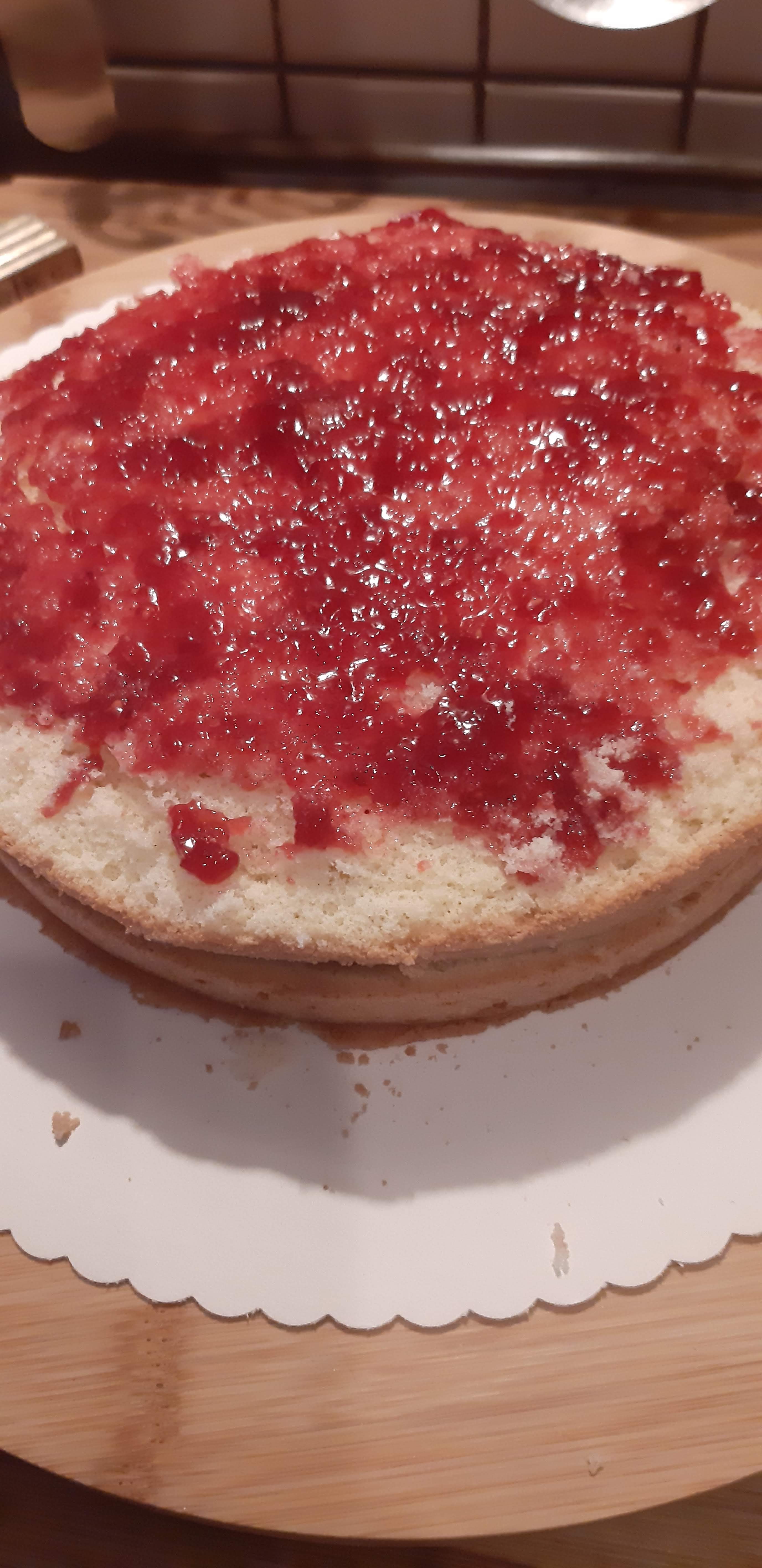 - Първия и най-долен блат намазах с половината разбит конфитюр, като оставях около 1 см от блата без да е намазан.