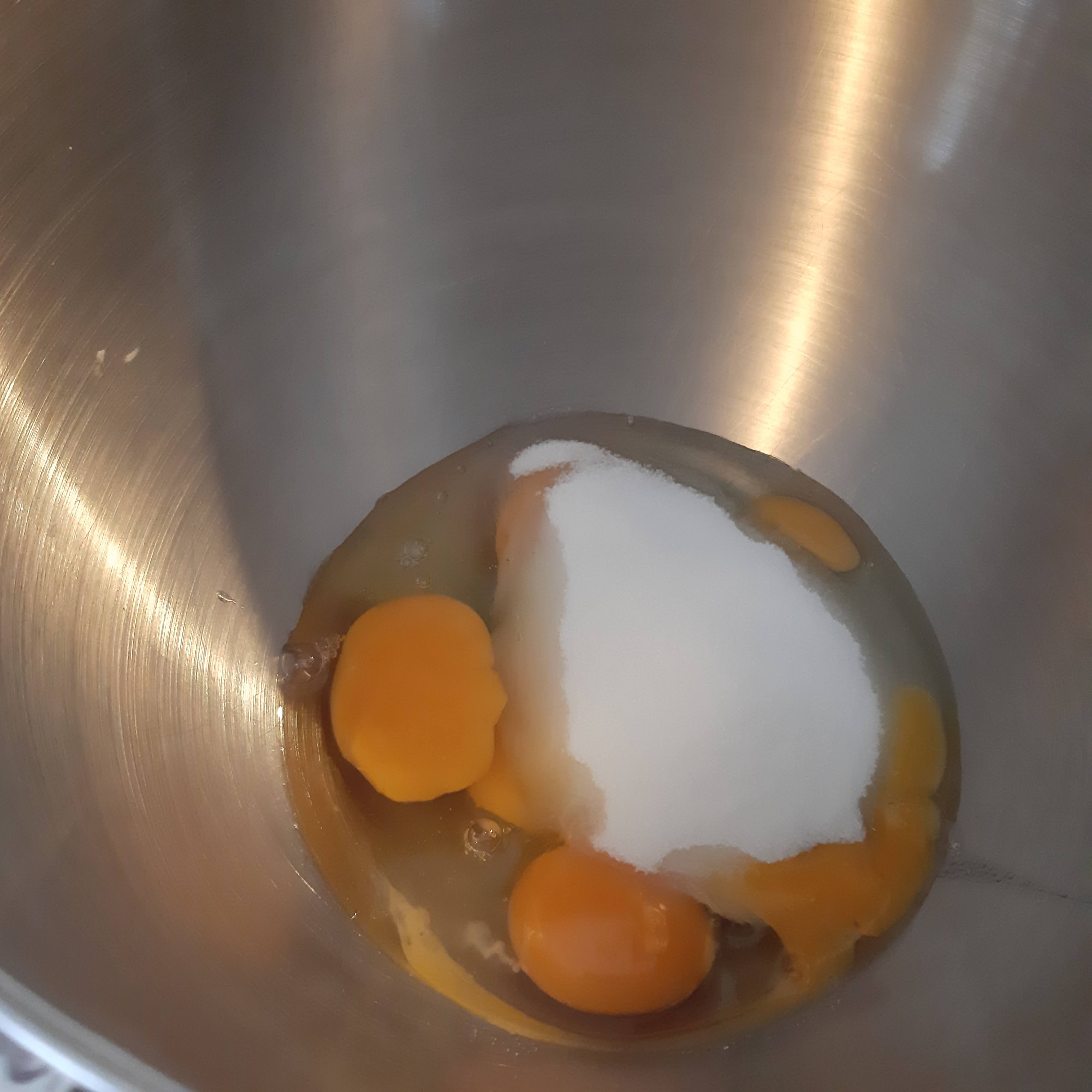 - В купата на миксера смесвам яйцата, захарта и солта за блата.