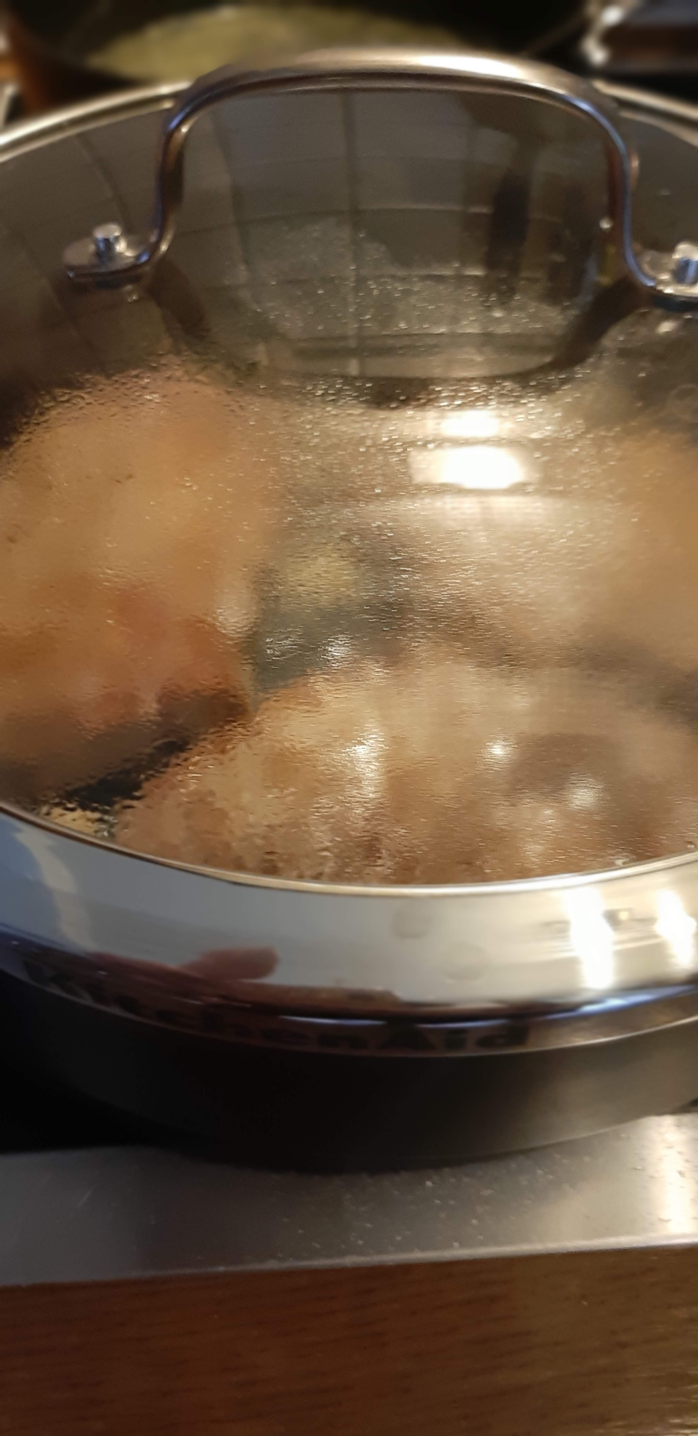 - Връщам пържолите при чесъна, намалявам котлона на 2 степен от 9 и похлупвам.