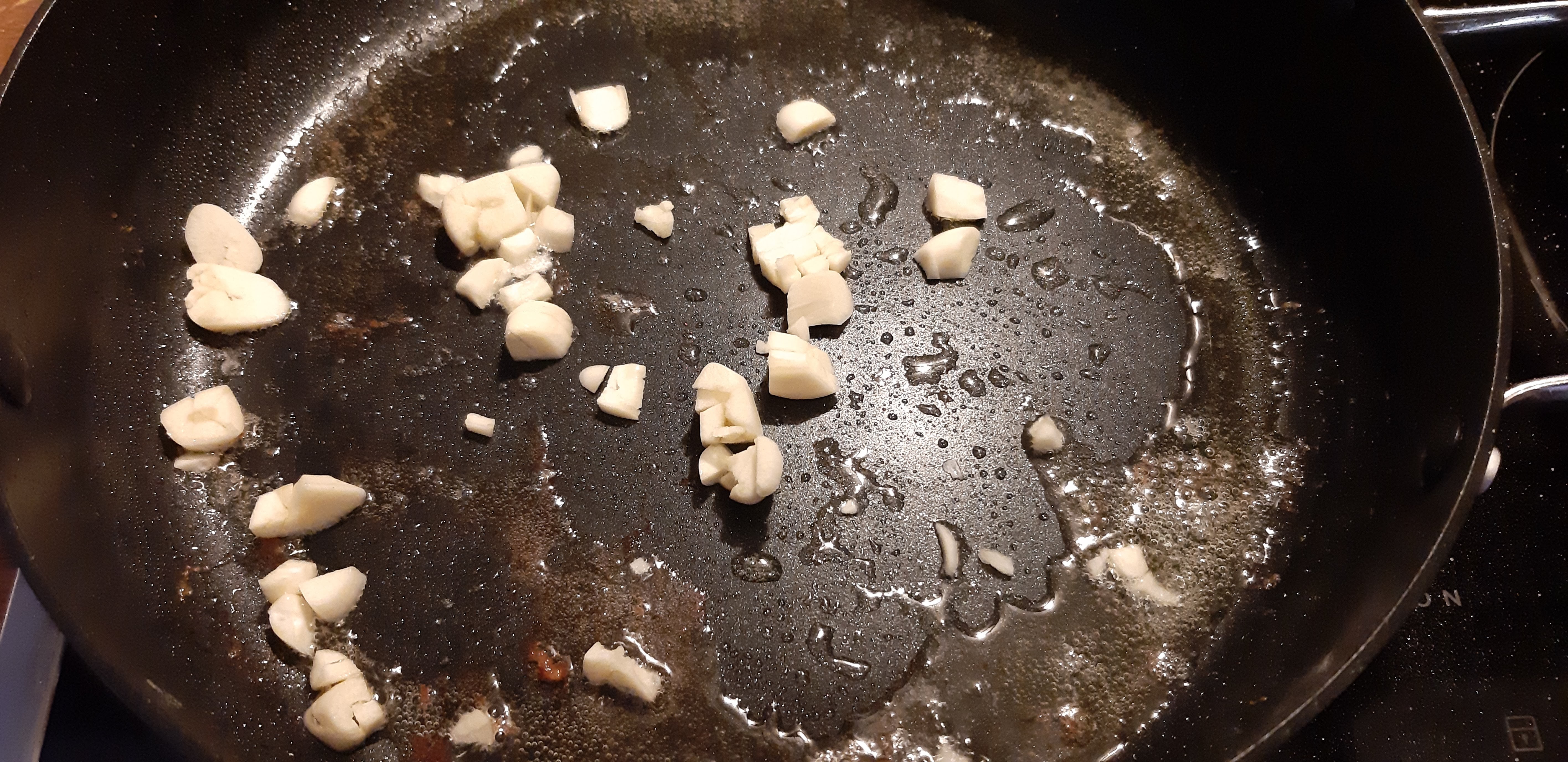 - Намалявам котлона на средна мощност и изпържвам за около минута няразаните скилидки чесън.